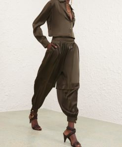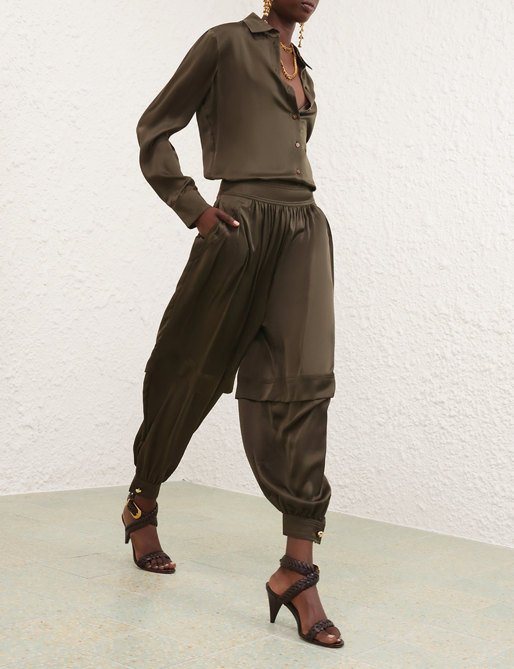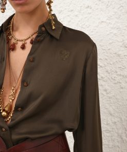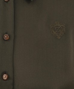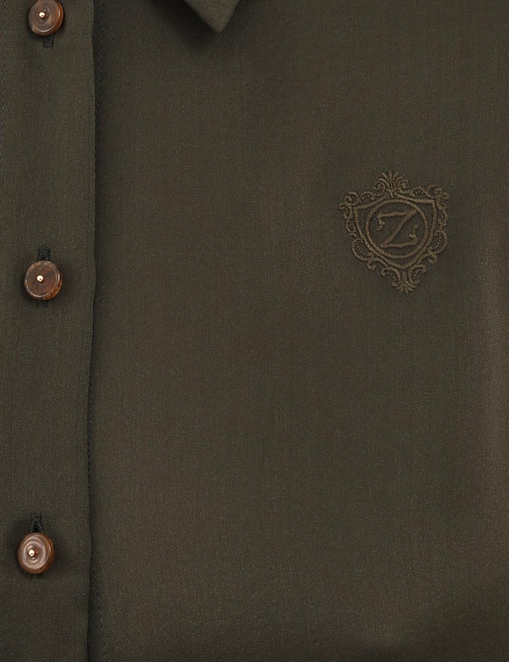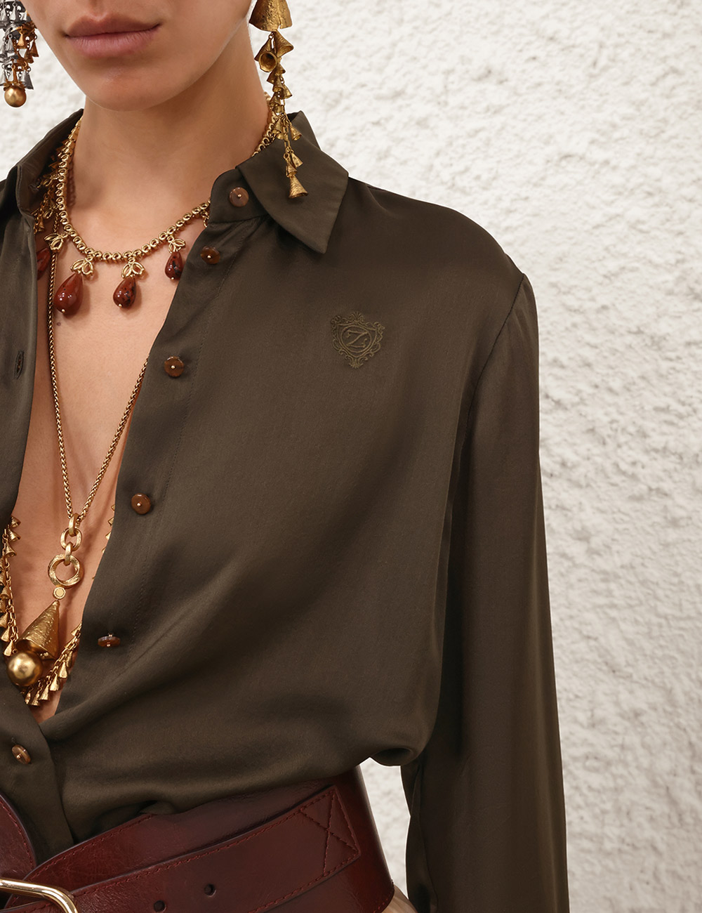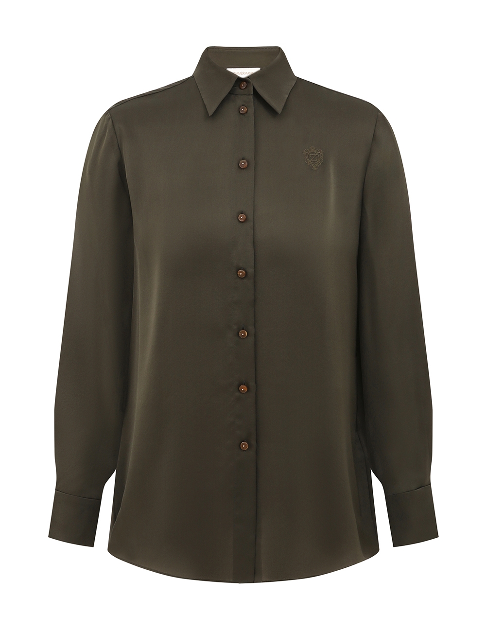 The Hypnotic Satin Shirt in Olive from our Fall 2025 Collection, Hypnotic. A silk shirt featuring long sleeves, embroidery detailing and a classic collar. 100% silk fabric, relaxed silhouette style shirt, buttons down the centre front and on the cuffs, embroidery detail on the breast, gathers on sleeves into cuffs, pleat detail at back yoke