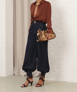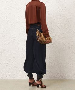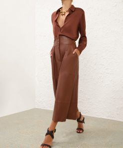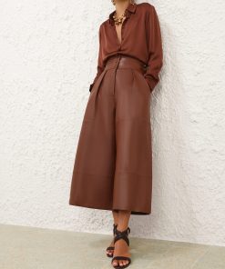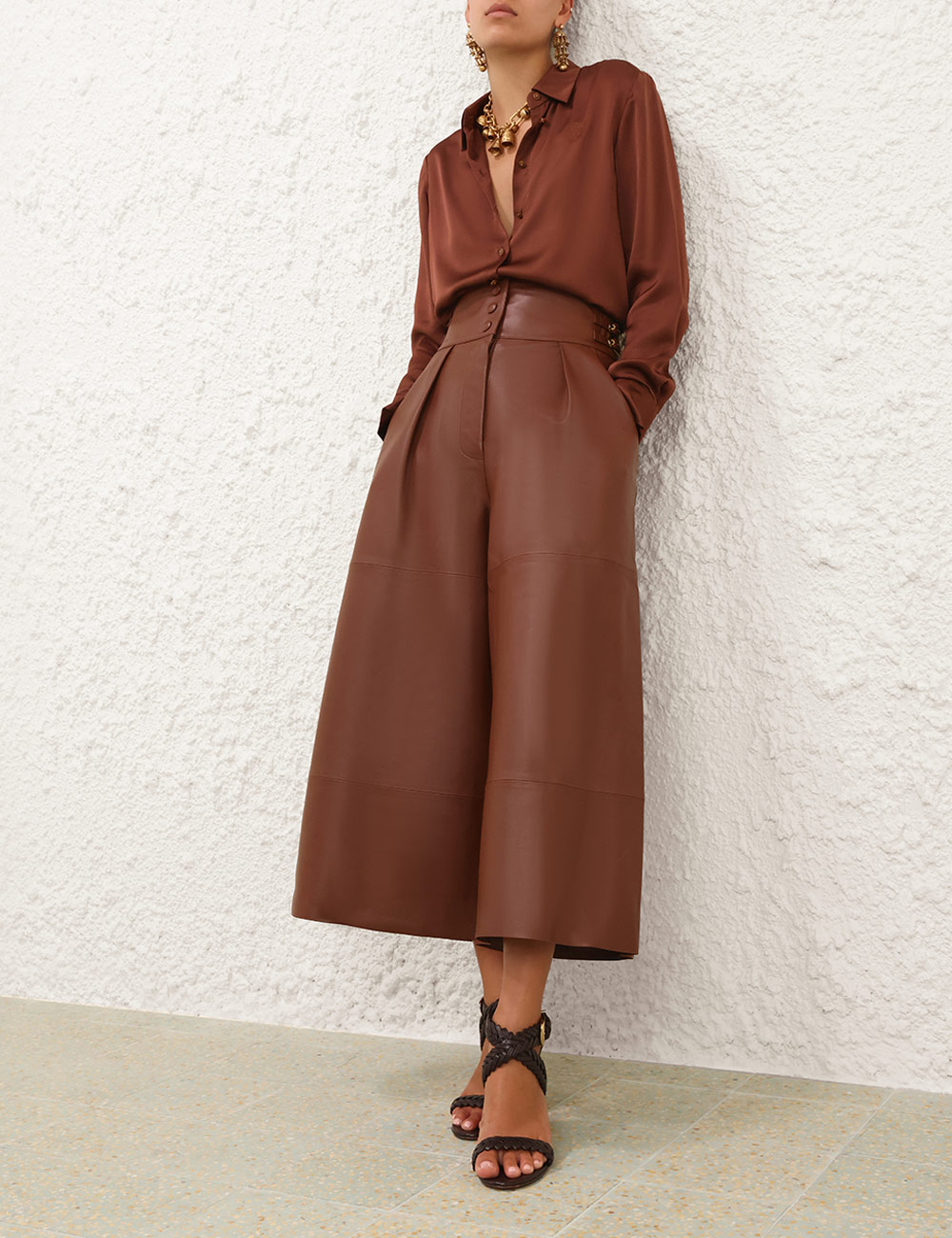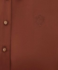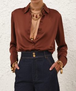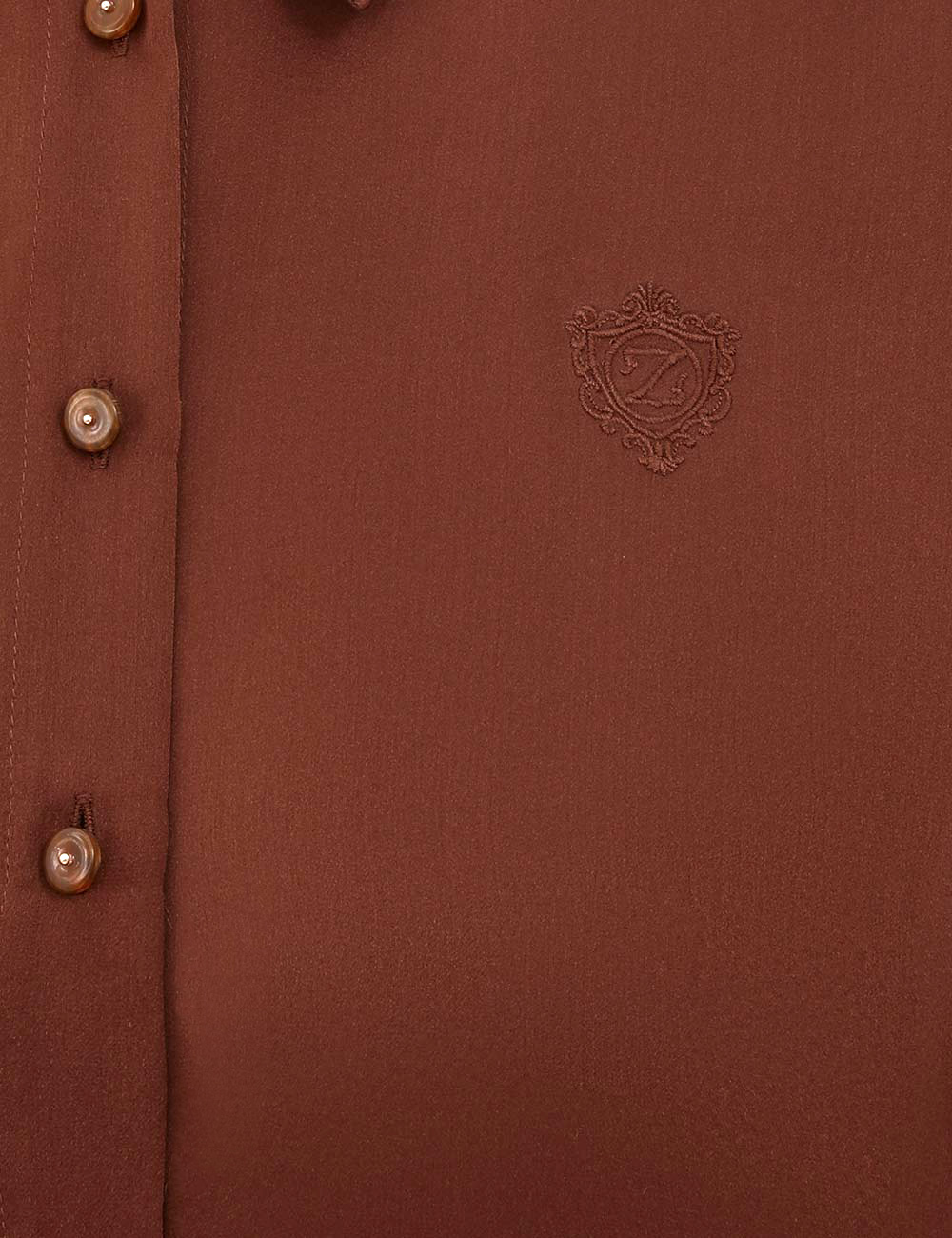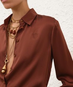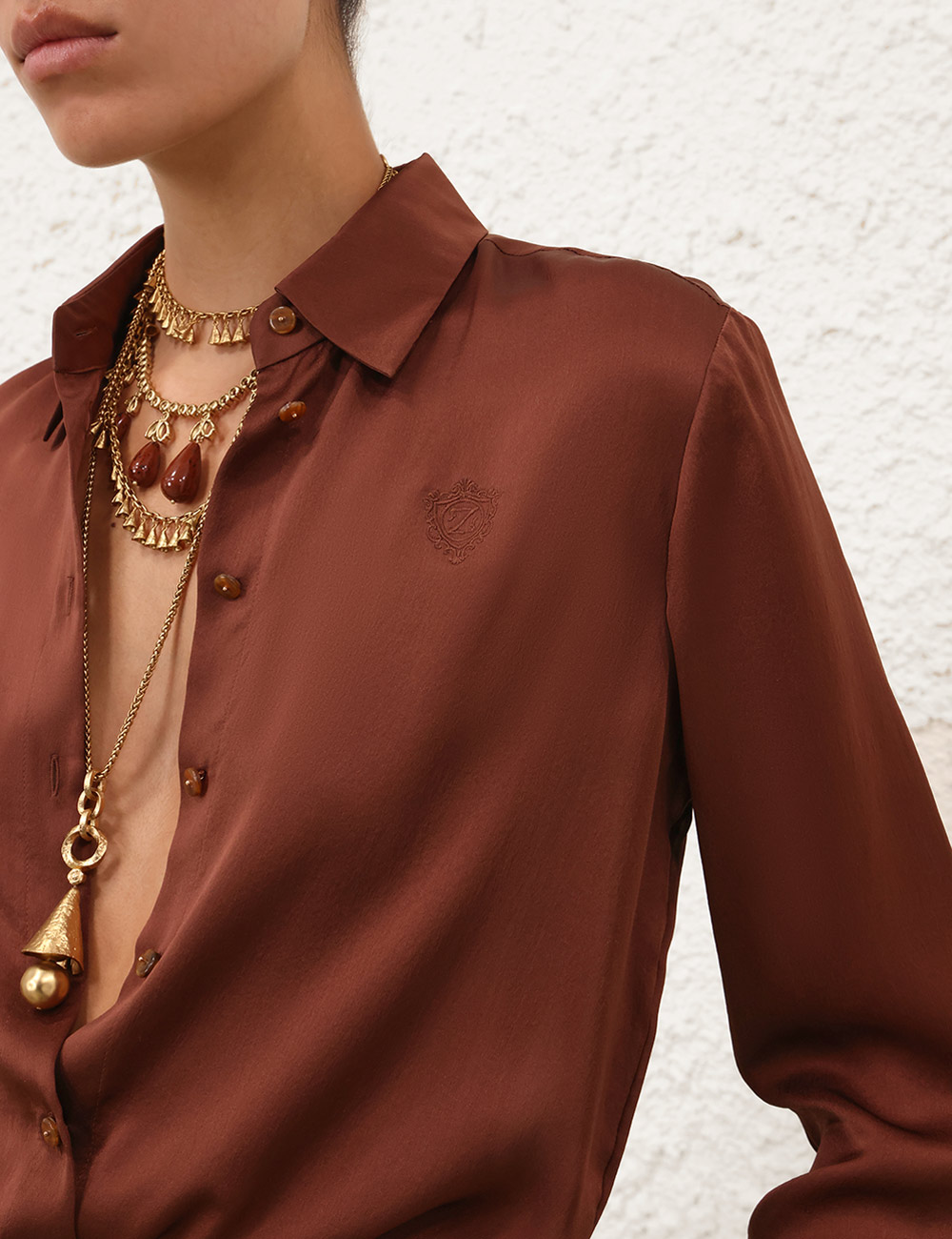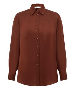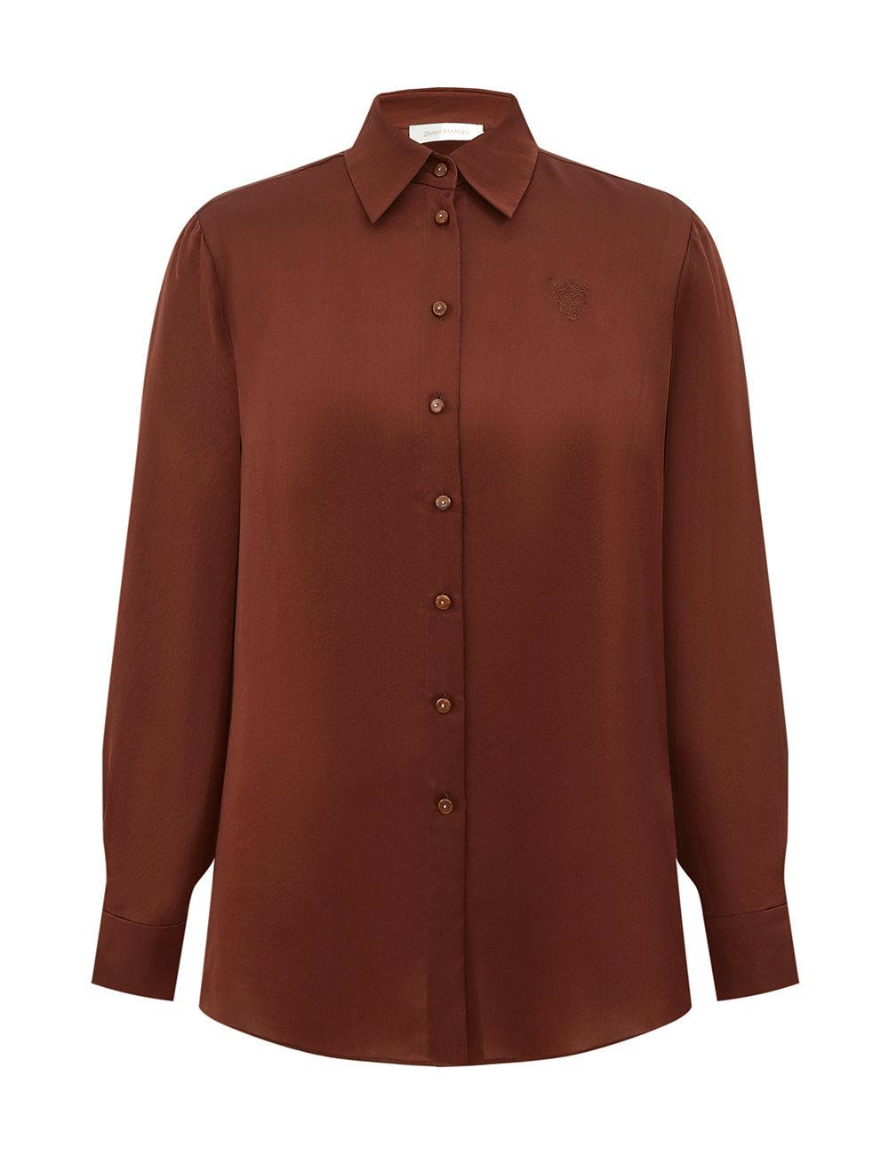 The Hypnotic Satin Shirt in Tan from our Fall 2025 Collection, Hypnotic. A silk shirt featuring long sleeves, embroidery detailing and a classic collar. 100% silk fabric, relaxed silhouette style shirt, buttons down the centre front and on the cuffs, embroidery detail on the breast, gathers on sleeves into cuffs, pleat detail at back yoke