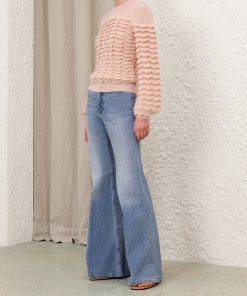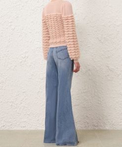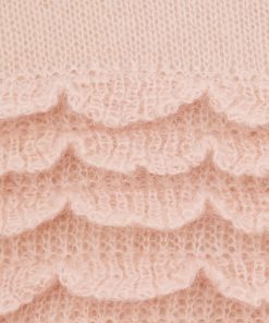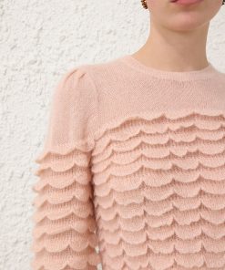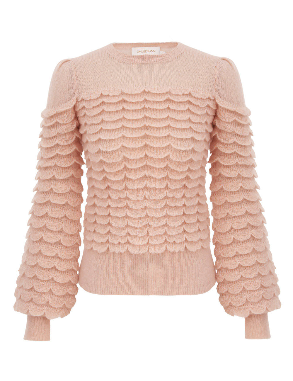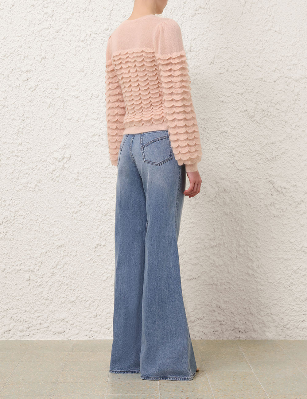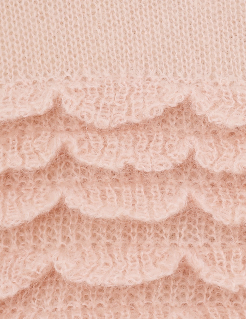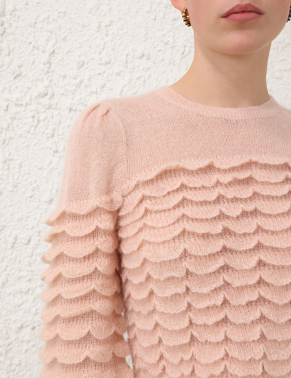 The Hypnotic Scallop Sweater in Light Pink from our Fall 2025 Collection, Hypnotic. A long sleeve mohair blend sweater featuring a rounded neckline, softly gathered shoulders and tiered scalloped detailing across the body and sleeves. mohair blend knit, round neckline with subtle shoulder gathers, tiered scalloped detailing across front, back and sleeves, ribbed cuffs and hem