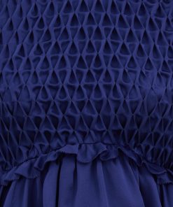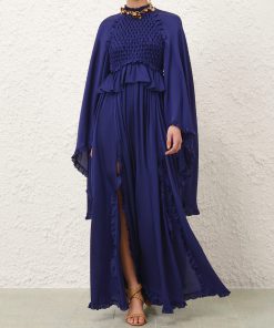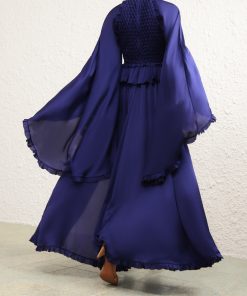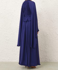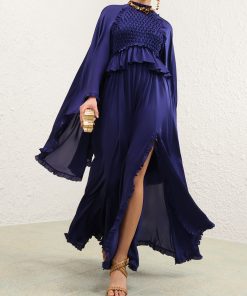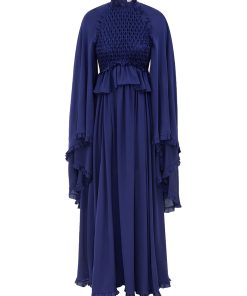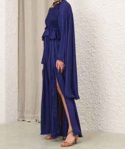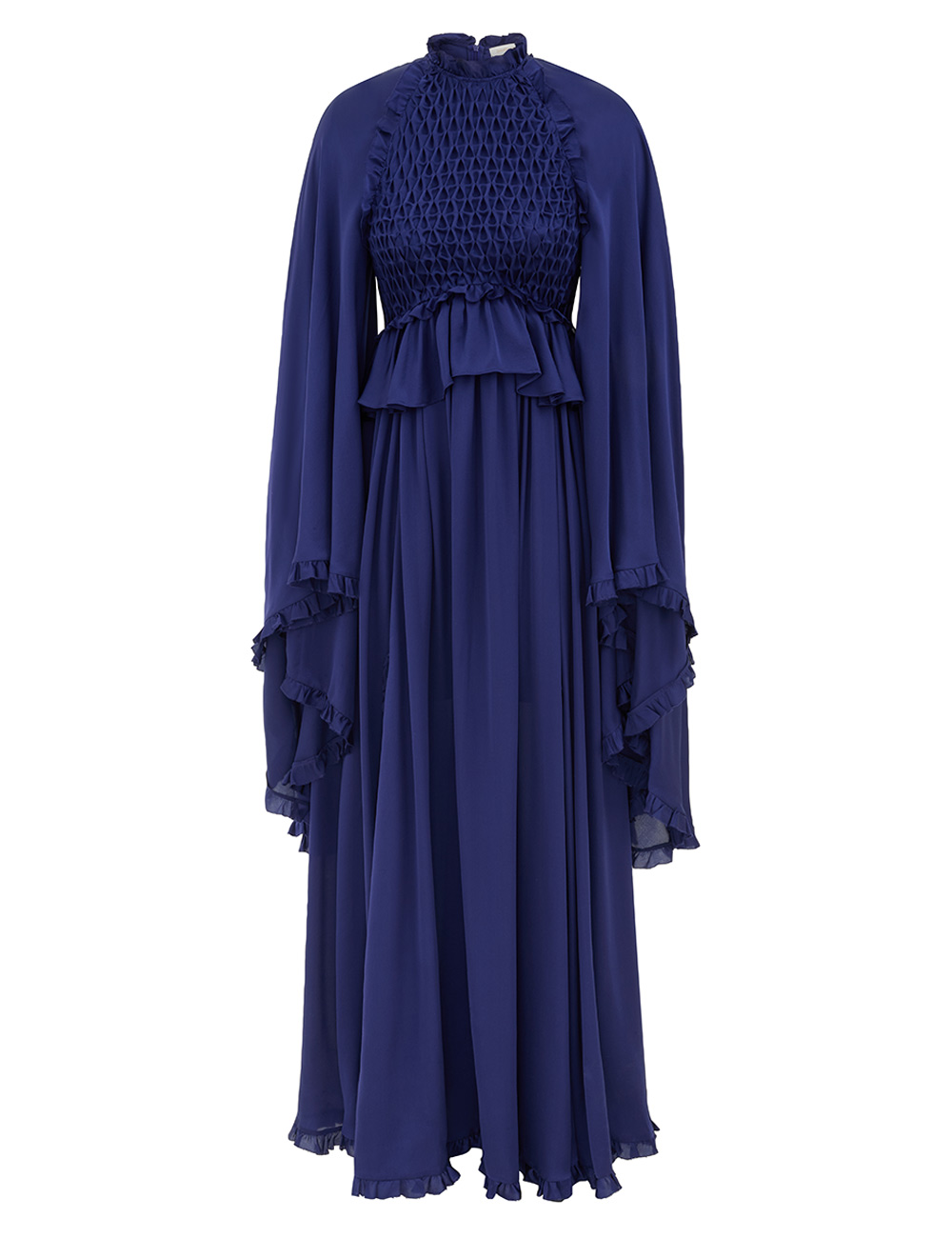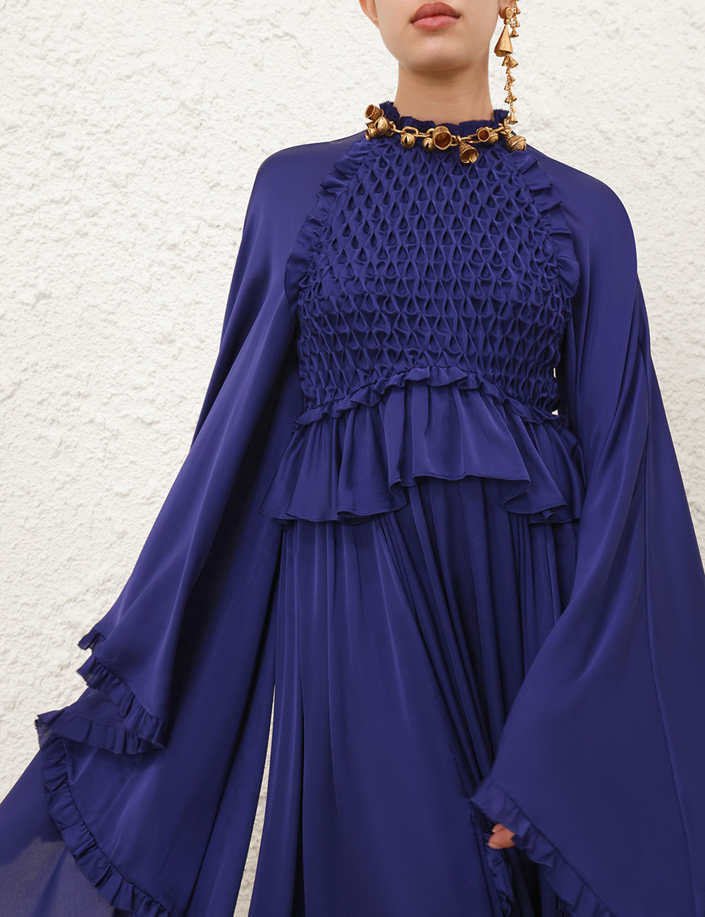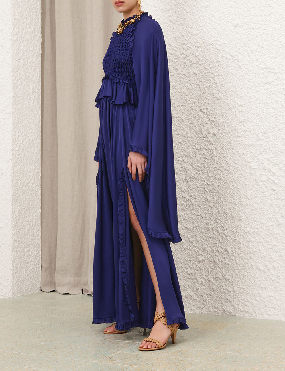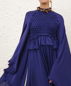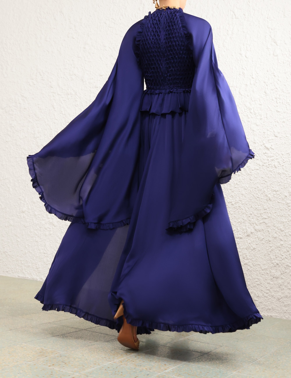 The Hypnotic Smocked Flutter Dress in Royal Blue from our Fall 2025 Collection, Hypnotic. A silk satin maxi dress featuring a smocked bodice, exaggerated long sleeves, and frill detailing throughout. 100% silk fabric, high neck with frill, peplum style bodice, gathered frills along cuffs and hem, front skirt splits, invisible zip at centre back