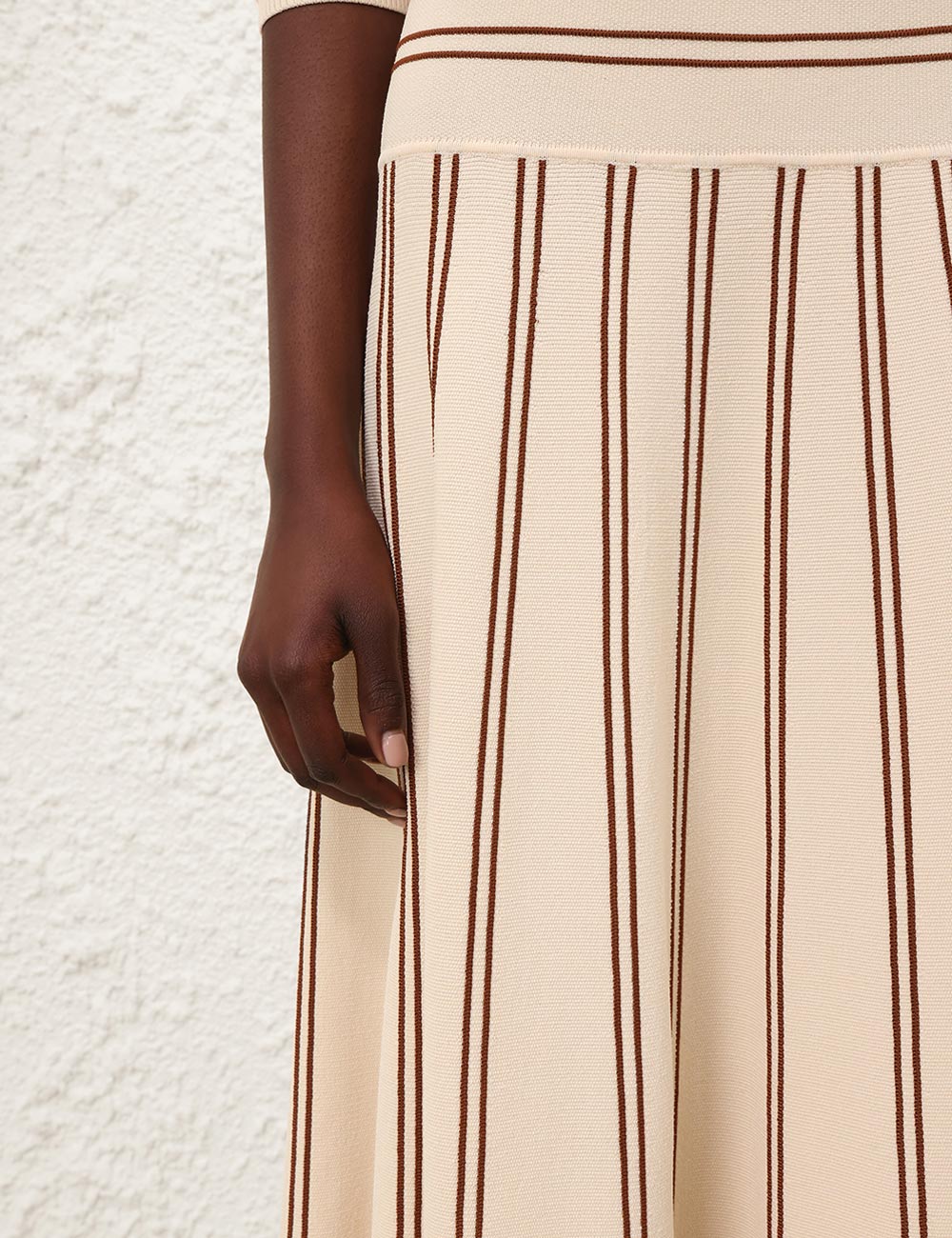 The Hypnotic Stripe Midi Skirt in Cream/Tan from our Fall 2025 Collection, Hypnotic. A knit midi skirt featuring contrast stripes, a thick elasticated waistband and a soft A-line silhouette.elasticated, mid-rise waist, slip on style, stripe pattern