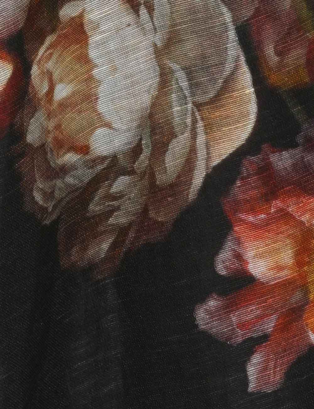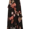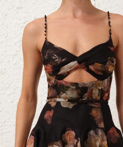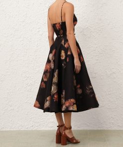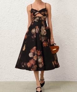 The Hypnotic Twist Midi Dress in Russet Floral from our Fall 2025 Collection, Hypnotic. A silk linen organza midi dress featuring a sweetheart neckline, twisted detailing at the centre bust with a cutout underneath and a full flared skirt.removable skinny bow belt, adjustable rouleau straps, centre back shirring with invisible zip closure, side seam pockets, corset-style bodice with cutout detail