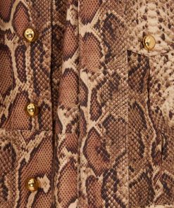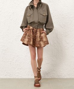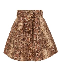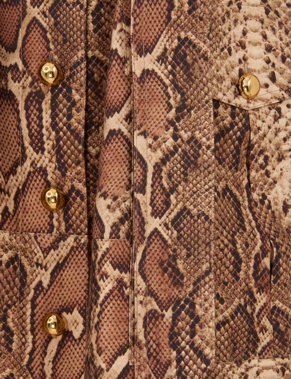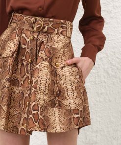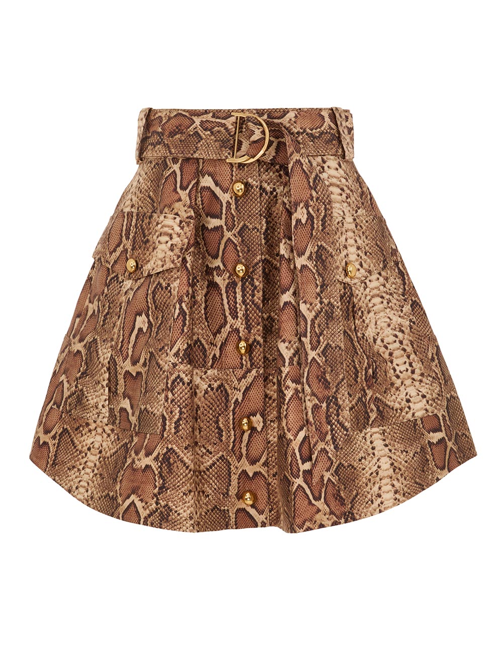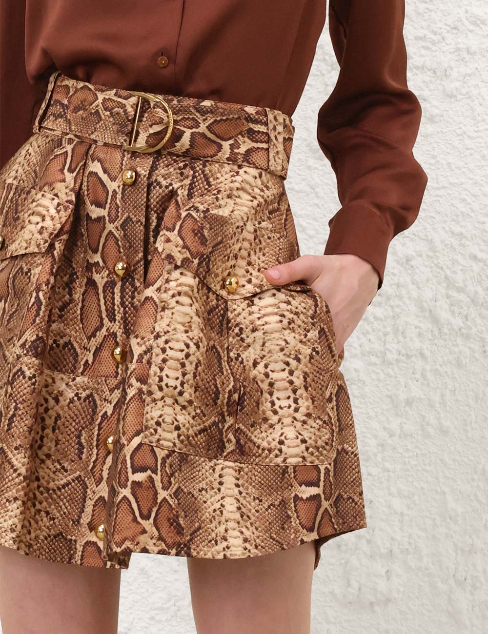 The Hypnotic Utility Mini Skirt in Toffee Snake from our Fall 2025 Collection, Hypnotic. A silk blend mini skirt featuring a removable D-ring waist belt and functional front patch pockets.silk cotton mini skirt, utility silhouette, button closure down the centre front, adjustable d-ring belt, functional side patch pockets, topstitching throughout, asymmetrical hem, partially lined