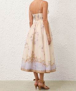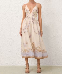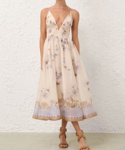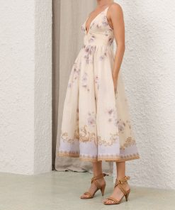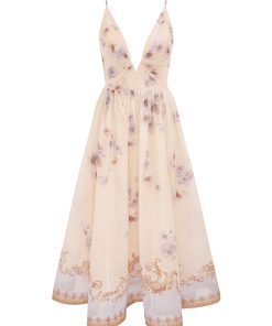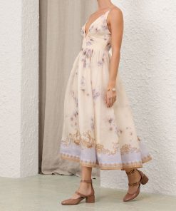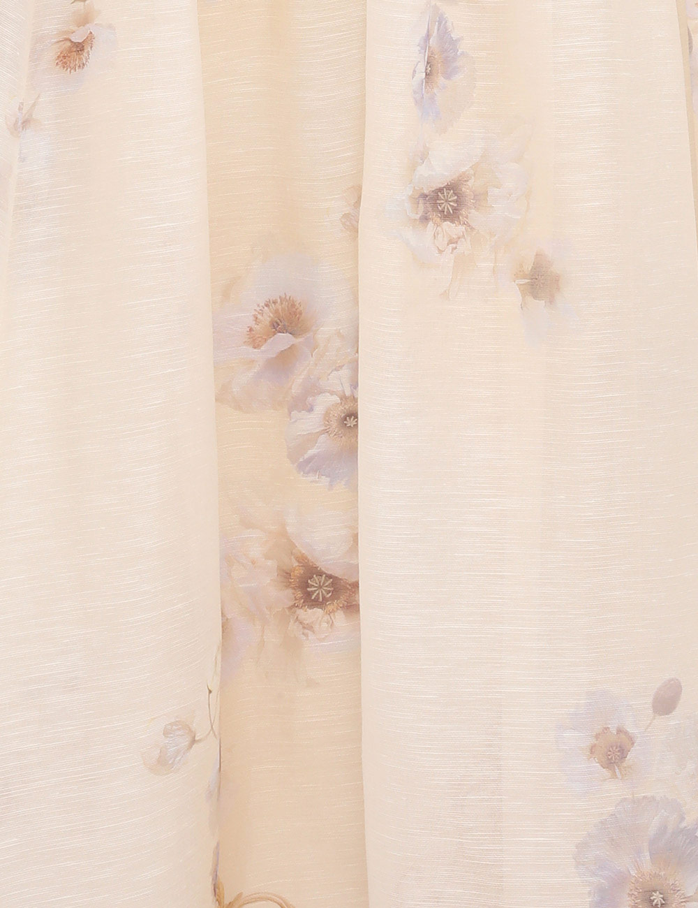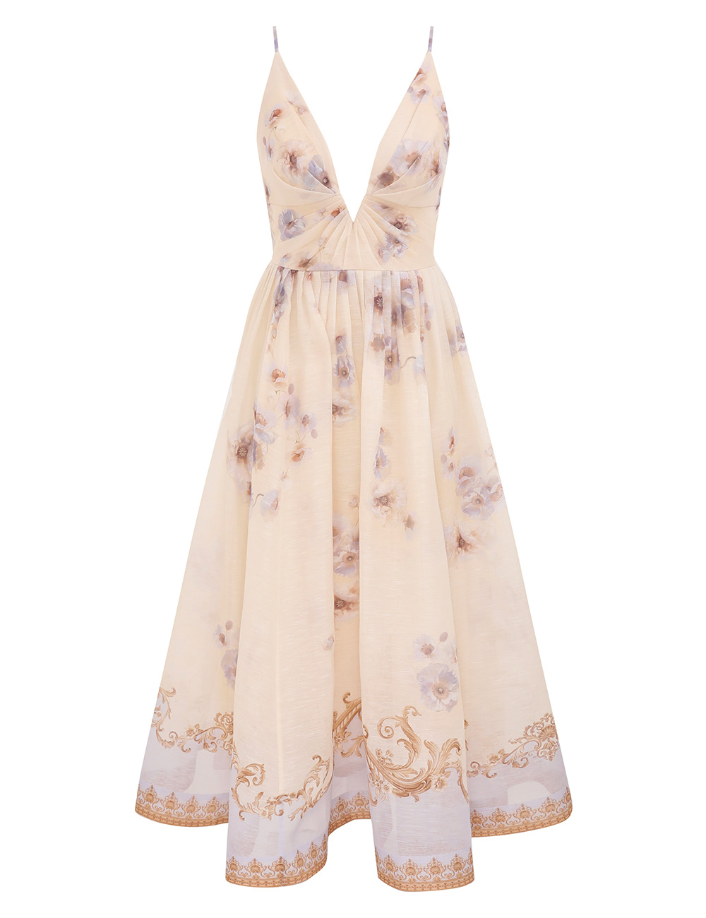 The Hypnotic V Neck Midi Dress in Blue Floral from our Fall 2025 Collection, Hypnotic. A silk linen midi dress featuring a fitted bodice, a plunging V-neckline and a gathered waist skirt.silk linen midi dress, v-wire at centre bust with boning along side seams, centre back shirring with zip closure, adjustable straps, skirt is lined