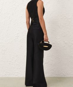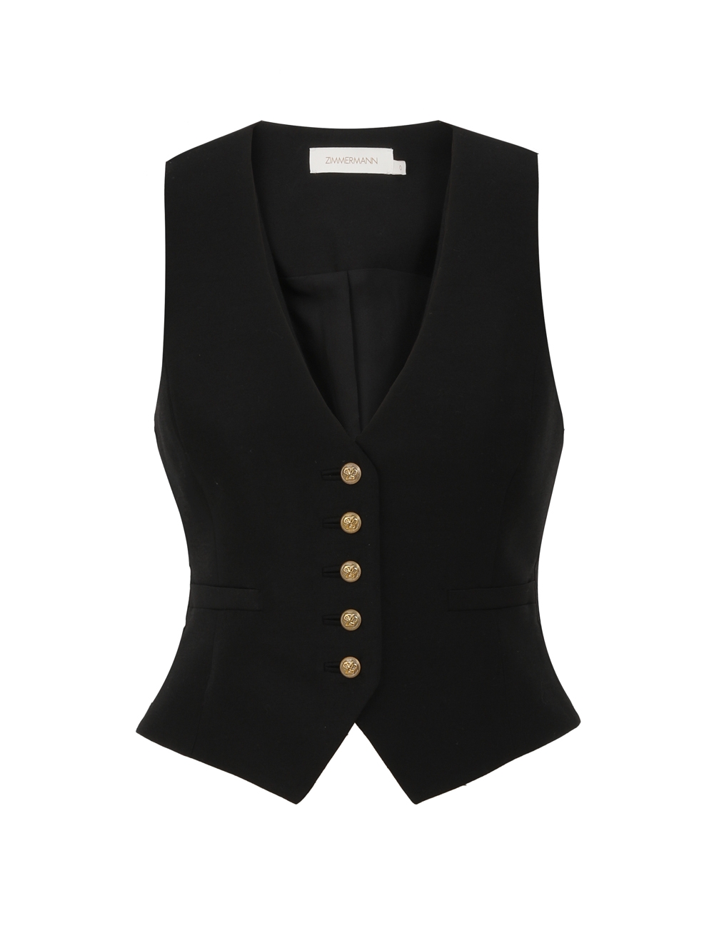 The Hypnotic Waistcoat in Black from our Fall 2025 Collection, Hypnotic. A tailored wool blend waistcoat featuring a deep V-neckline, mock pockets and a button down front. wool blend waistcoat, notched hem at front and back, back buckle strap, mock welt pockets on both sides, buttons down the centre front, fully lined