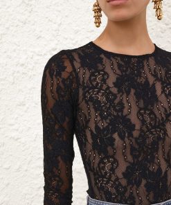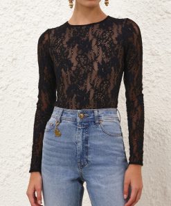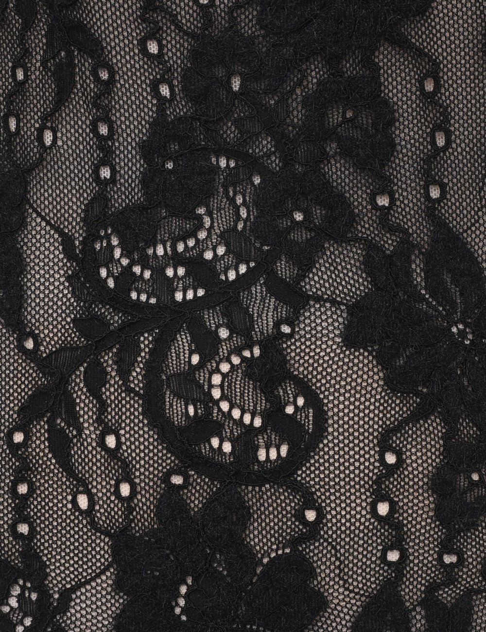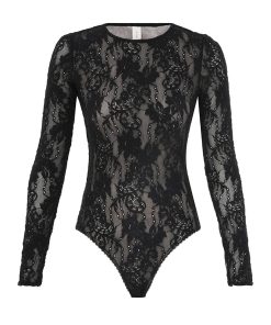 The Lace Bodysuit in Black from our Fall 2025 Collection, Hypnotic. A lace bodysuit featuring a crew neck, long sleeves and mesh lining. stretch lace bodysuit, long sleeves, mesh lining, gusset snap fastening, jelly tape inserted
