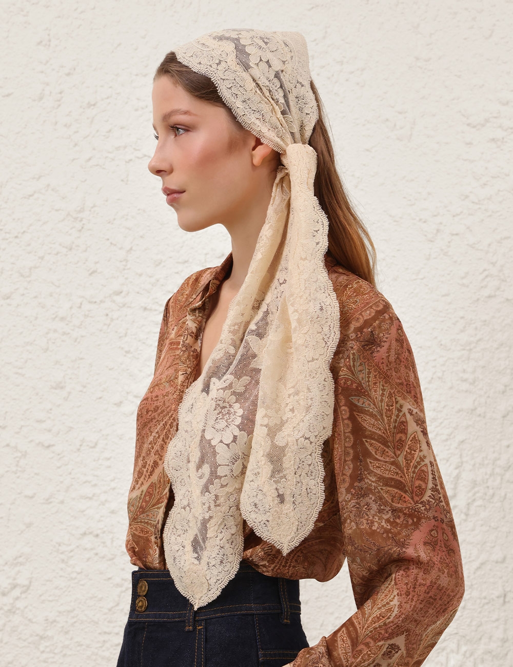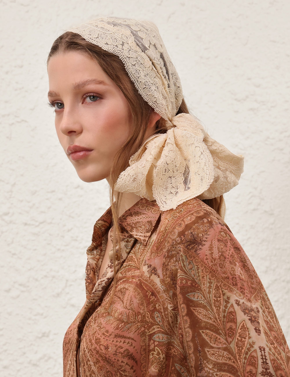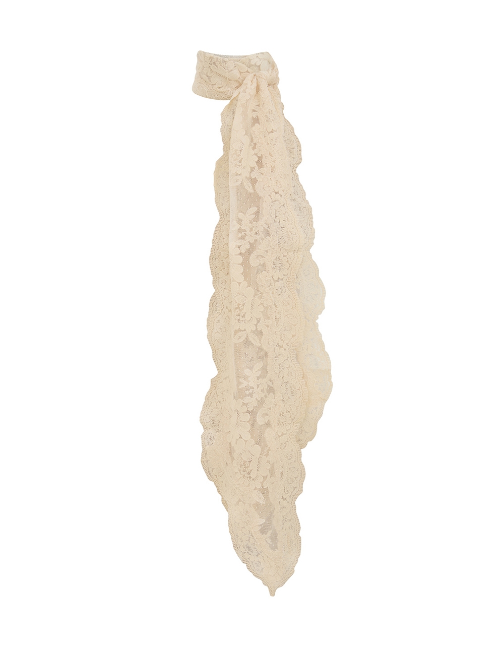 The Lace Neck Scarf in Cream from our Fall 2025 Collection, Hypnotic. A skinny scarf featuring intricate lace detailing throughout.slim silhouette scarf, intricate lace detailing