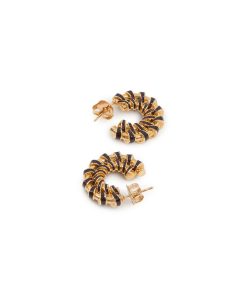 The Loom Mini Hoops in Gold/Burgundy from our Fall 2025 Collection, Hypnotic. A gold plated statement earring featuring twisted brass detailing and a stud post back.12kt gold plated brass hoops, enamel detailing in deep burgundy hues, stud post back, sold as a pair