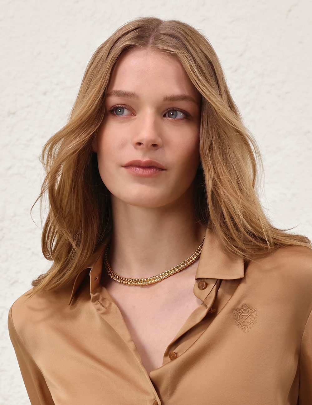 The Loom Necklace in Gold from our Fall 2025 Collection, Hypnotic. A gold plated chain necklace featuring twisted brass detailing throughout.12kt gold plated brass, custom seamless centre back clasp