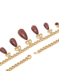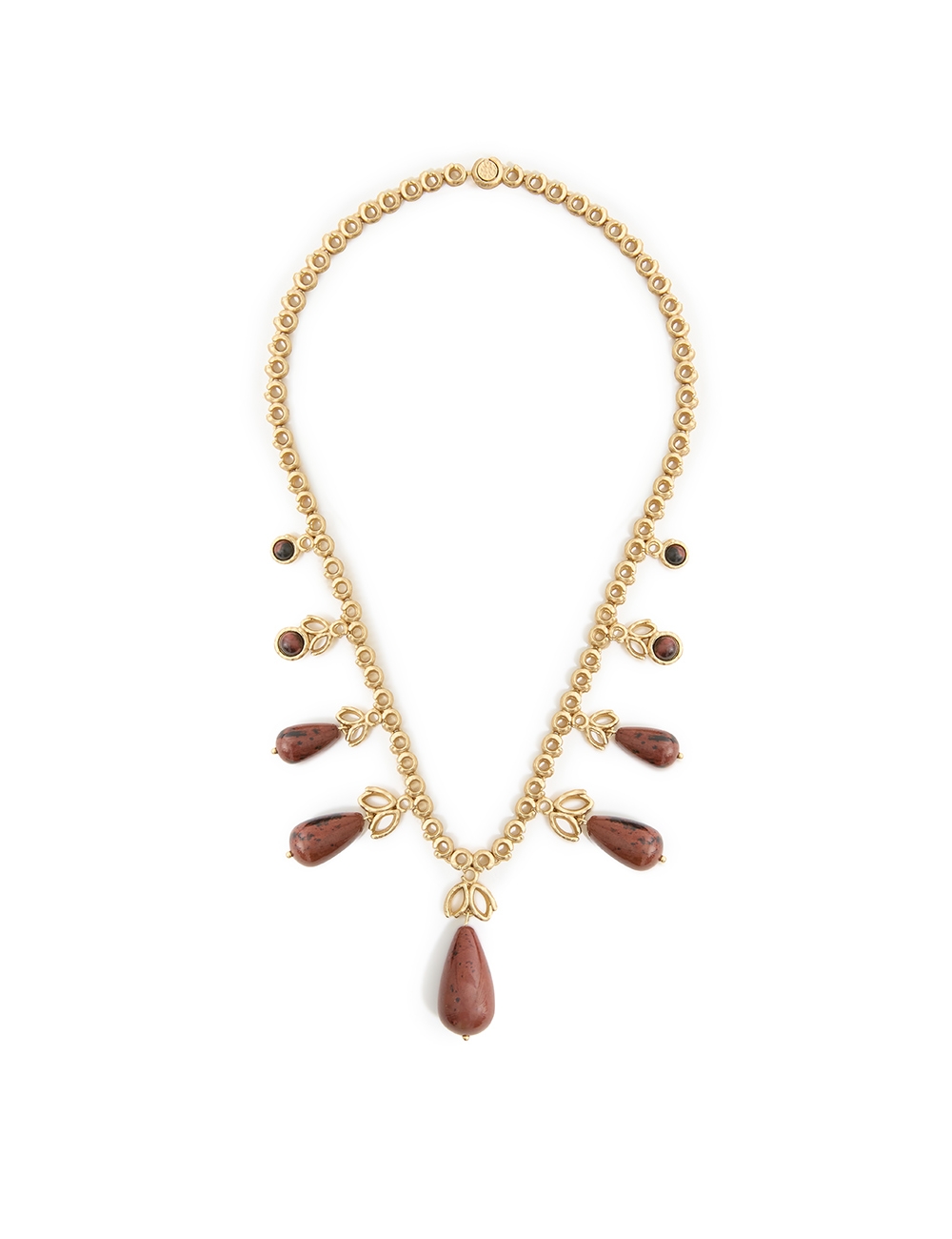 The Maisie Charm Necklace in Antique Gold from our Fall 2025 Collection, Hypnotic. A gold plated chain necklace featuring a natural Mahogany Obsidian stone detailing and a custom centre back clasp.14kt gold plated brass, natural mahogany obsidian stones, custom plating standard with raw brass castings finish, centre back clasp closure