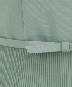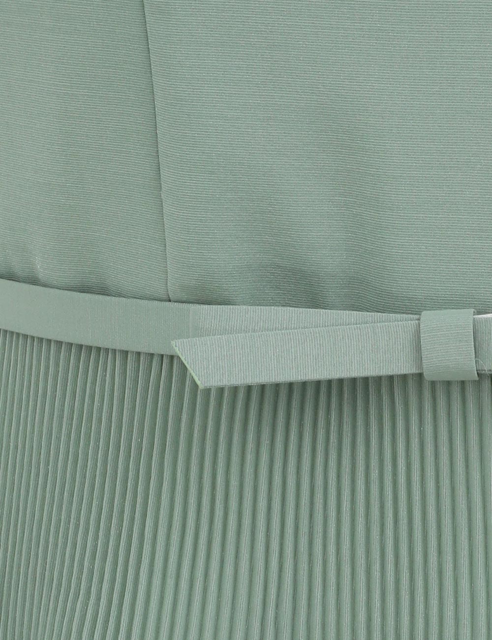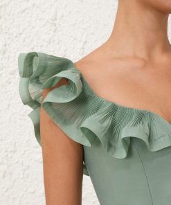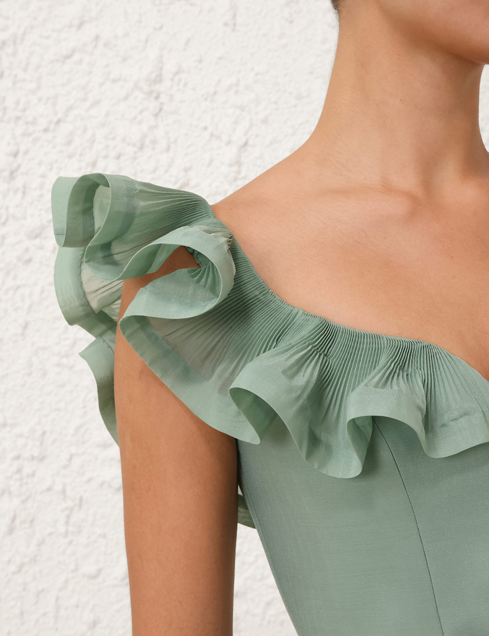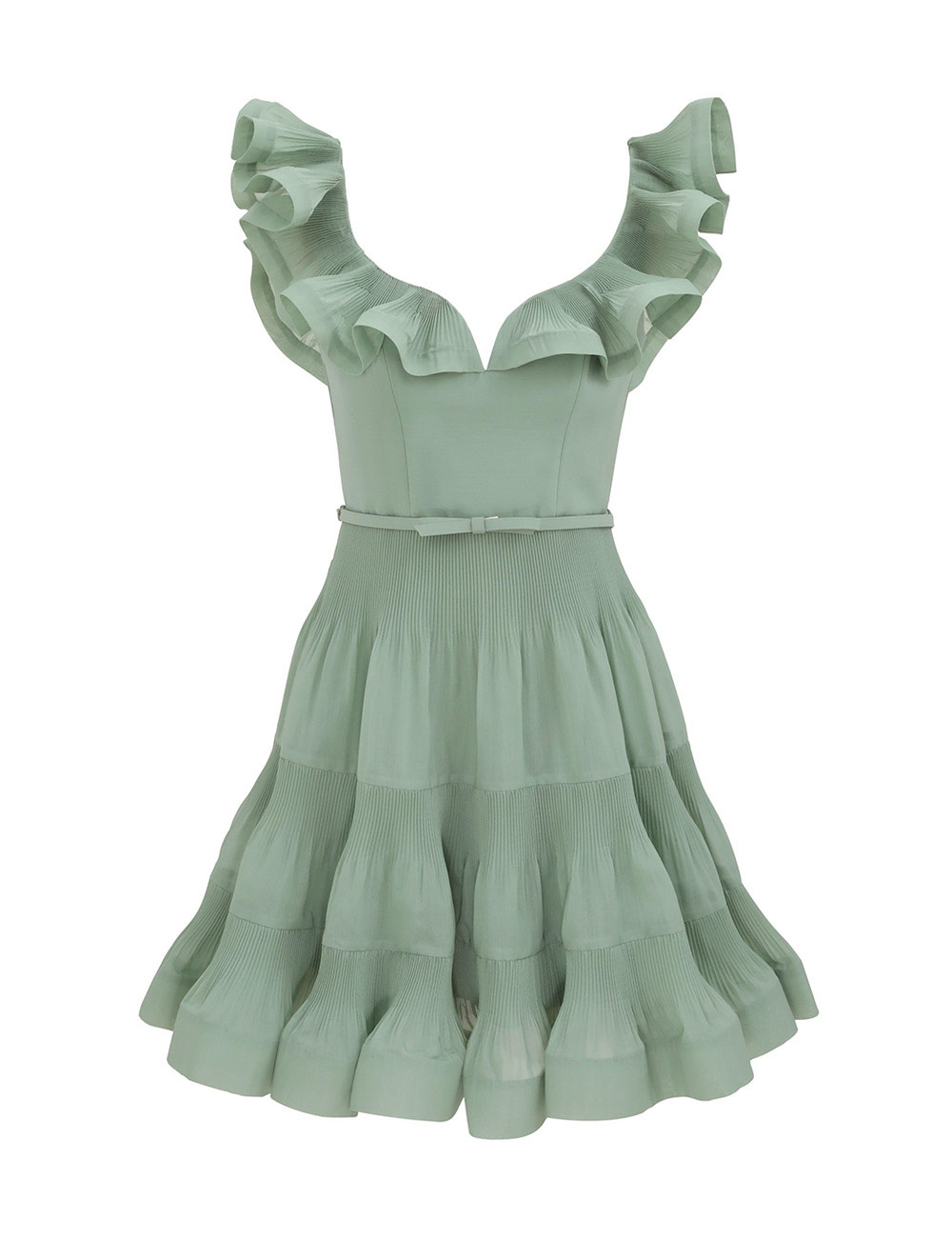 The Pleated Frill Mini Dress in Eucalyptus from our Fall 2025 Collection, Hypnotic. A mini dress featuring a sweetheart neckline with a plunging V-wire, frills on the shoulders and pleated skirt tiers.v-wire neckline, structured bodice with boning, invisible zip closure at centre back, tiered skirt with pleated detailing, removable bow belt, soft gathering throughout