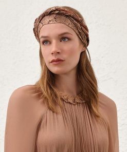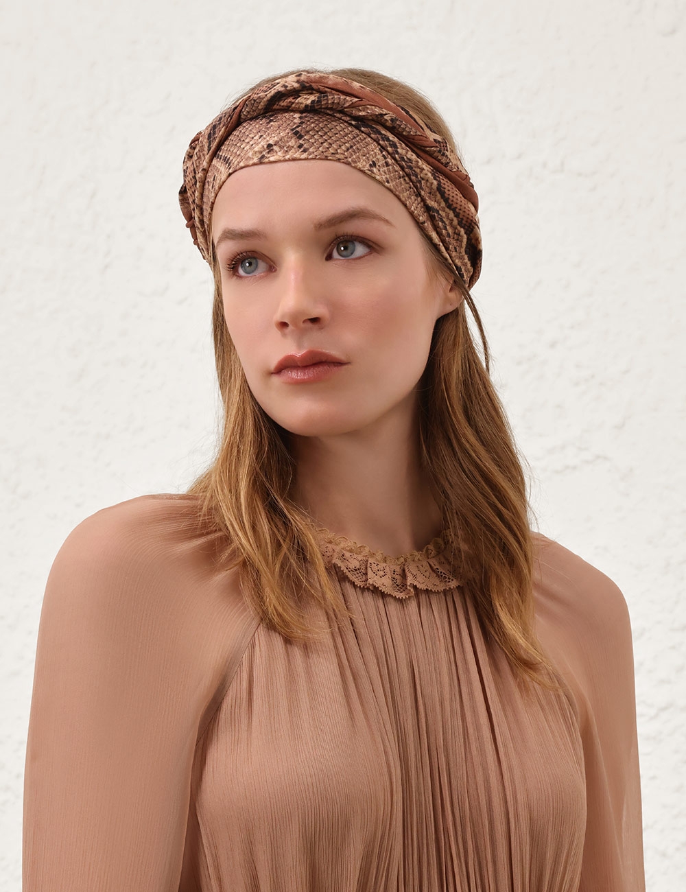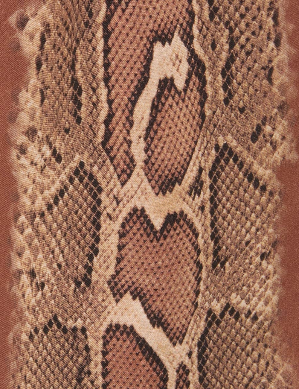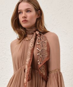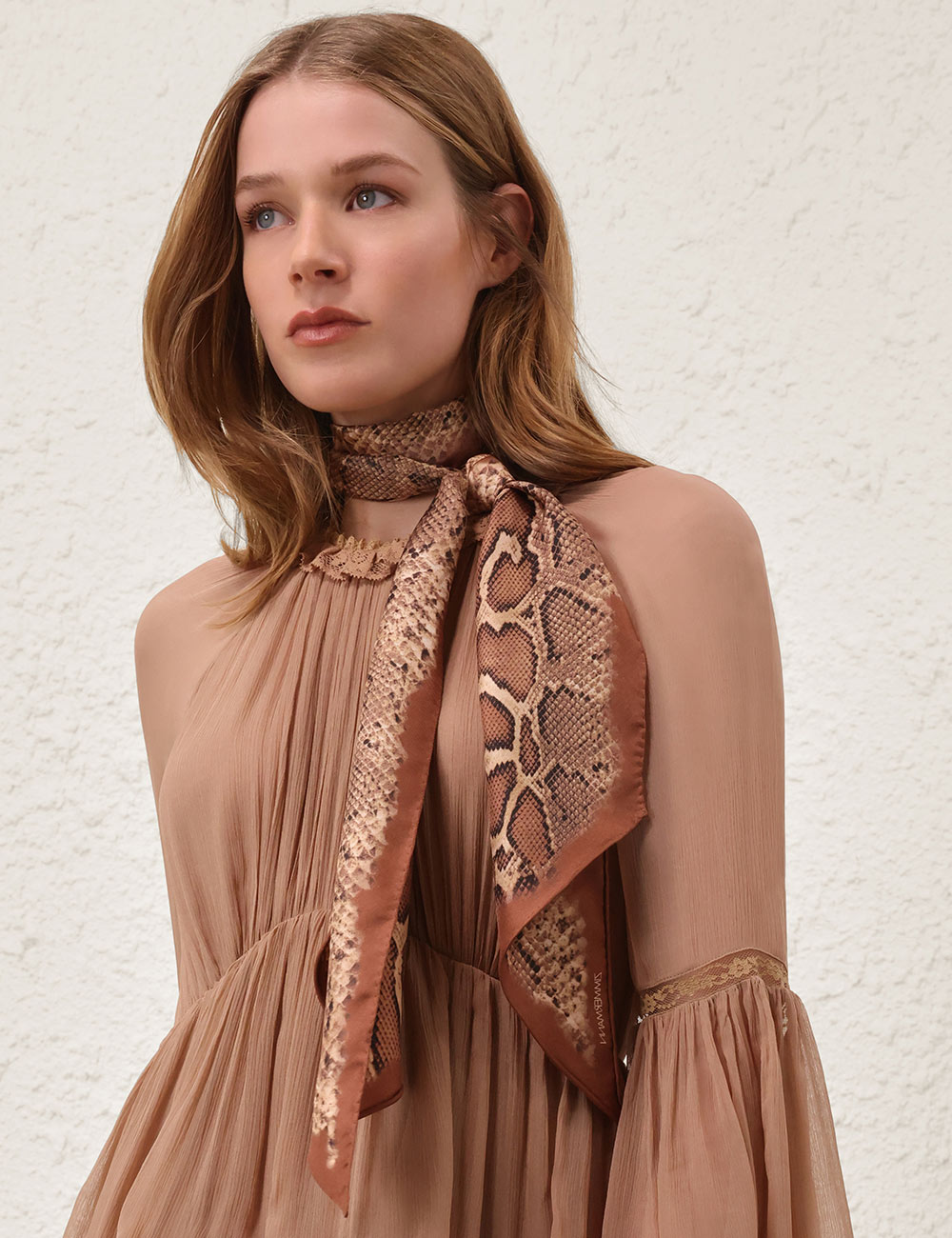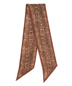 The Printed Silk Neck Scarf in Toffee Snake from our Fall 2025 Collection, Hypnotic. A silk neck scarf featuring a customised placement print and fine rolled hem. 100% silk fabric, placement printed neck scarf
