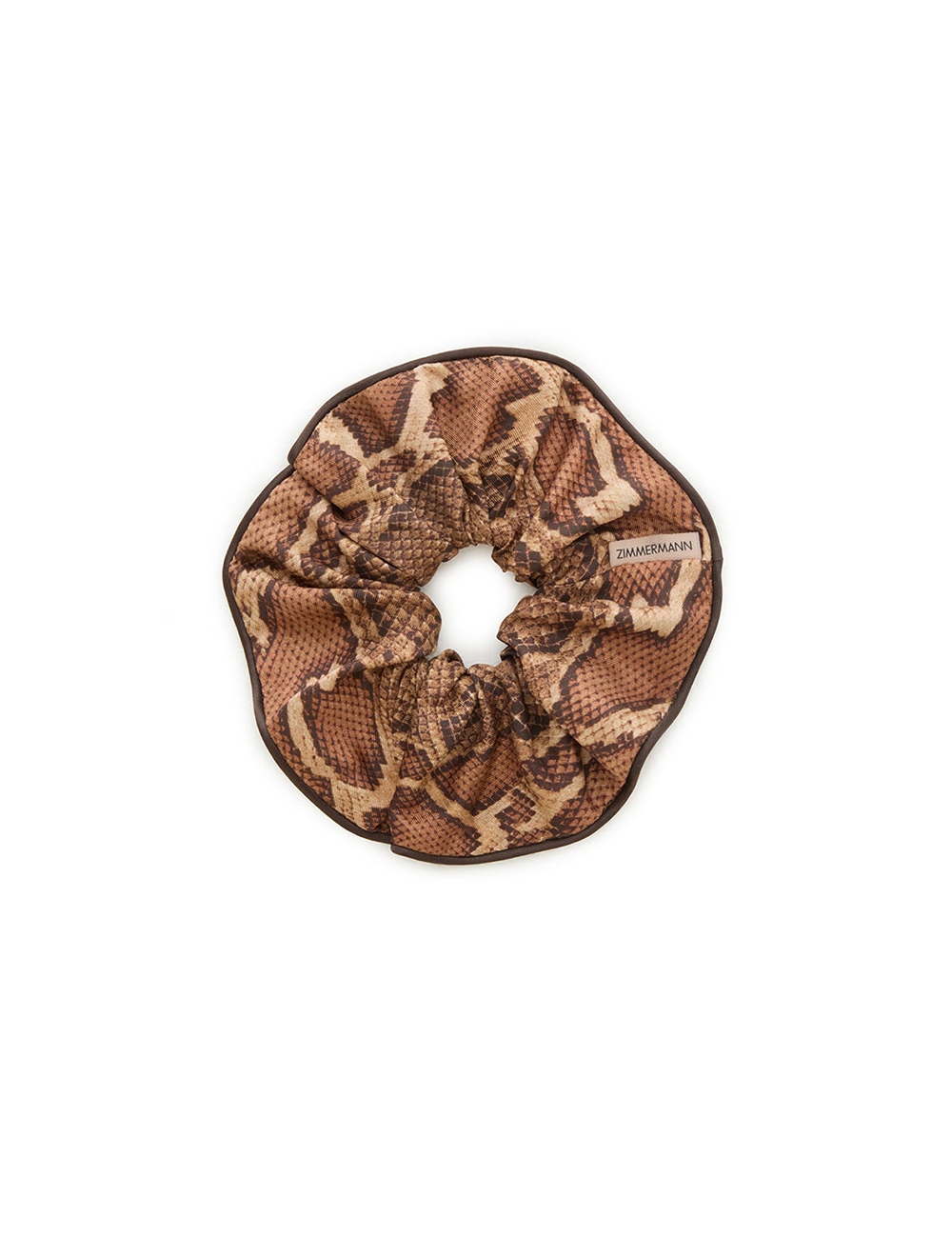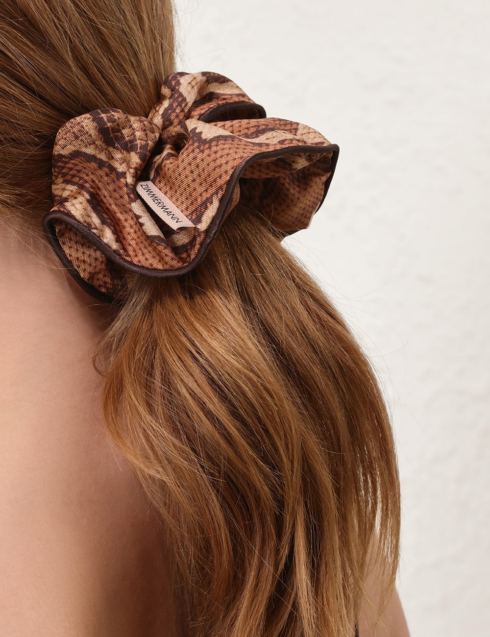 The Printed Silk Scrunchie in Toffee Snake from our Fall 2025 Collection, Hypnotic. A silk scrunchie featuring contrast piped edges. silk scrunchie, internal elastic