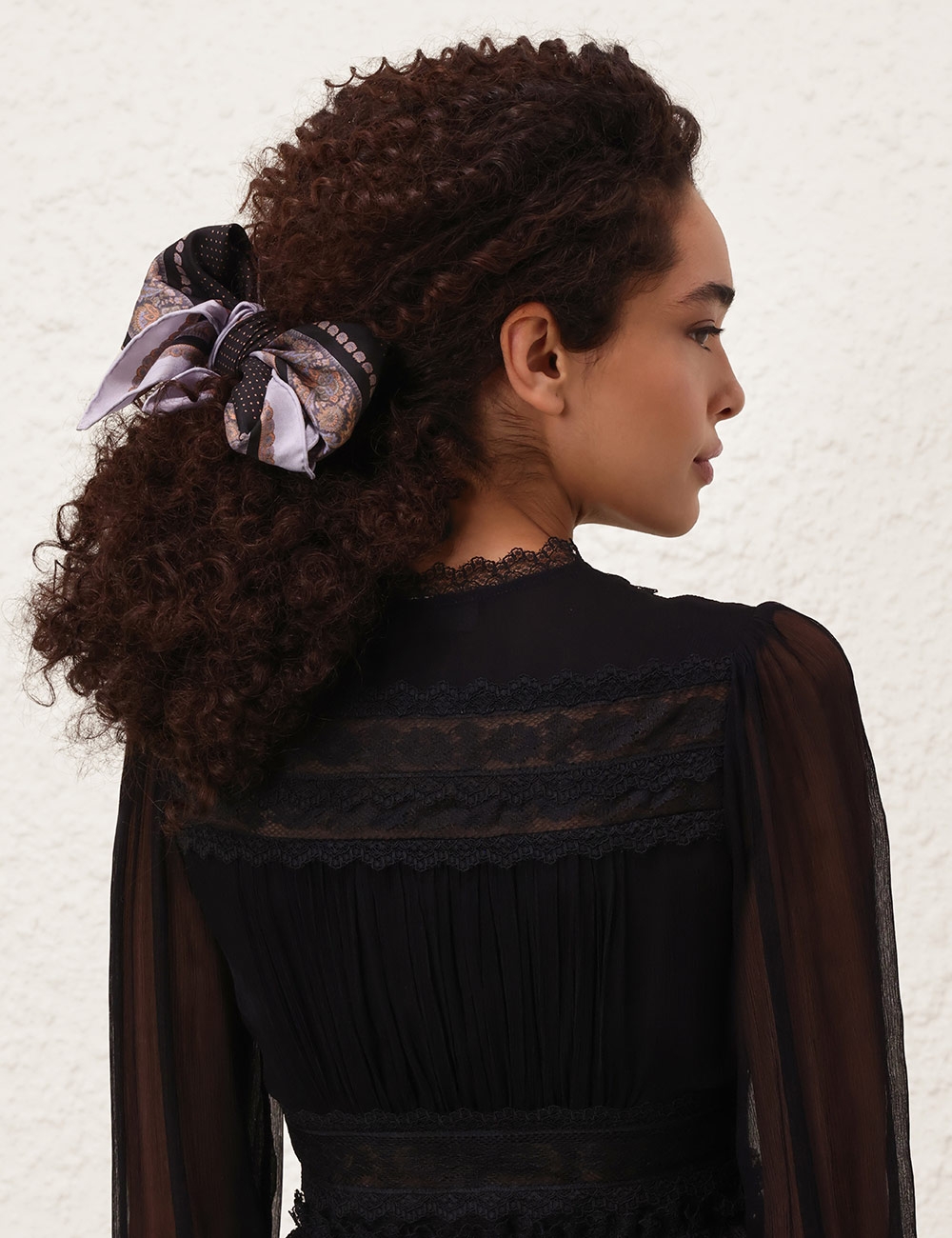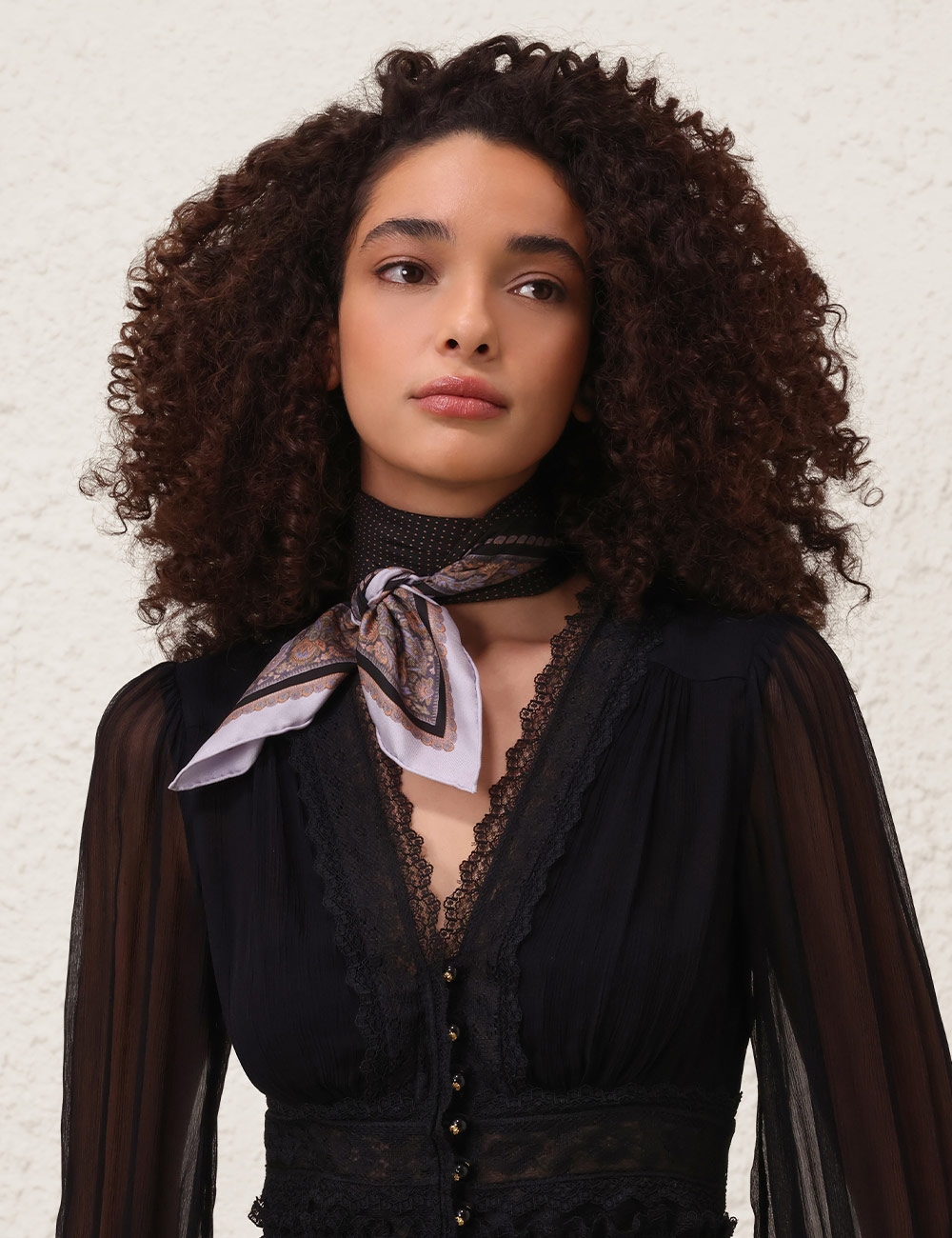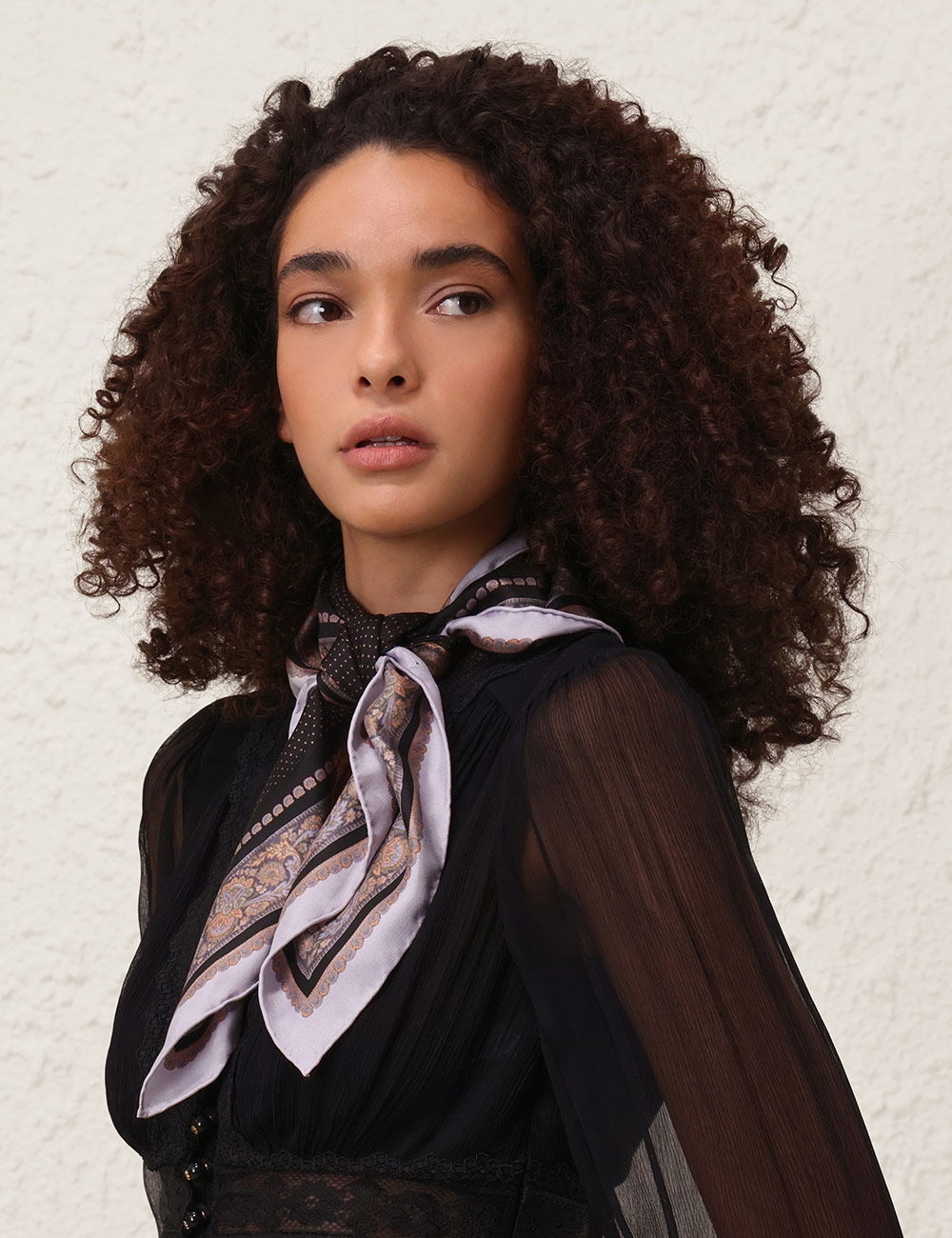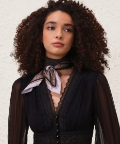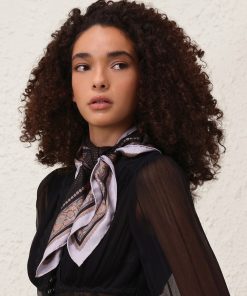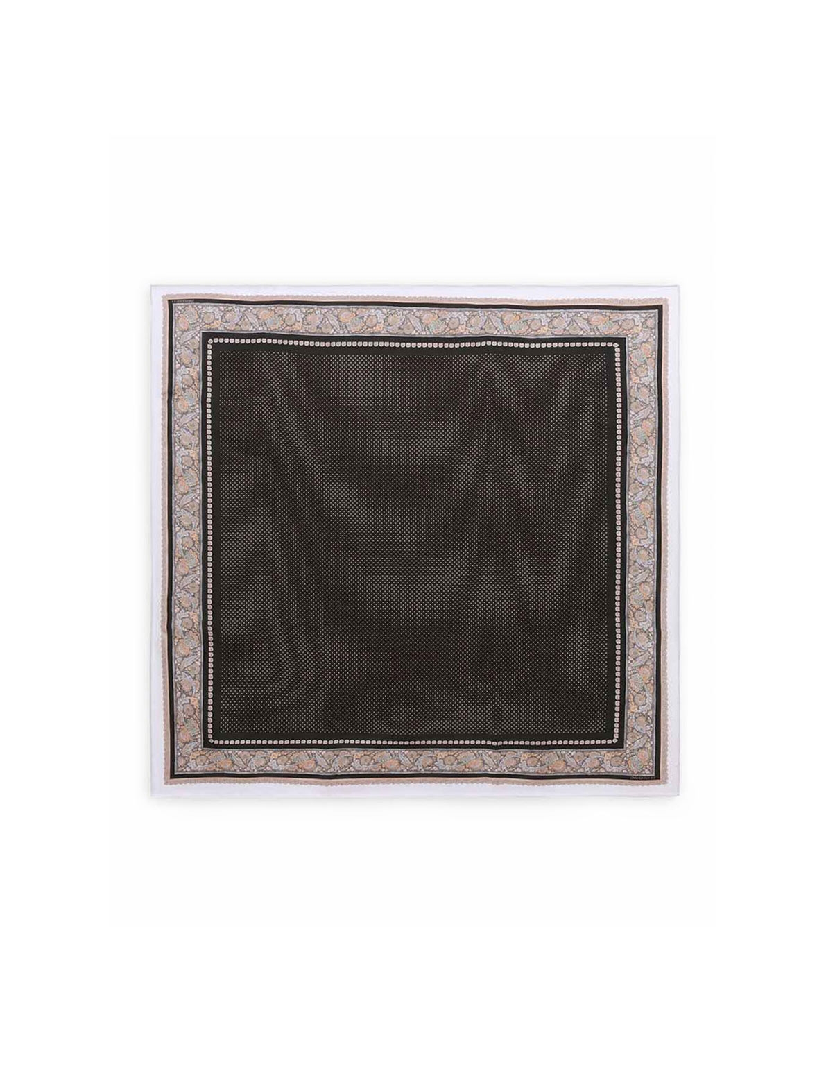The Printed Silk Square 70 in Black Paisley Black from our Fall 2025 Collection, Hypnotic. A silk square scarf featuring a customised placement print and fine rolled hem.100% silk fabric, placement printed neck scarf