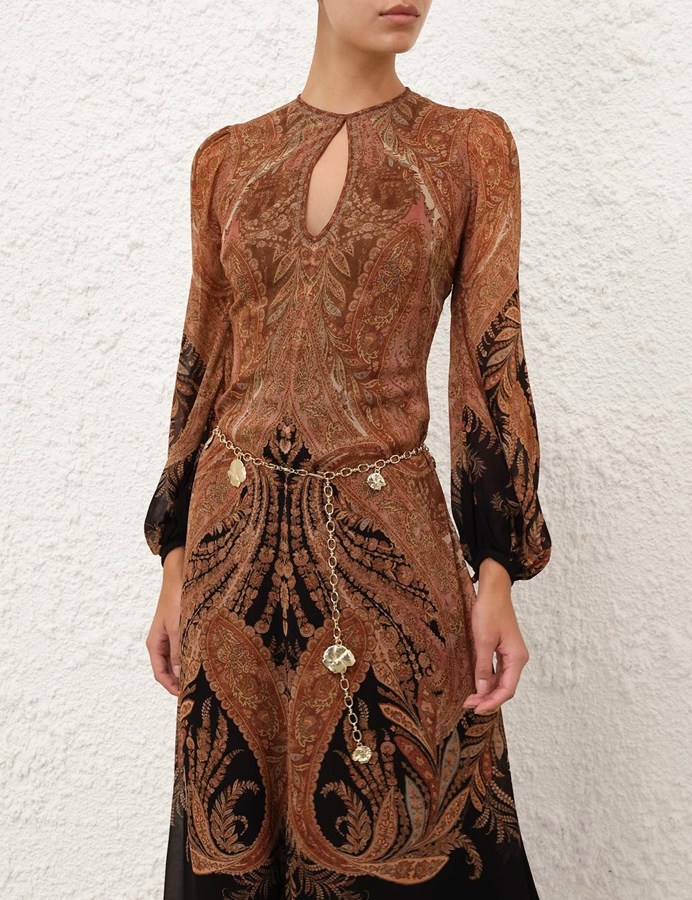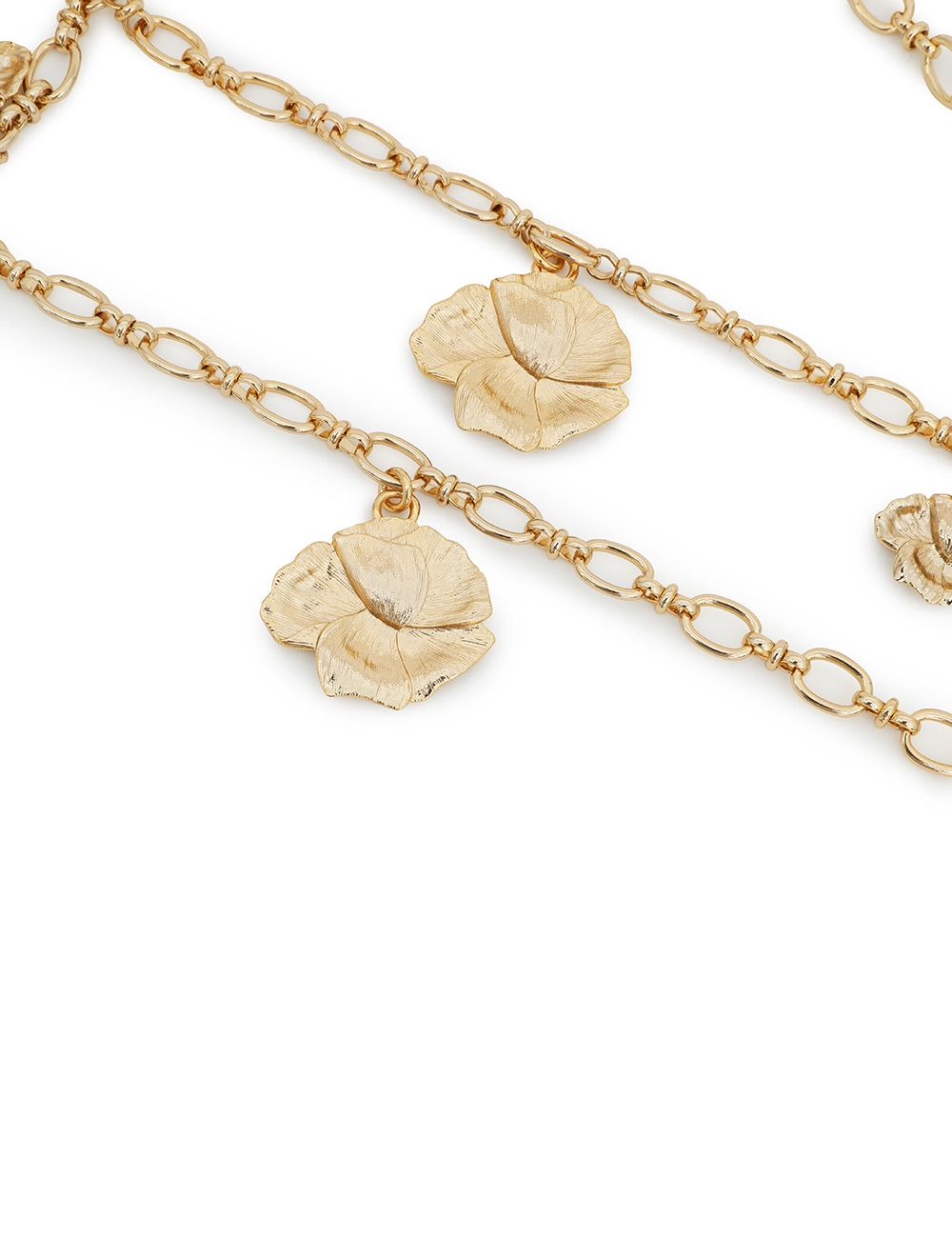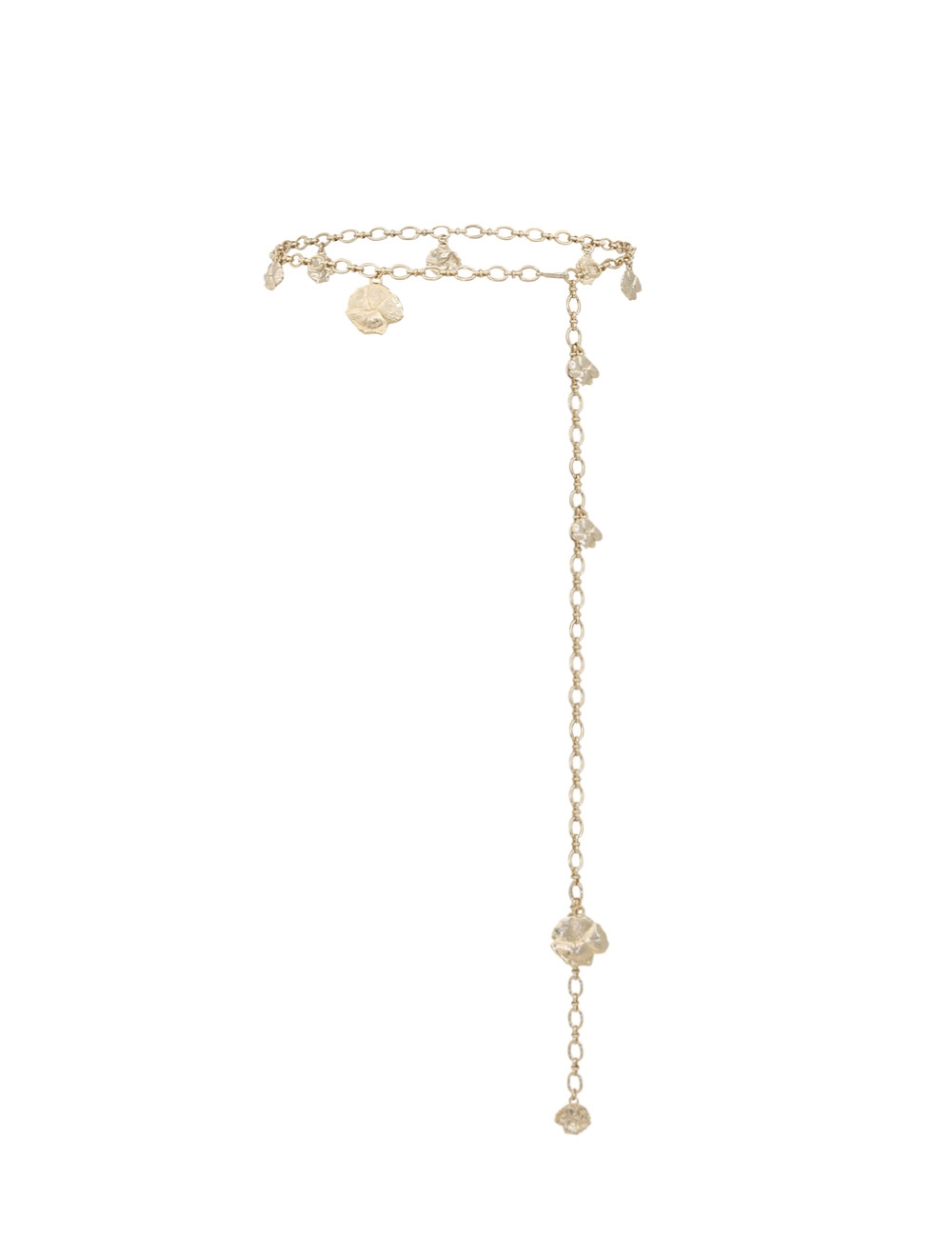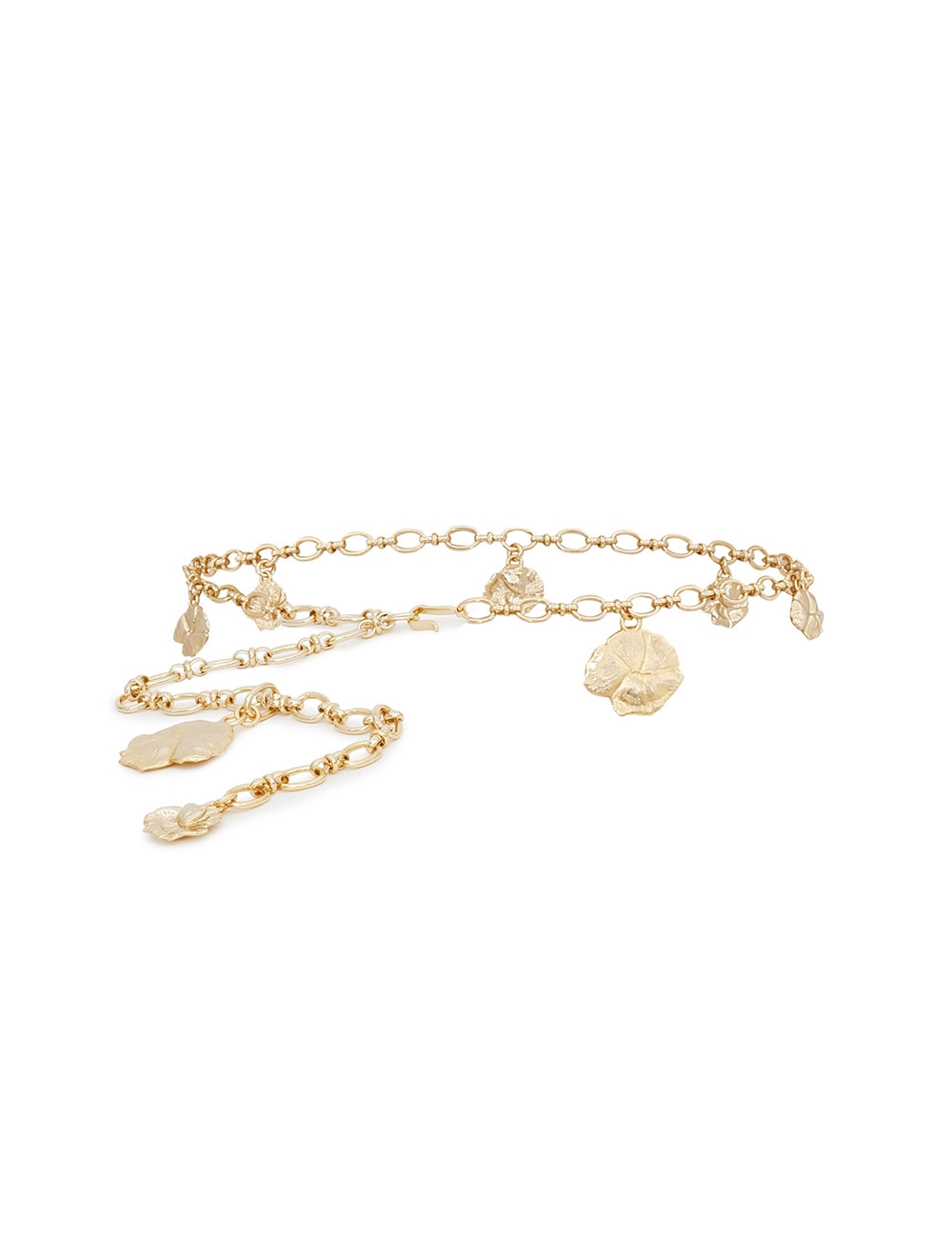 The Radiate Chain Belt in Gold from our Fall 2025 Collection, Hypnotic. A chain waist belt with custom flower petal detailing throughout.gold plated brass, waist belt, flower design