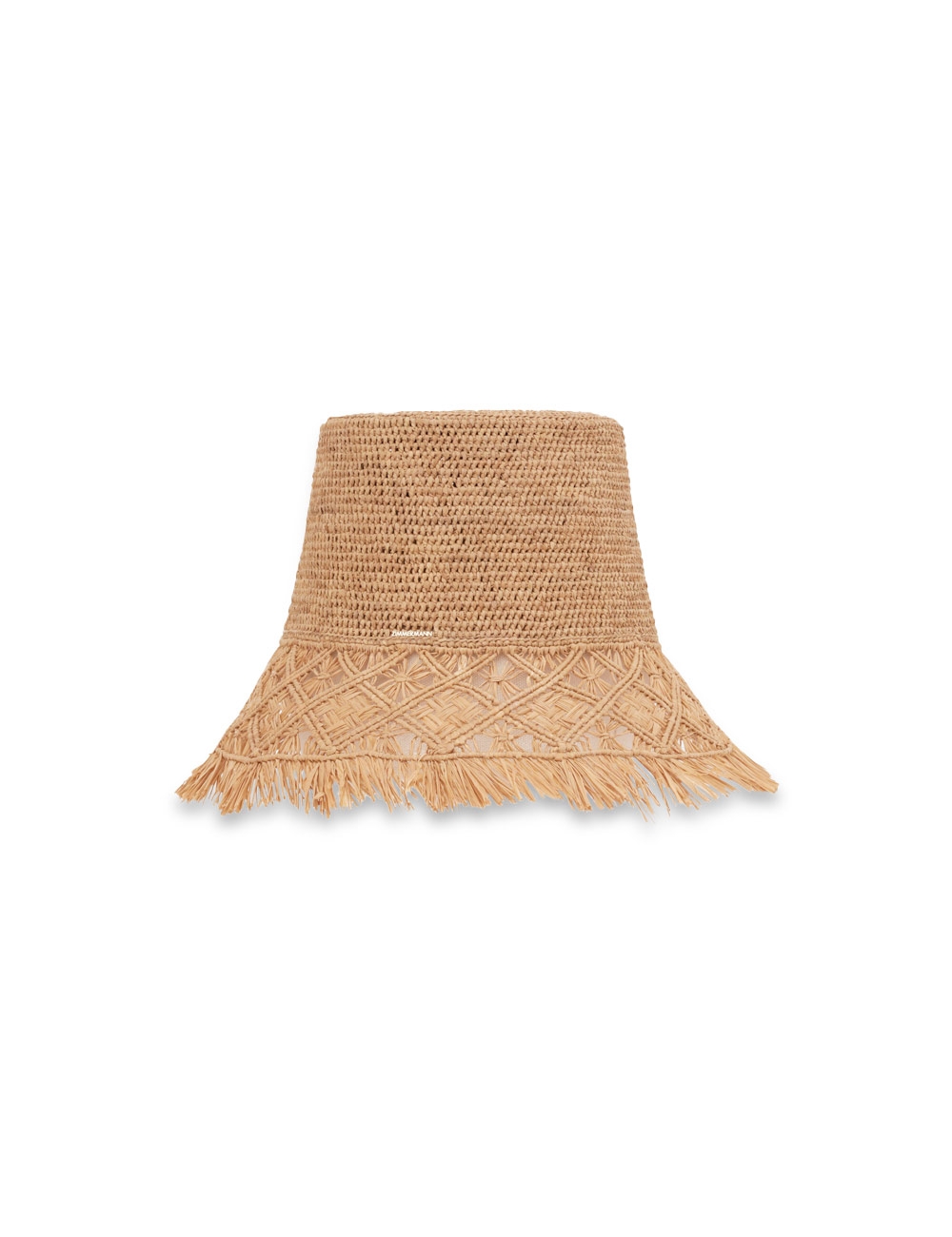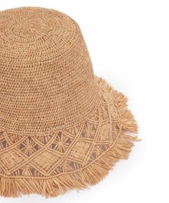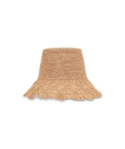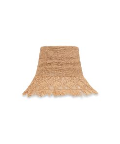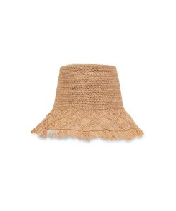 The Raffia Macrame Bucket Hat in Pecan from our Summer Swim 2025 Collection. A raffia fringed bucket hat featuring a tall crown. raffia, bucket hat, fringed edges