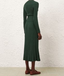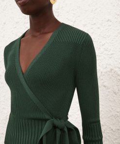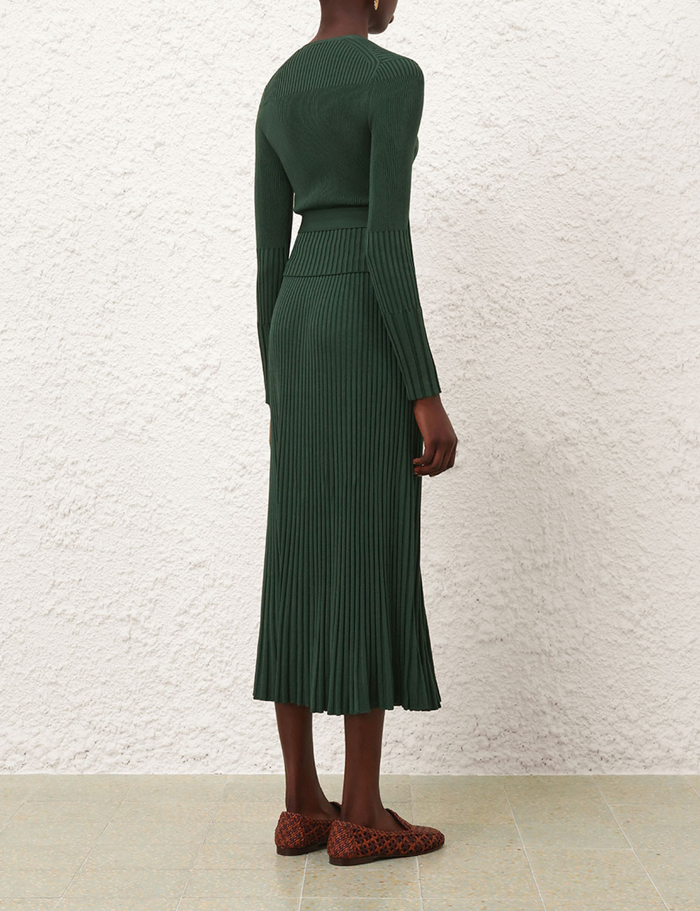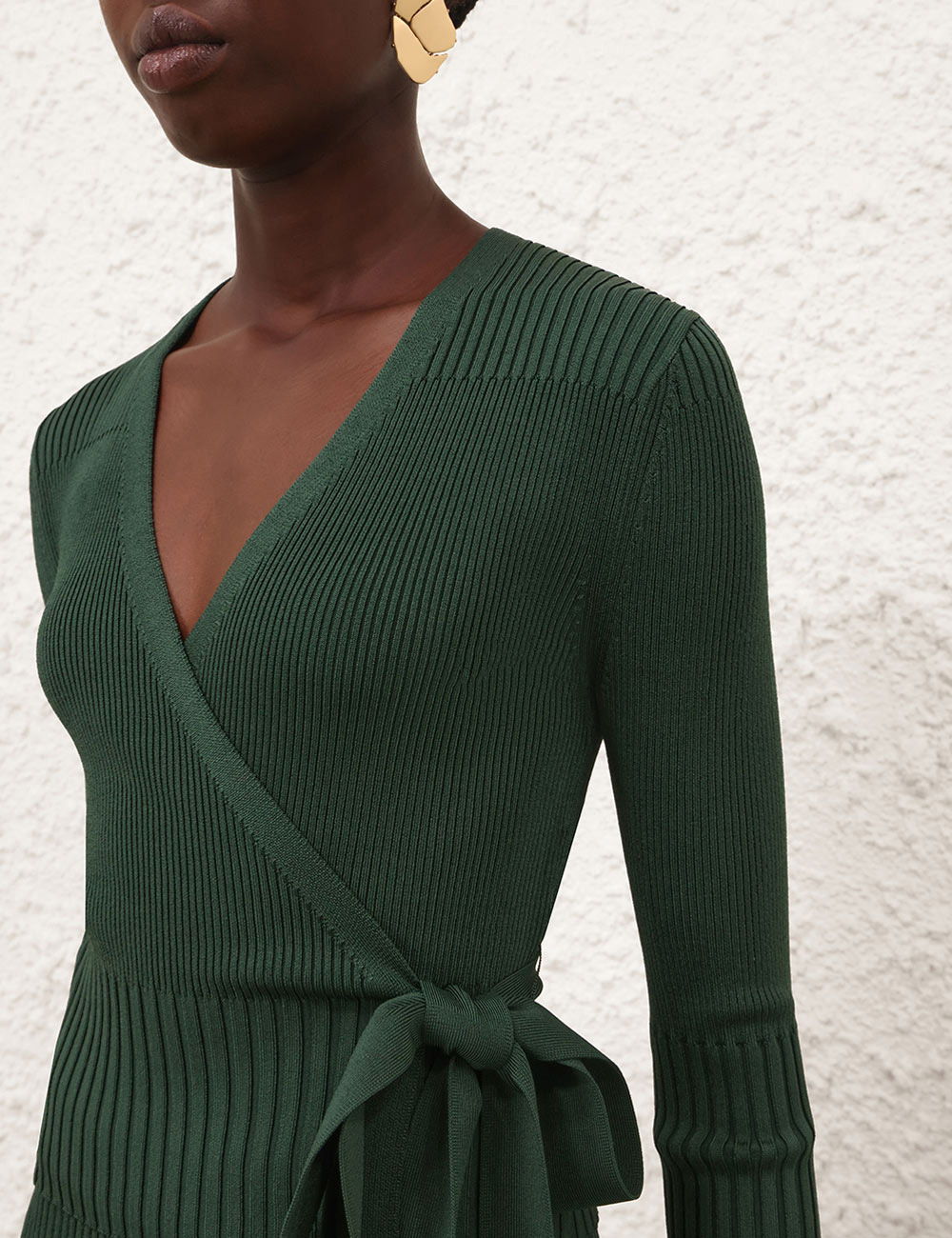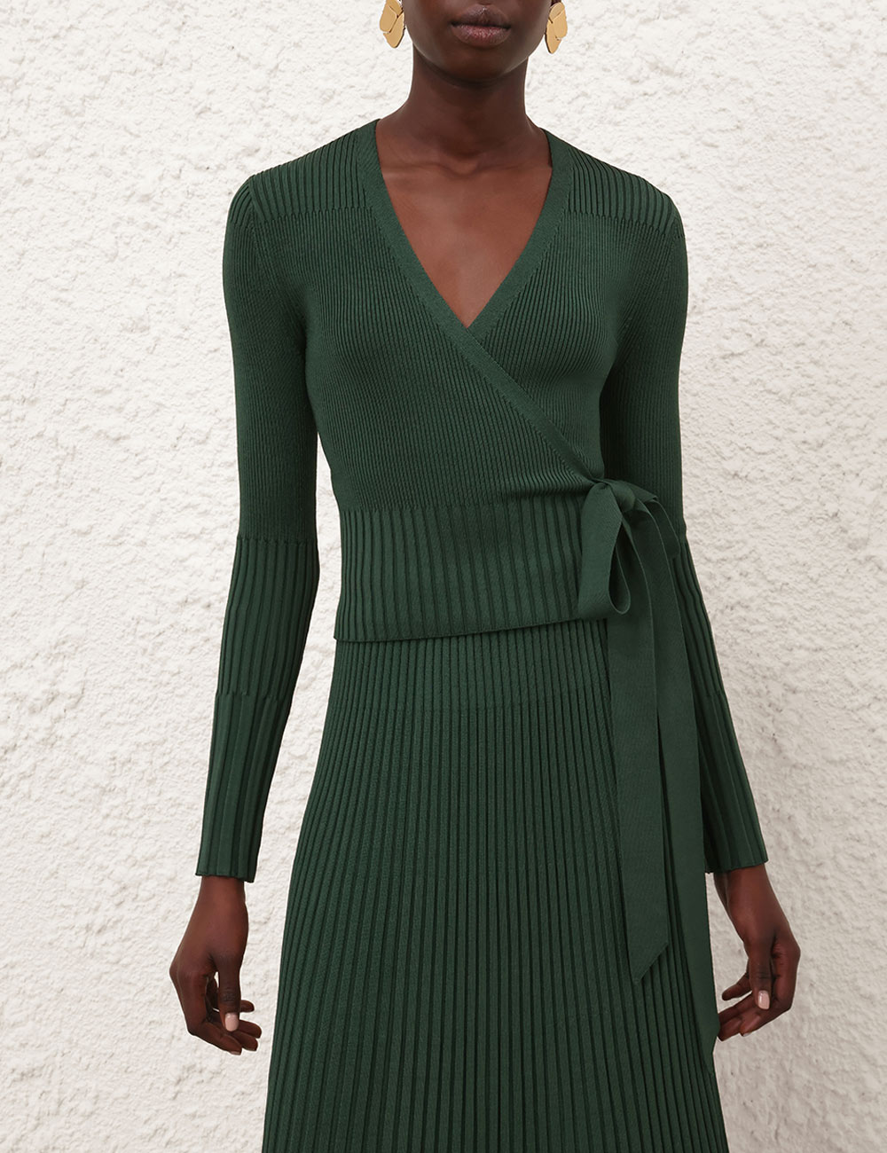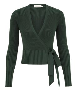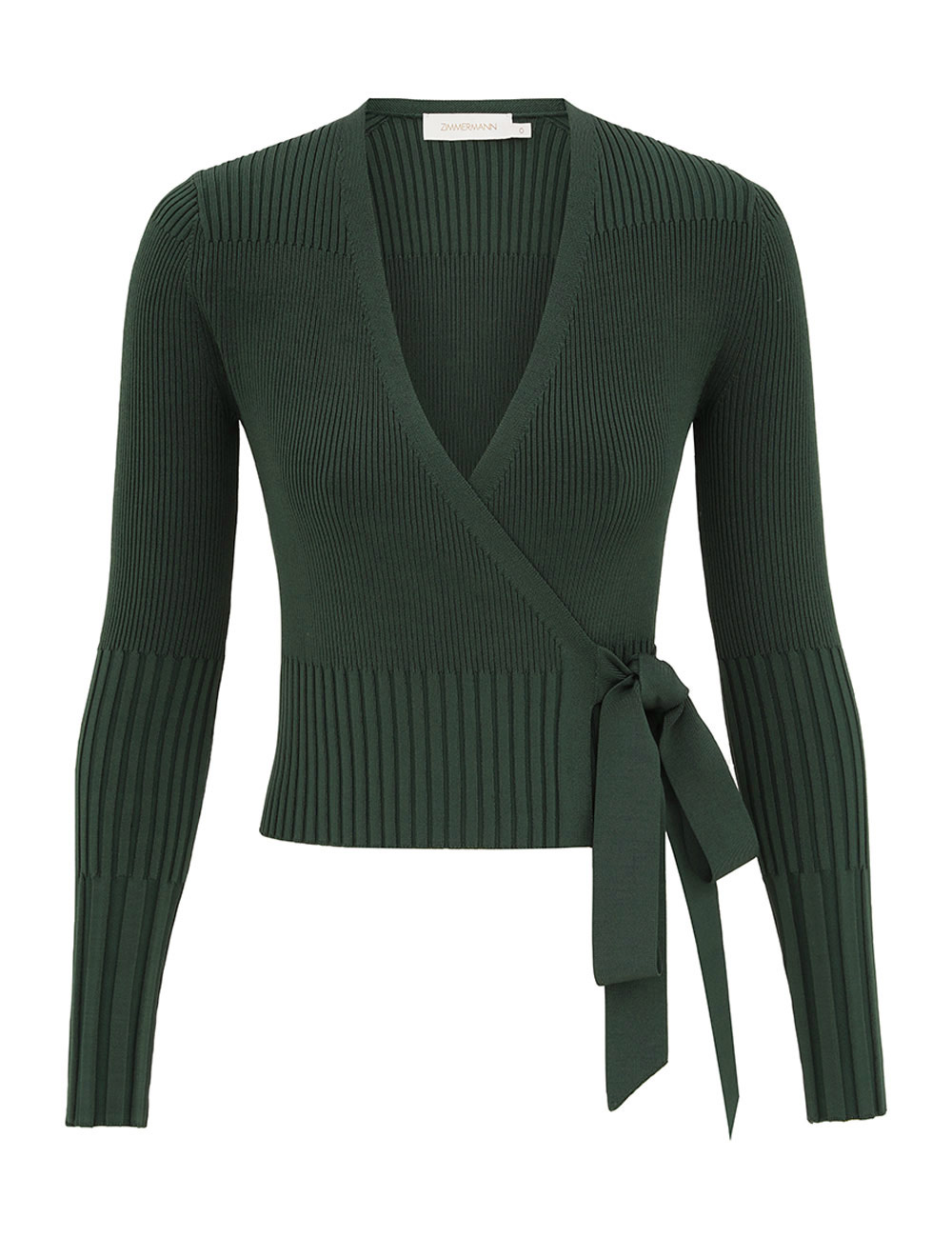 The Rib Wrap Cardigan in Dark Green from our Fall 2025 Collection, Hypnotic. A slim fit, knit cardigan featuring a plunging V-neckline, self-tie wrap at waist and an all-over ribbed texture. ribbed knit cardigan, wrap front silhouette, deep v-neck