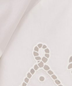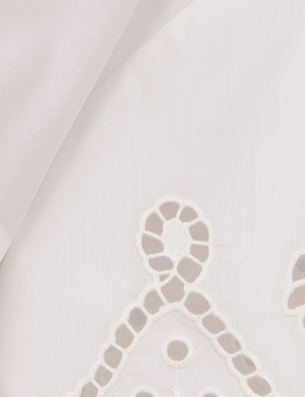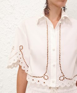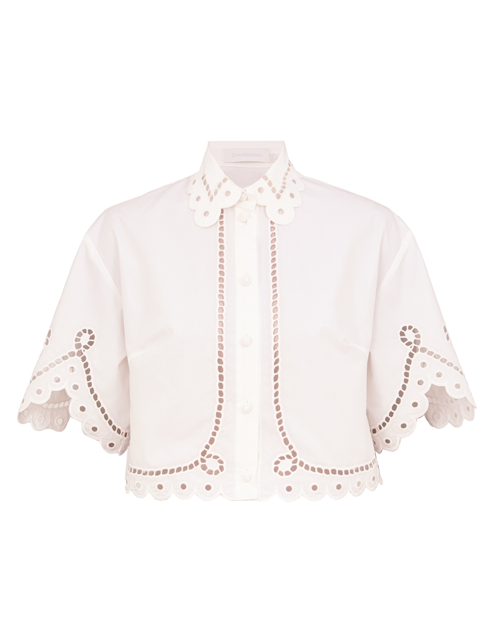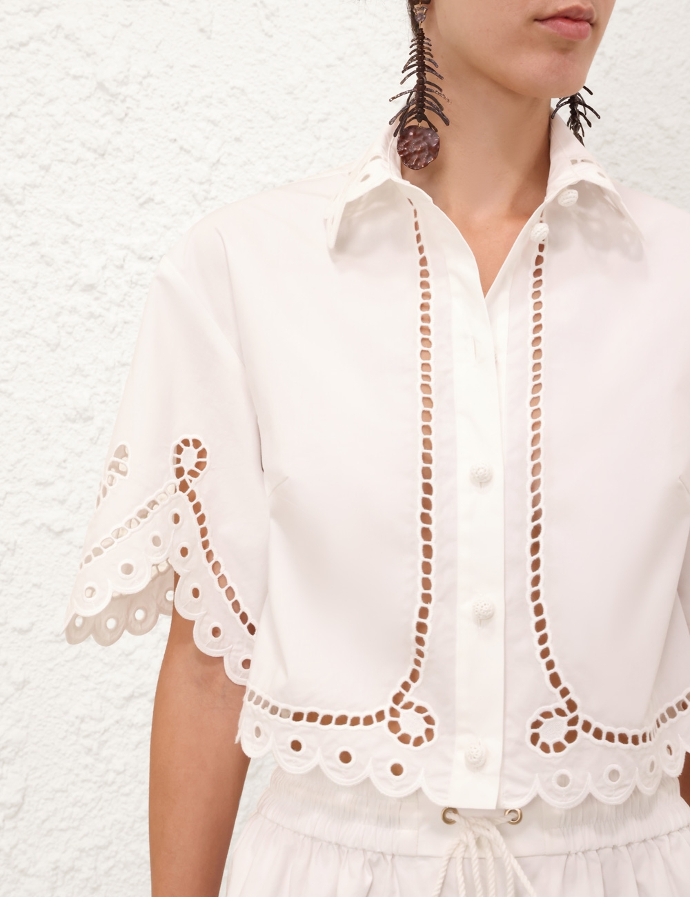 The Scarborough Embroidered Shirt in Ivory from our Summer Swim 2025 Collection. A cotton shirt featuring a classic collar, scalloped edging and buttons down the centre front.100% cotton fabric, cropped style shirt with short, loose sleeves, functional crochet buttons down the centre front, scalloped trim across collar, sleeves and hem, placement embroidery throughout