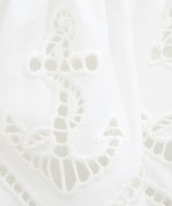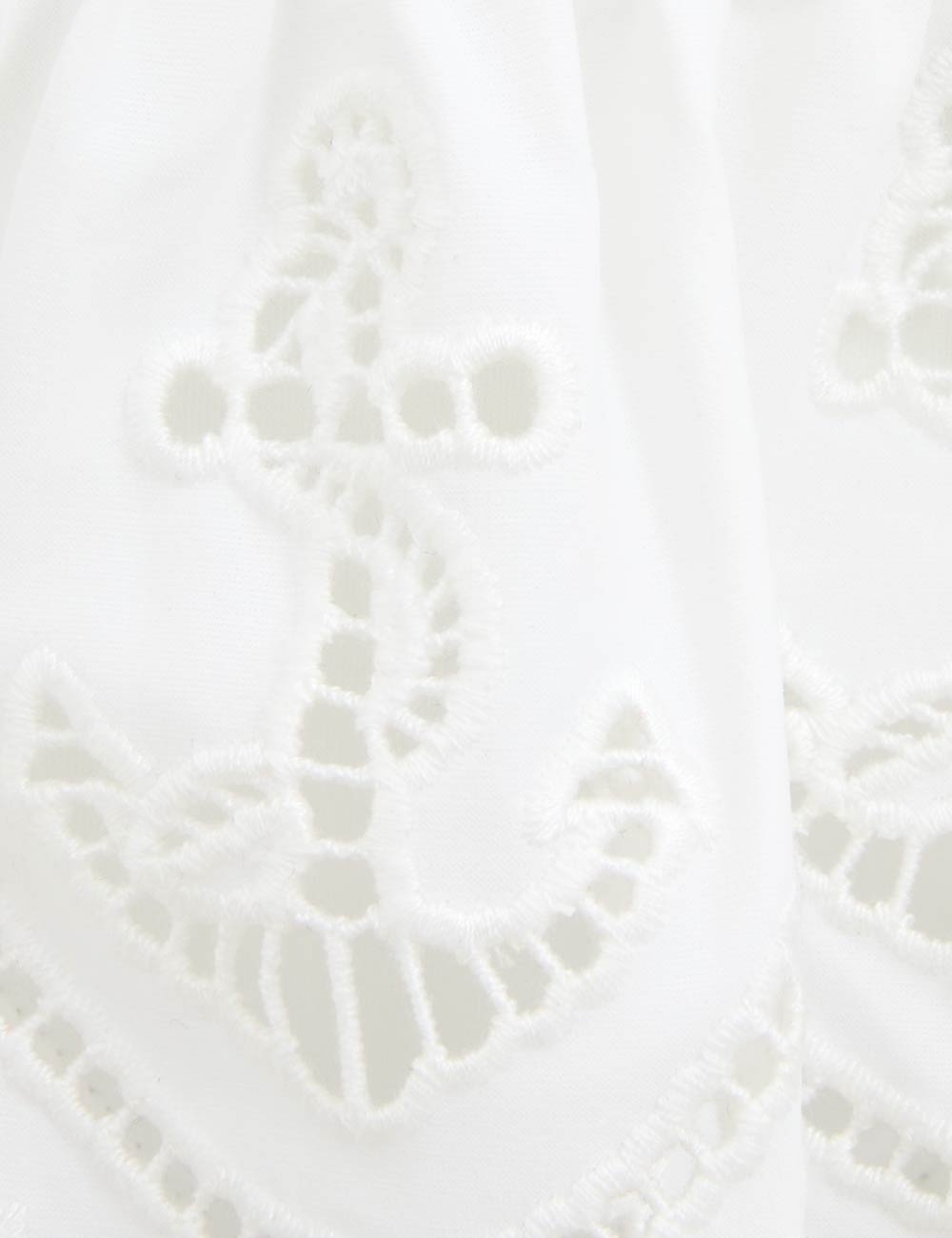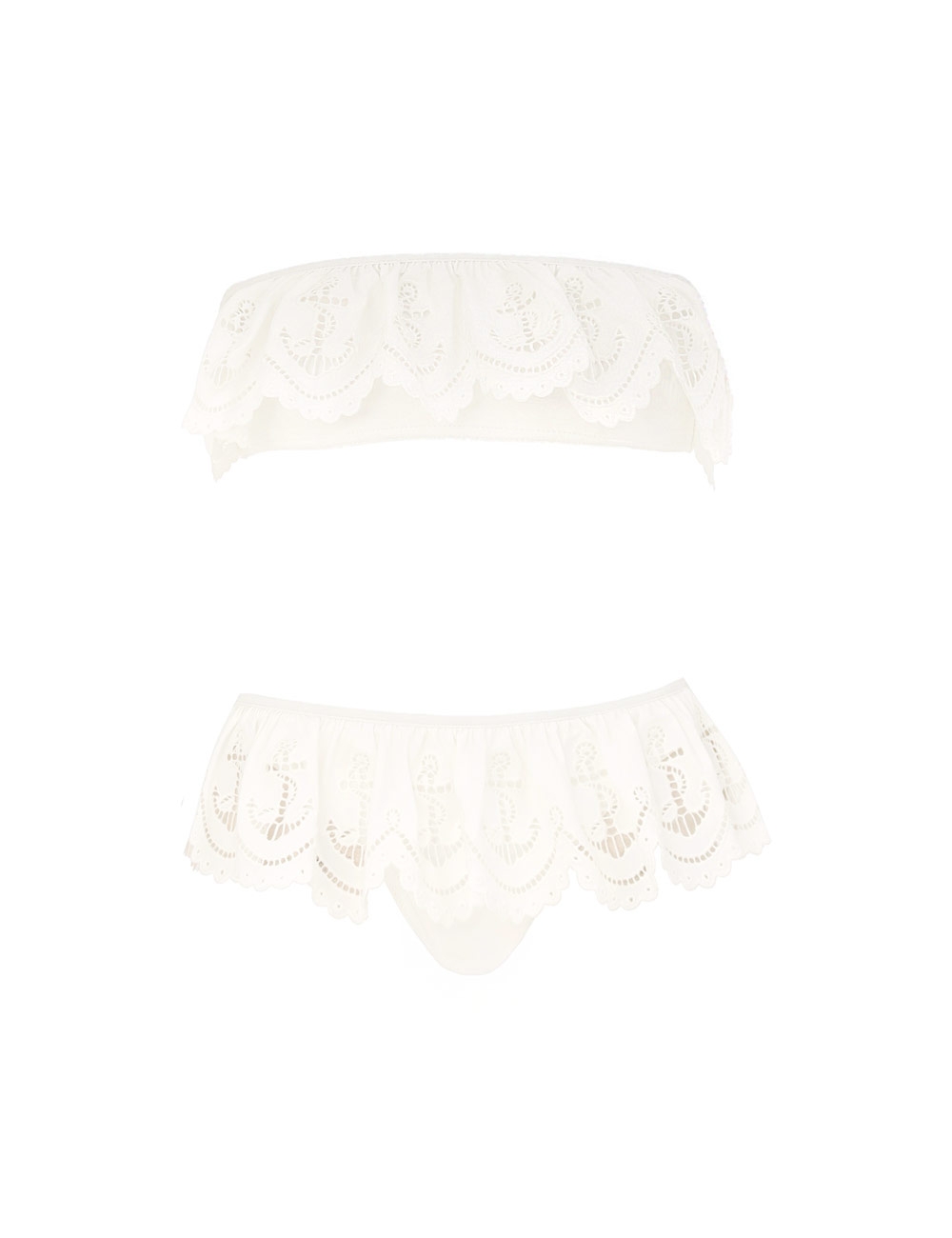The Scarborough Embroidery Bikini in Ivory from our Summer Swim 2025 Collection. A lycra bikini featuring a bandeau style bikini top with removable straps, paired with a low rise pant, finished with frill trim.lycra bikini set, gathering across bust, boning at side seam, removable and adjustable spaghetti straps for versatile fit, frill with scalloped edging across bust and hips, zimmermann clip fastening at bra centre back, lined