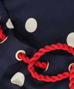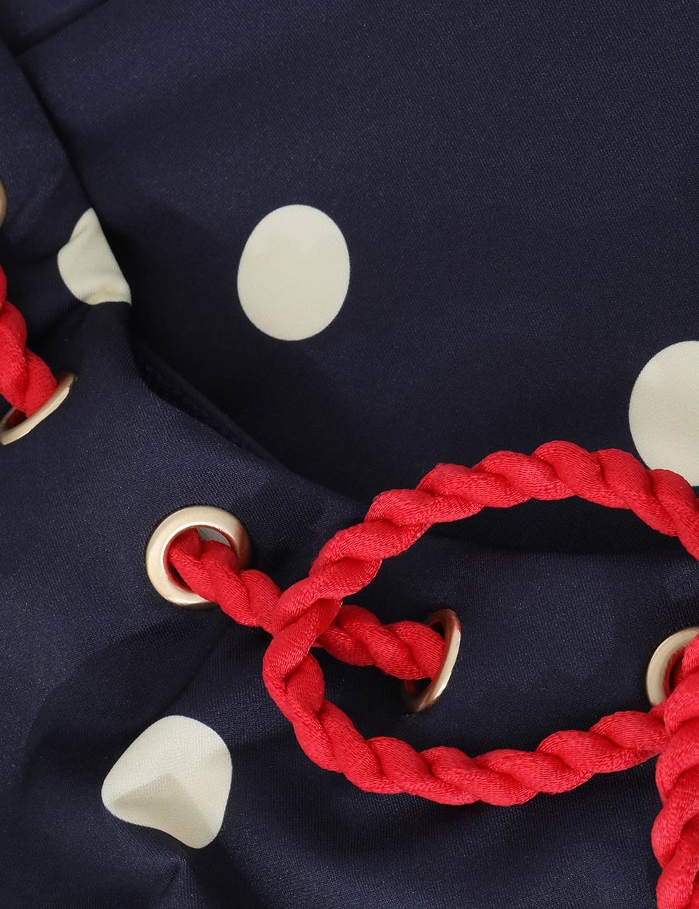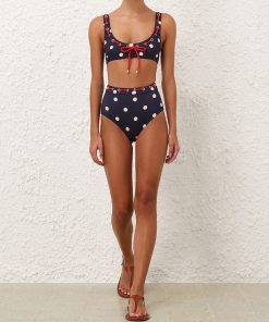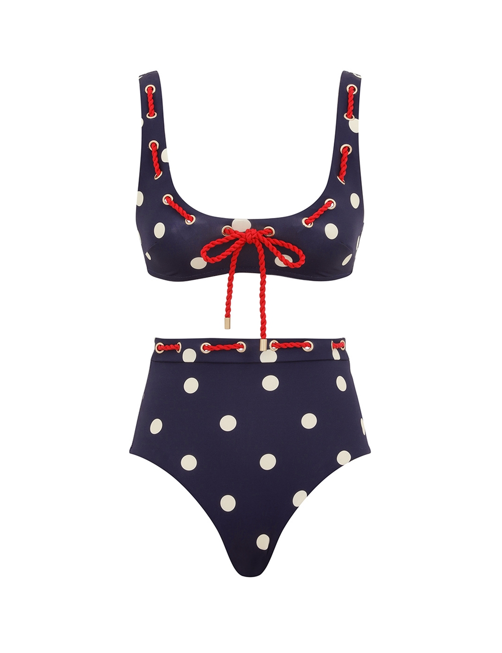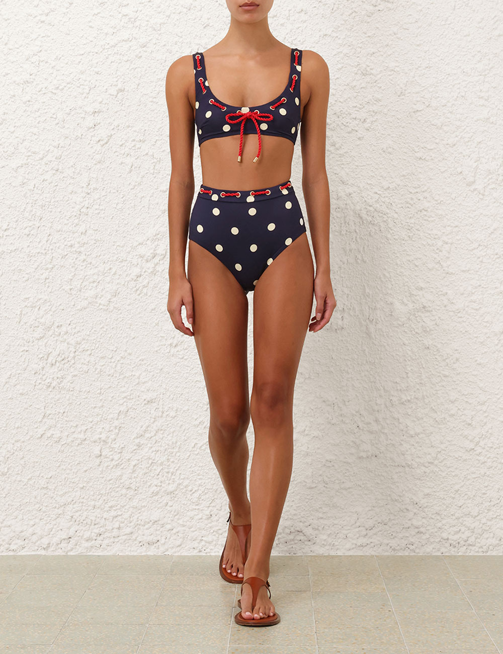 The Scarborough Eyelet Bikini in Blue/Ivory Polka Dot from our Summer Swim 2025 Collection. A lycra bikini set featuring a bikini top with a scooped neckline, back clasp and high waisted pant, finished with rope detailing threaded throughout.lycra bikini set, bikini top with eyelets and rope threaded across neckline, high waisted pant with rope and eyelets at waist, medium coverage, zimmermann clip fastening at bra centre back, lined