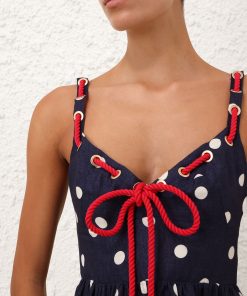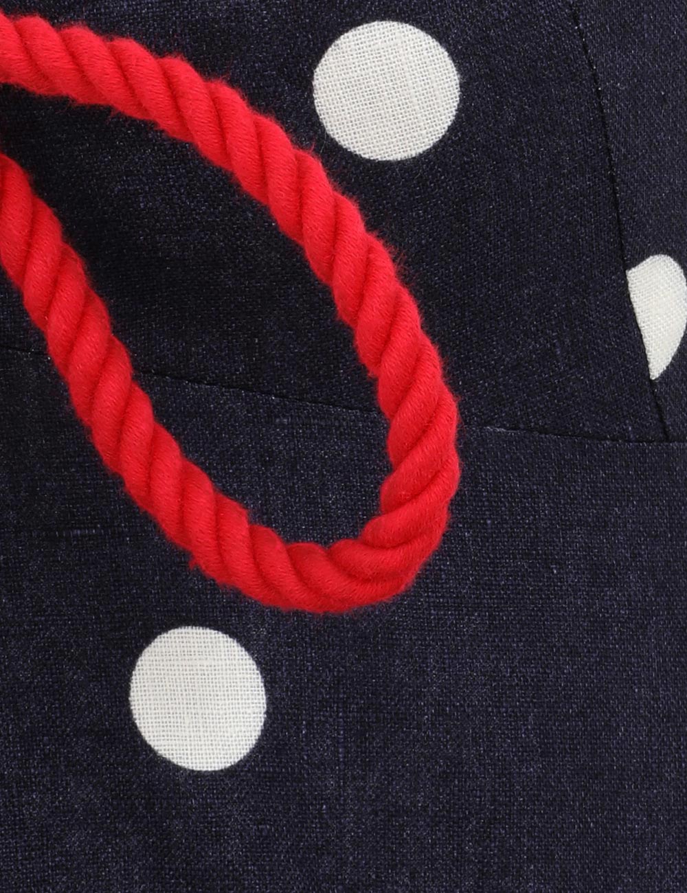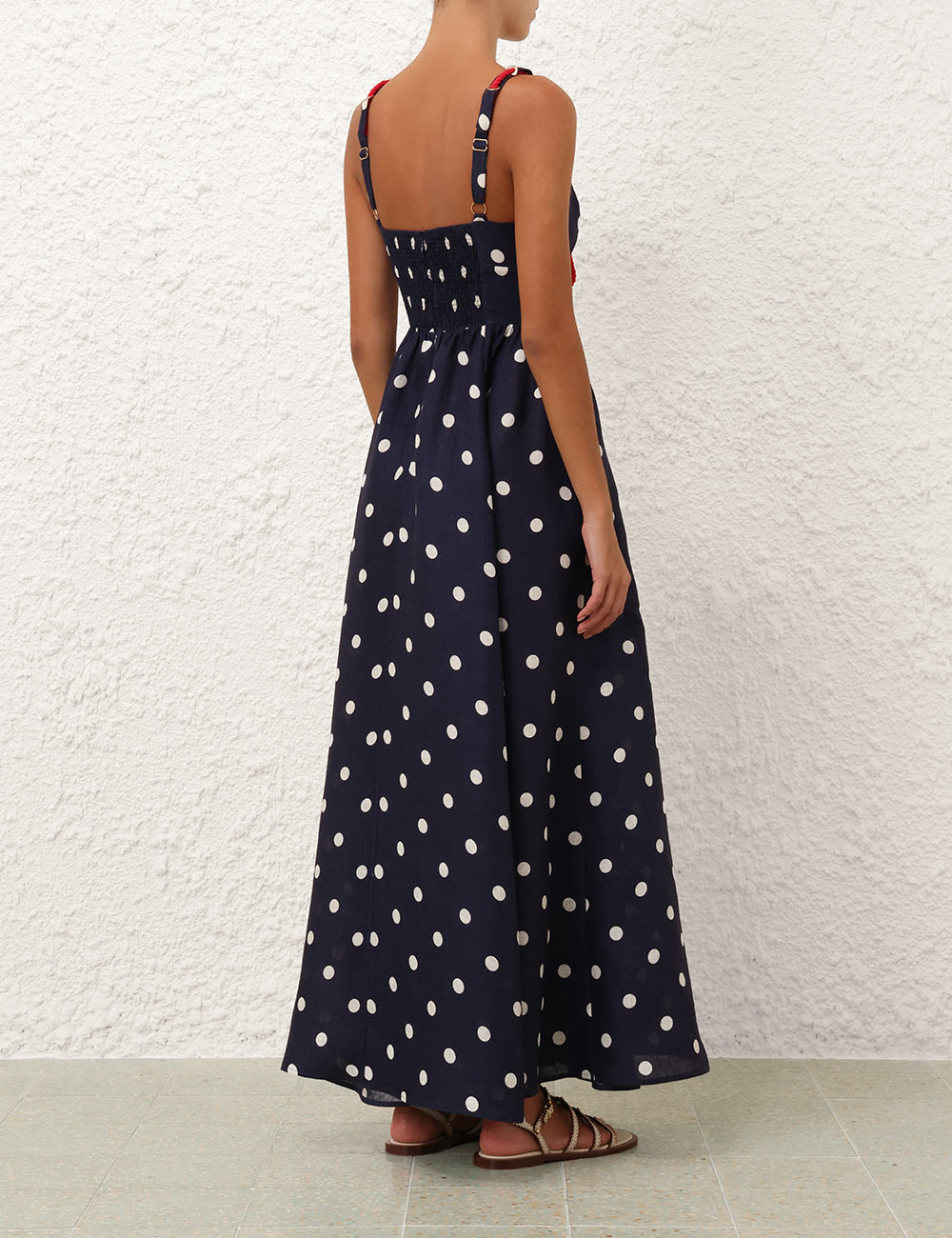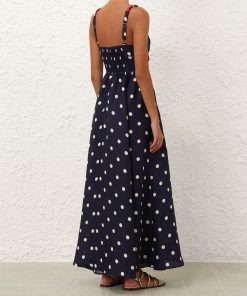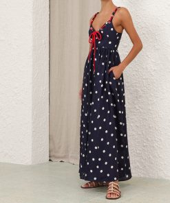 The Scarborough Eyelet Maxi Dress in Blue/Ivory Polka Dot from our Summer Swim 2025 Collection. A linen maxi dress featuring a V-neckline and rope tie detailing threaded through the straps and across the bust.100% linen fabric, rope cord detailing across the bust and shoulder straps, shirred bodice, invisible zip closure at centre back with hook and eye, adjustable straps for versatile fit, side seam pocket