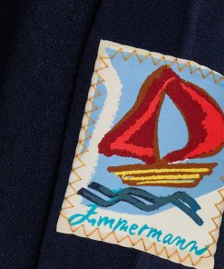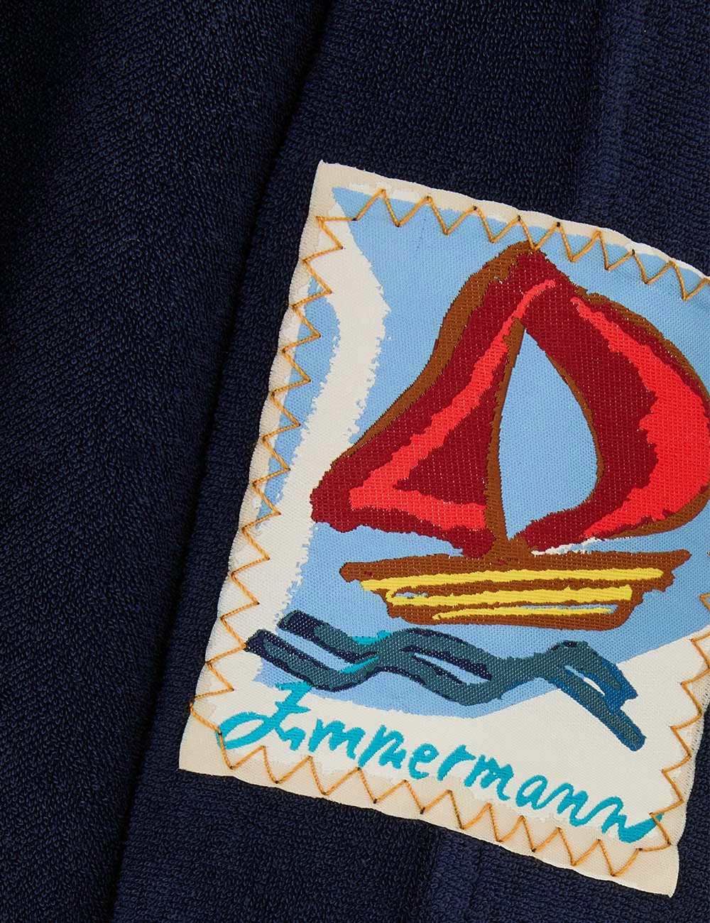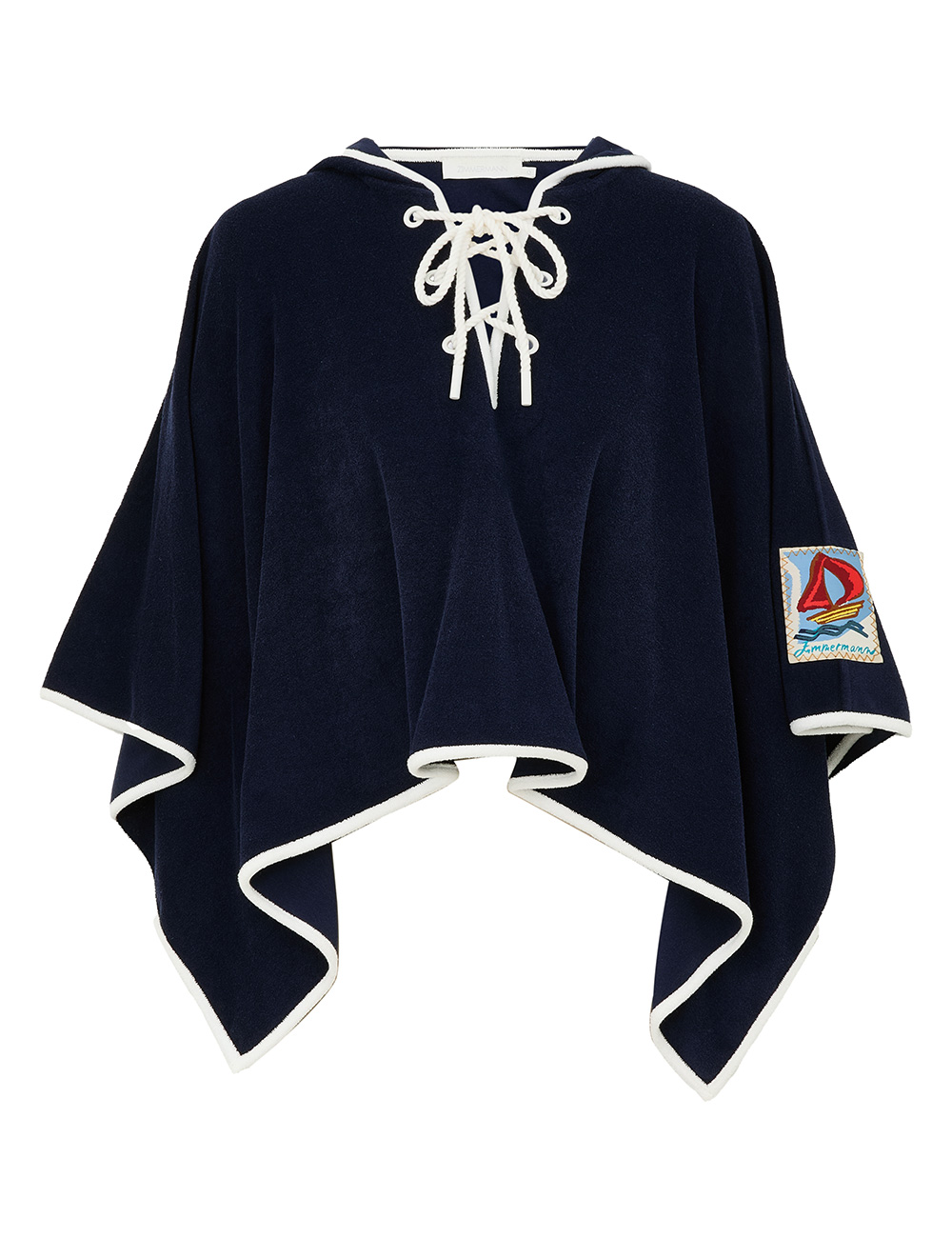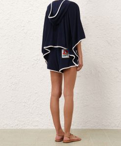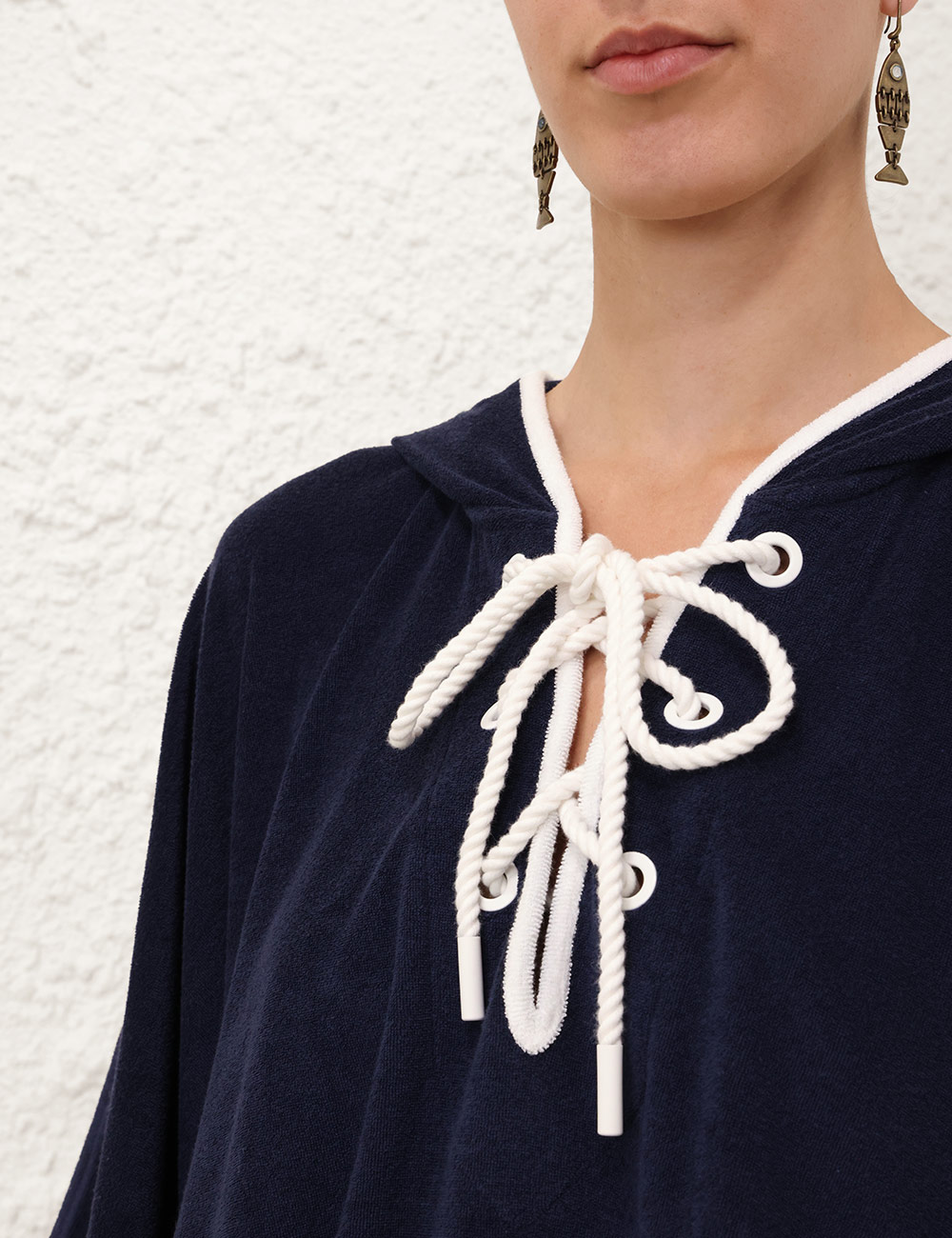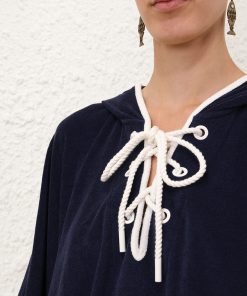 The Scarborough Hooded Towel Top in Navy/Ivory from our Summer Swim 2025 Collection. A terry towelling top featuring a deep V-neckline, functional hood and rope detailing across the bust.towelling top with long wide sleeves, plunging v-neckline with eyelet rope tie across bust, slip on style, zimmermann patch at left sleeve hem, contrast piping along edges