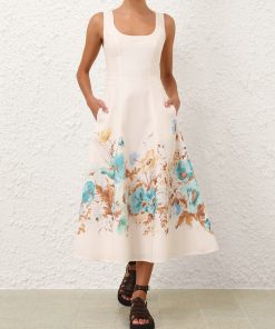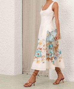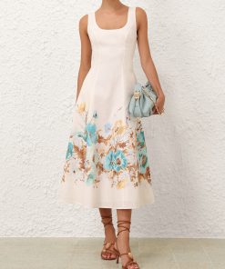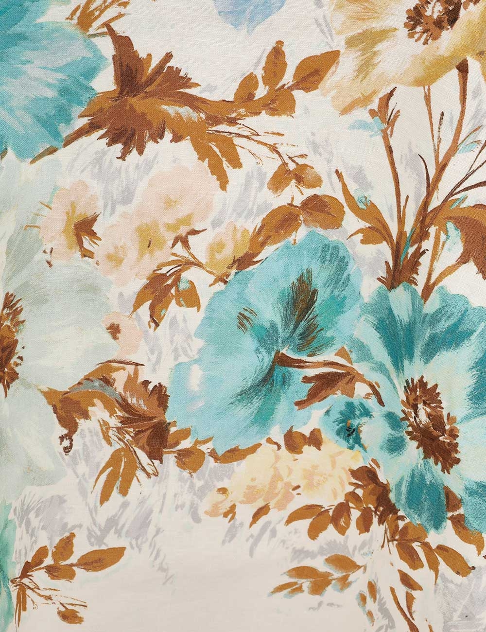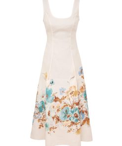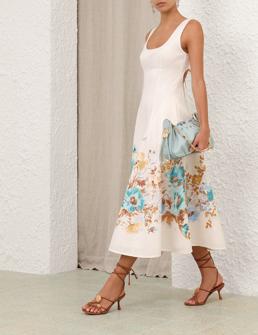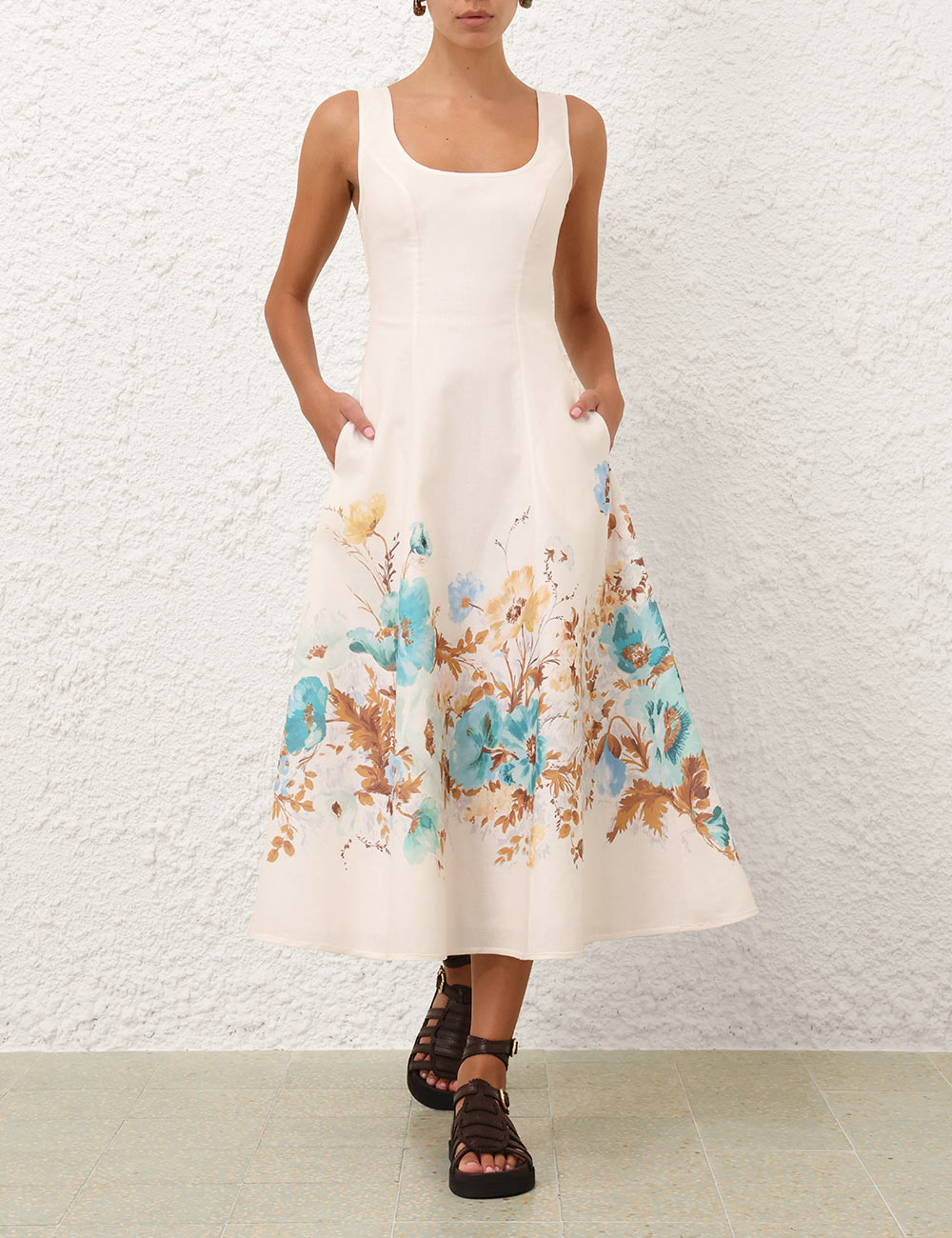 The Scarborough Midi Dress in Cream/Teal Floral from our Summer Swim 2025 Collection. A linen midi dress featuring a scoop neckline, fitted bodice and a flared skirt.100% linen fabric, fitted bodice with panel detailing, rouleau self-tie across centre back cutout, invisible zip closure at centre back with hook and eye, functional side pockets, fully lined