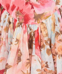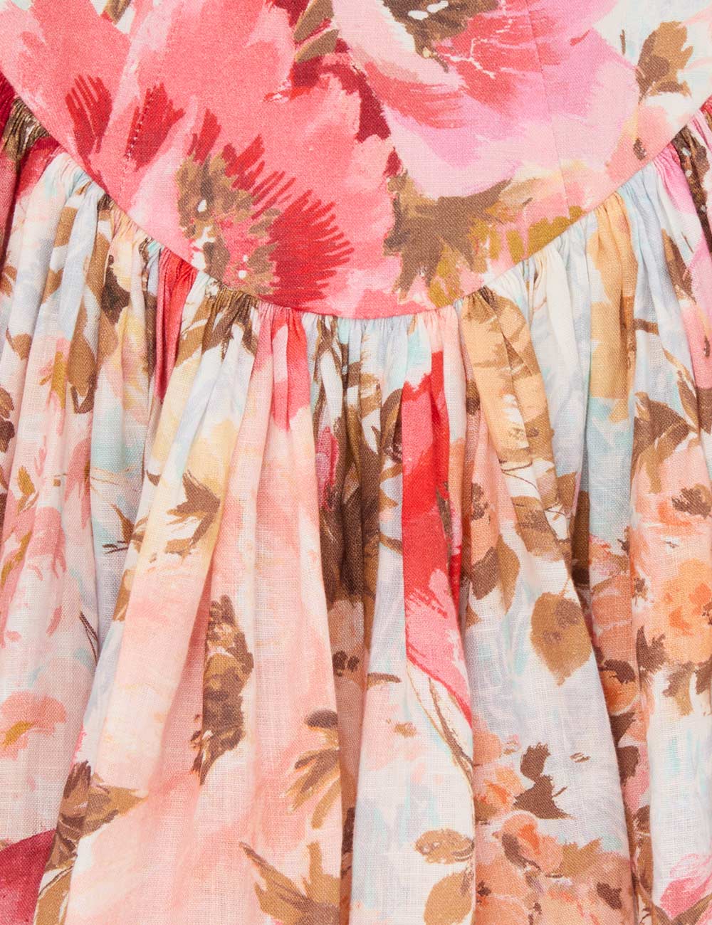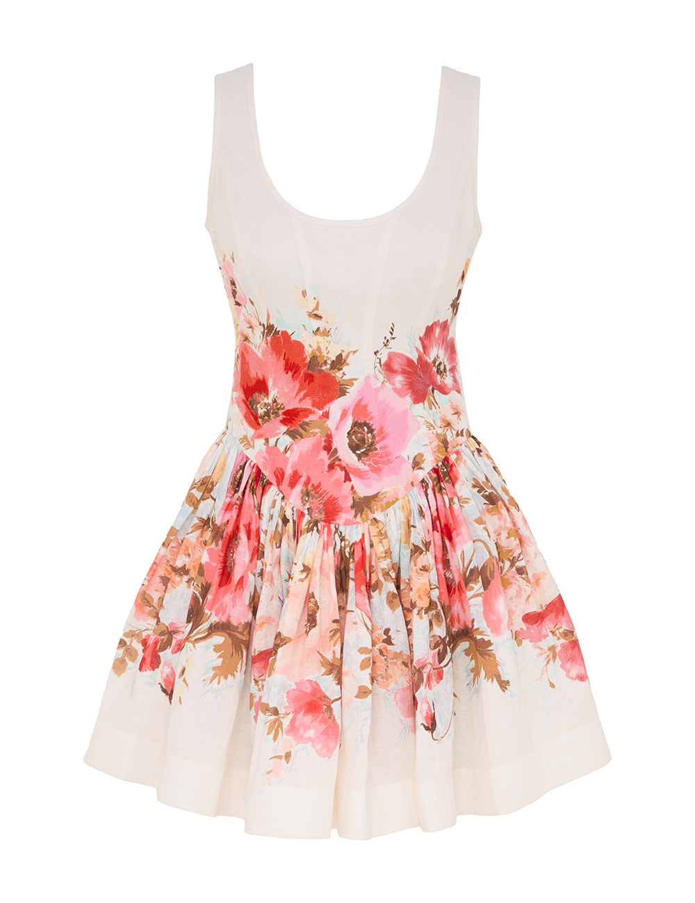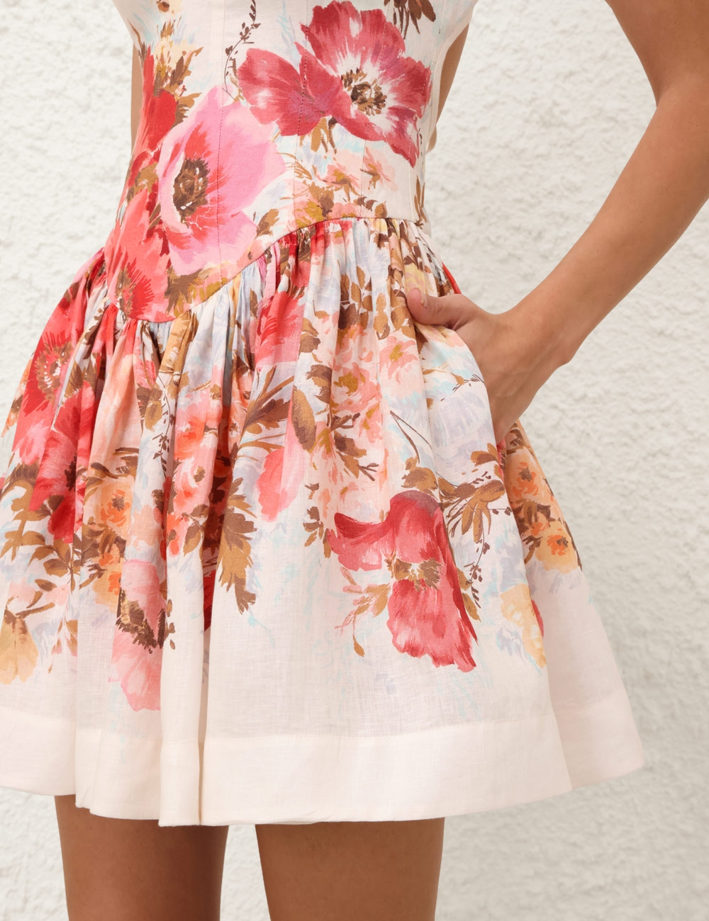 The Scarborough Mini Dress in Cream/Red Floral from our Summer Swim 2025 Collection. A linen mini dress featuring a scoop neckline, fitted bodice and a flared skirt.100% linen fabric, fitted bodice with panel detailing, rouleau self-tie across centre back cutout, invisible zip closure at centre back with hook and eye, functional side seam pockets