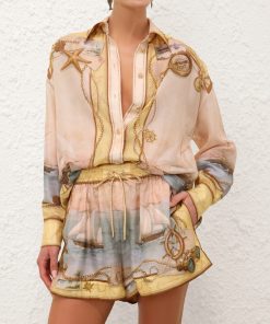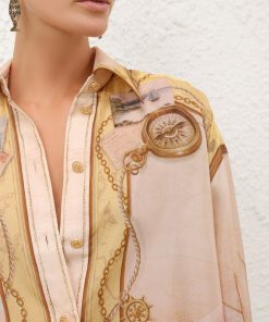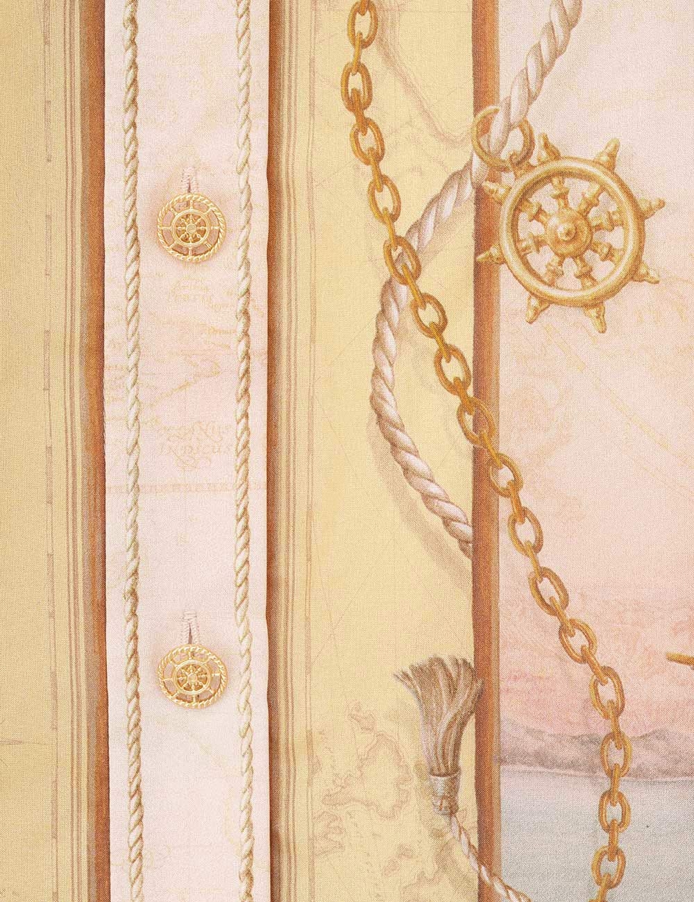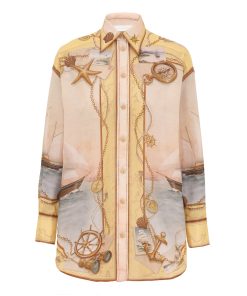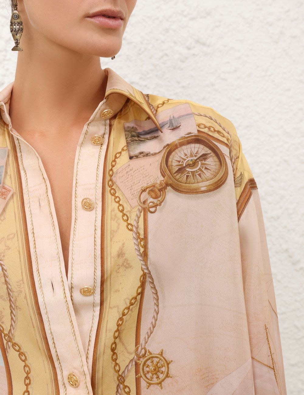 The Scarborough Relaxed Shirt in Yellow Nautical Map from our Summer Swim 2025 Collection. A relaxed silk shirt featuring long sleeves, a classic collar and buttons down the centre front and on the cuffs.100% silk habutae fabric, spliced throughout, partial side splits, functional buttons down the centre front, contrast piping along collar and hem