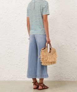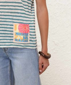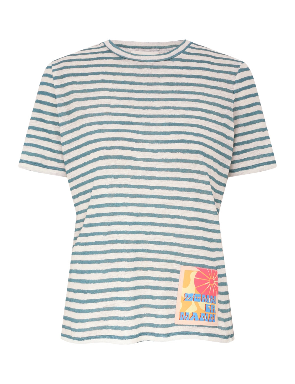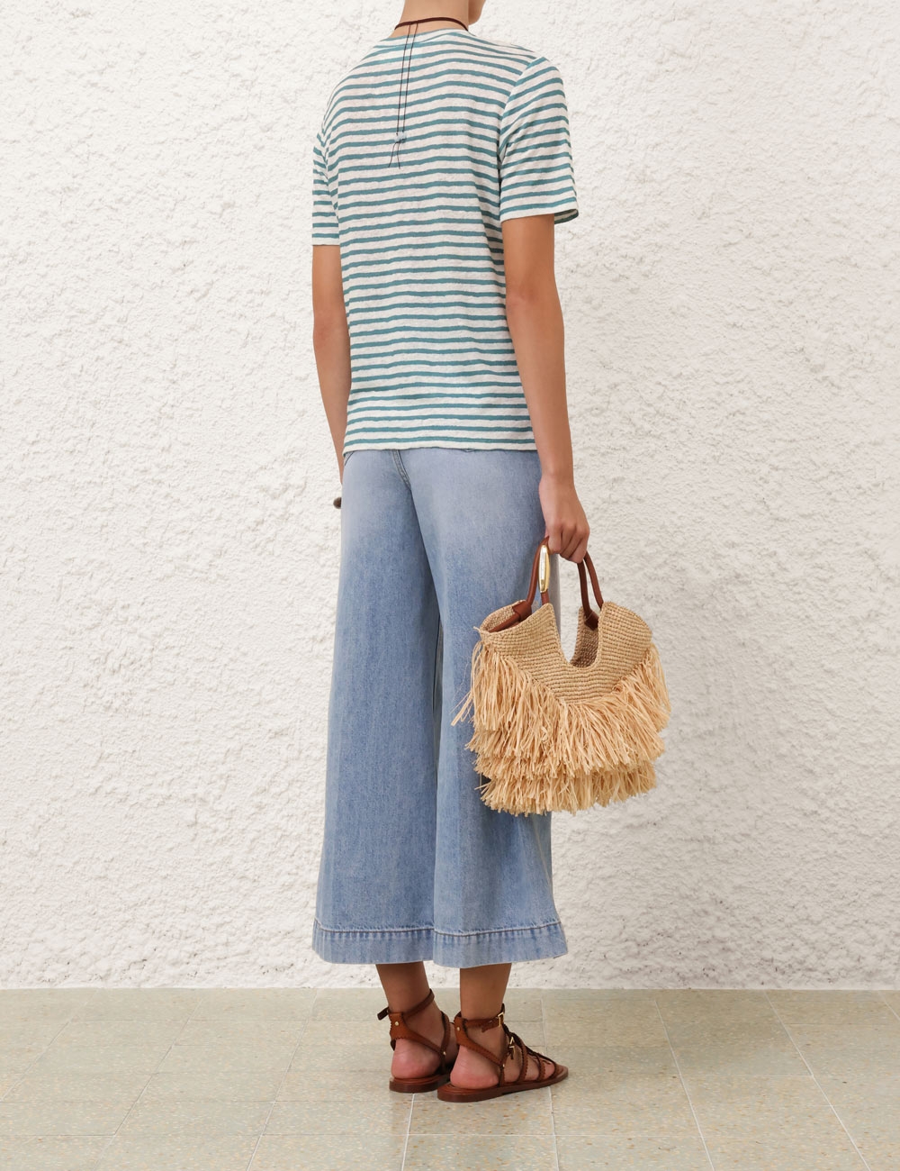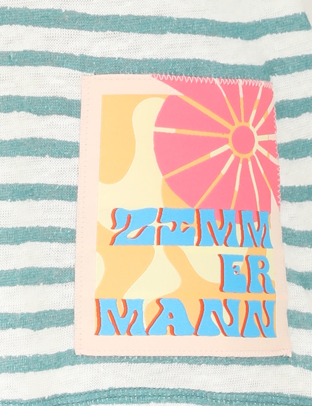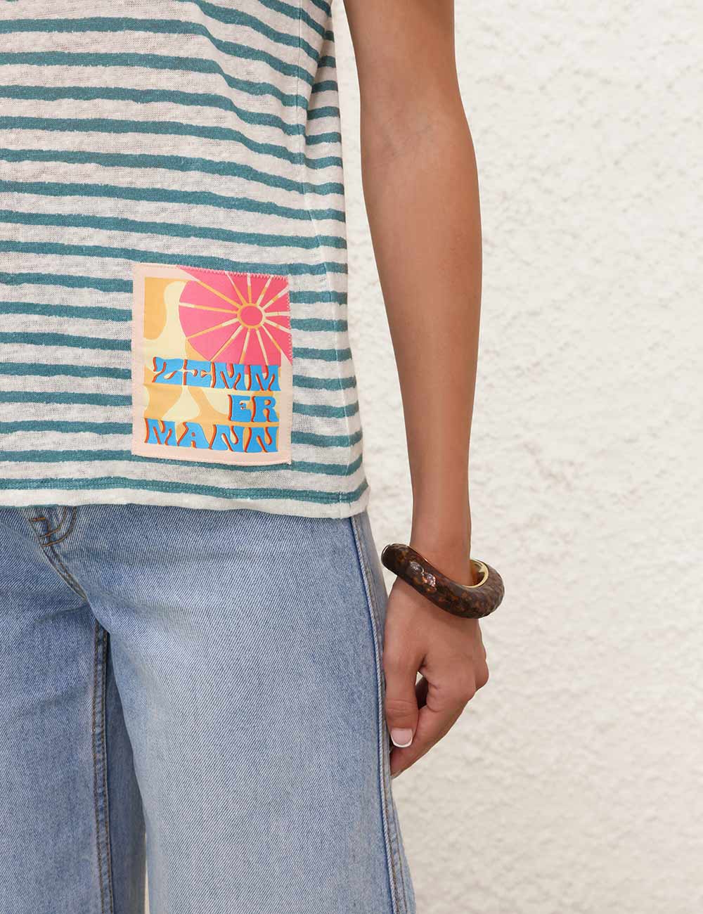 The Scarborough Straight Tee in Ivory/Teal from our Summer Swim 2025 Collection. A linen tee featuring short sleeves, crew neckline and stripe placement print.100% linen fabric, double turned hemline, zimmermann patch embroidery, placement printed