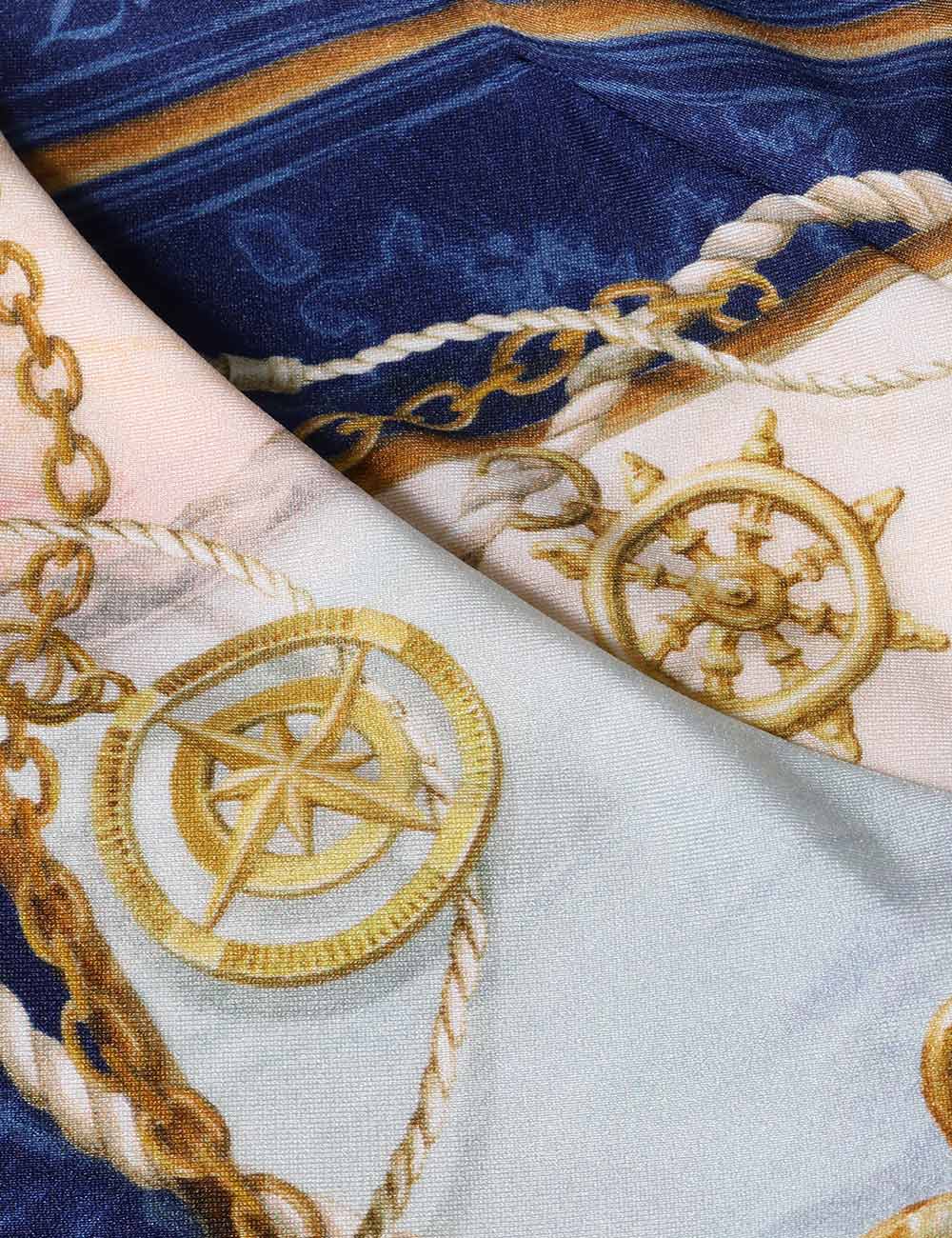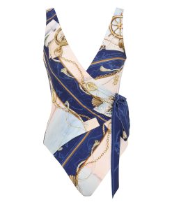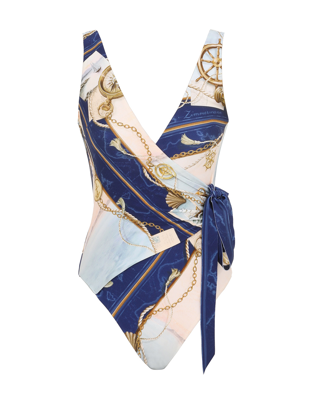 The Scarborough Wrap 1PC in Navy Nautical Map from our Summer Swim 2025 Collection. A lycra one piece featuring a plunging V-neckline, low back design and side tie wrap feature. one piece swimsuit with shiny finish, bow tie detail at left hand side, deep v-neckline and back, placement print throughout, thick shoulder straps, medium coverage, lined