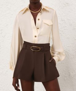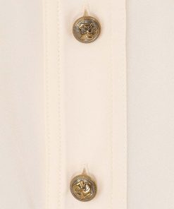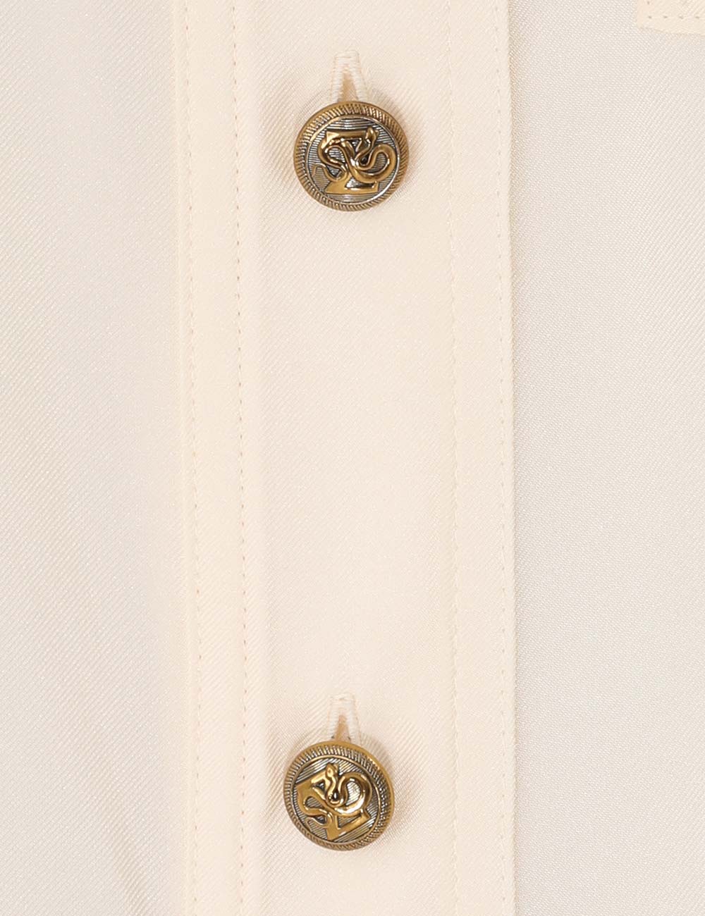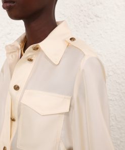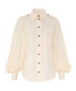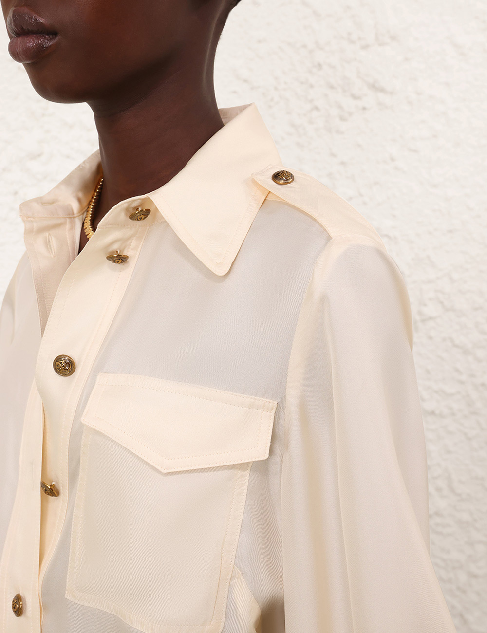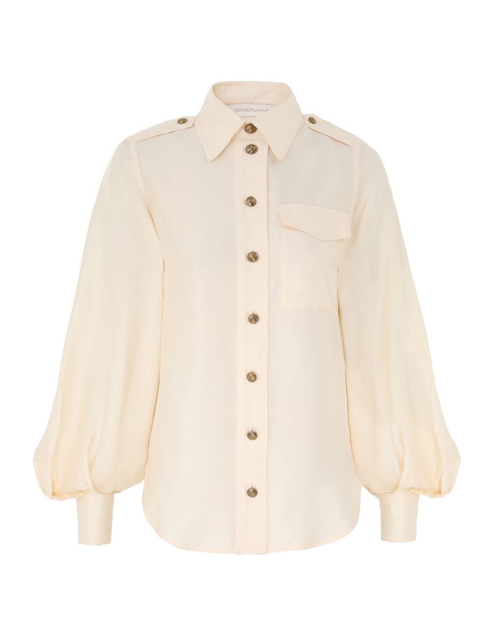 The Utility Shirt in Cream from our Fall 2025 Collection, Hypnotic. A silk shirt featuring a classic collar, long gathered sleeves, and gold buttons down the centre front placket.100% silk fabric, relaxed shirt with classic collar, centre front placket with functional gold buttons, chest flap pocket on front left side, long, loose sleeves gathered into fitted cuffs, gold button detailing at shoulders and cuffs
