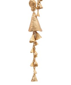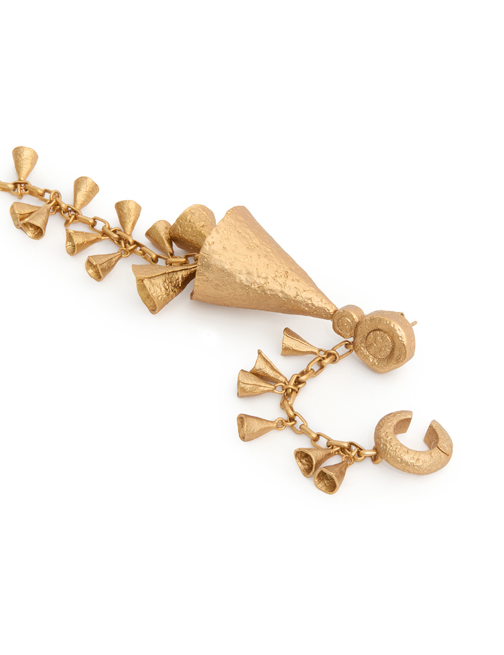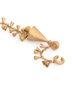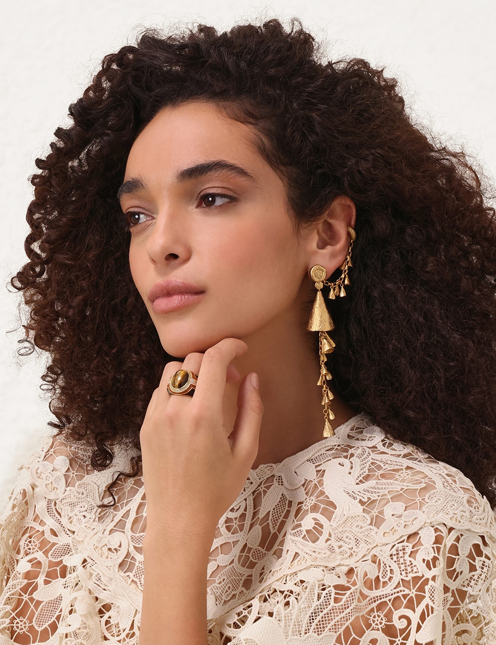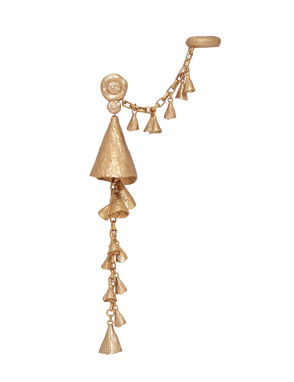 The Whimsy Single Earcuff in Antique Gold from our Fall 2025 Collection, Hypnotic. A gold plated earcuff featuring alternating charms throughout. 14kt gold plated brass earcuff, delicate hammered charms with surface textures, stud post back, designed to be worn on the left ear