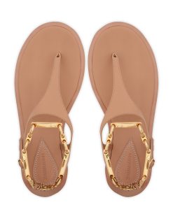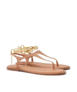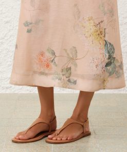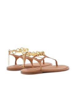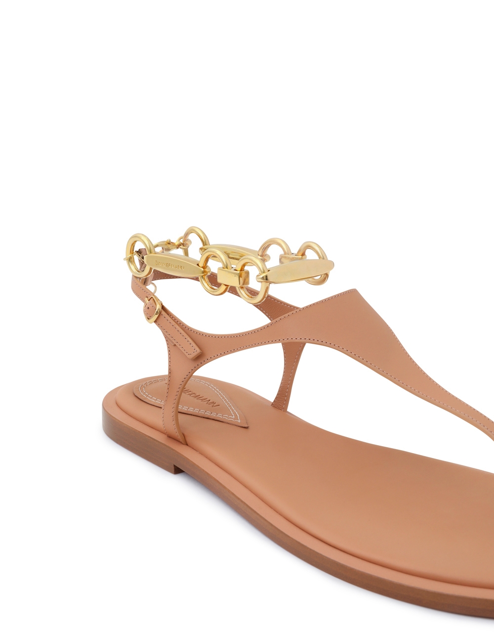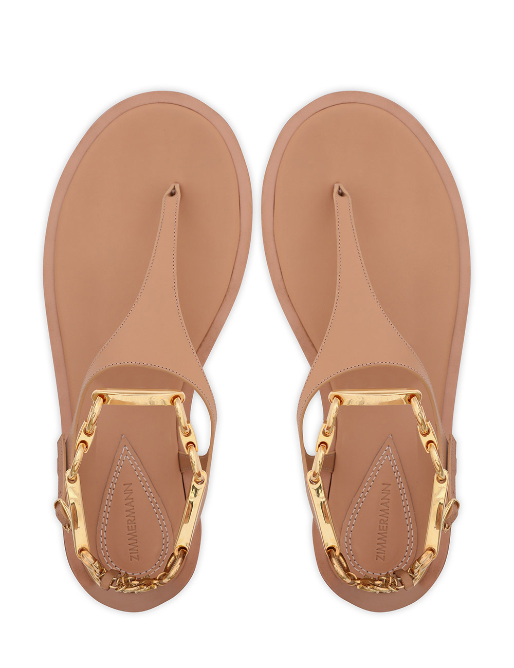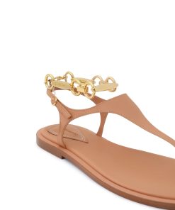 The Wild Sandal in Caramel from our Spring 2025 Collection, Illumination. A leather sandal featuring a round toe and removable branded anklet hardware. thong style leather straps, made in italy, round toe, branded anklet hardware, leather upper and outsole, 10mm heel