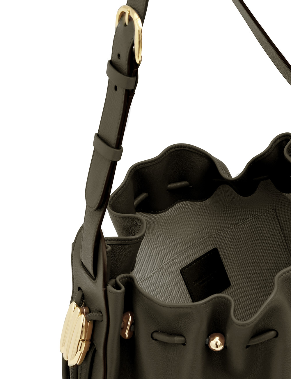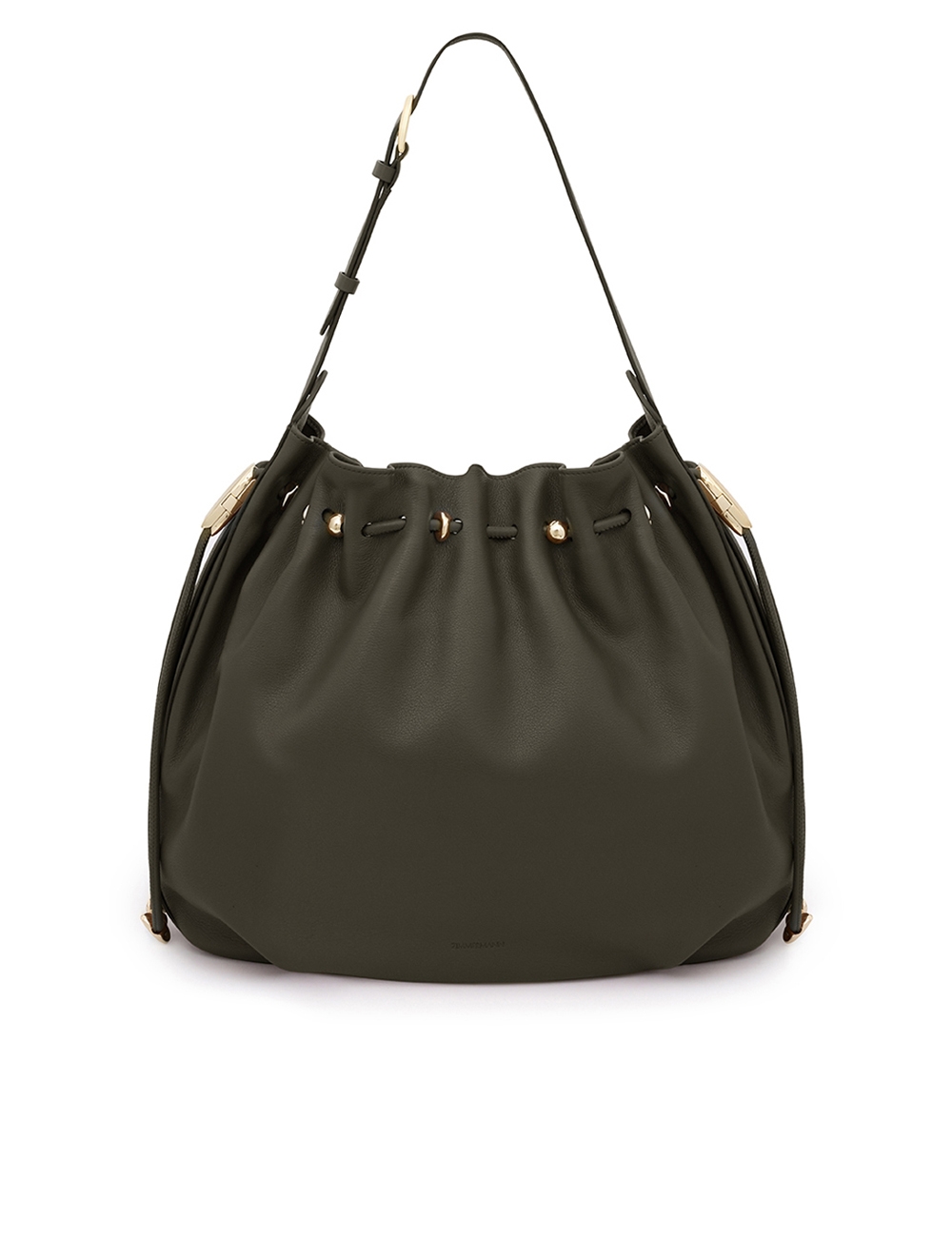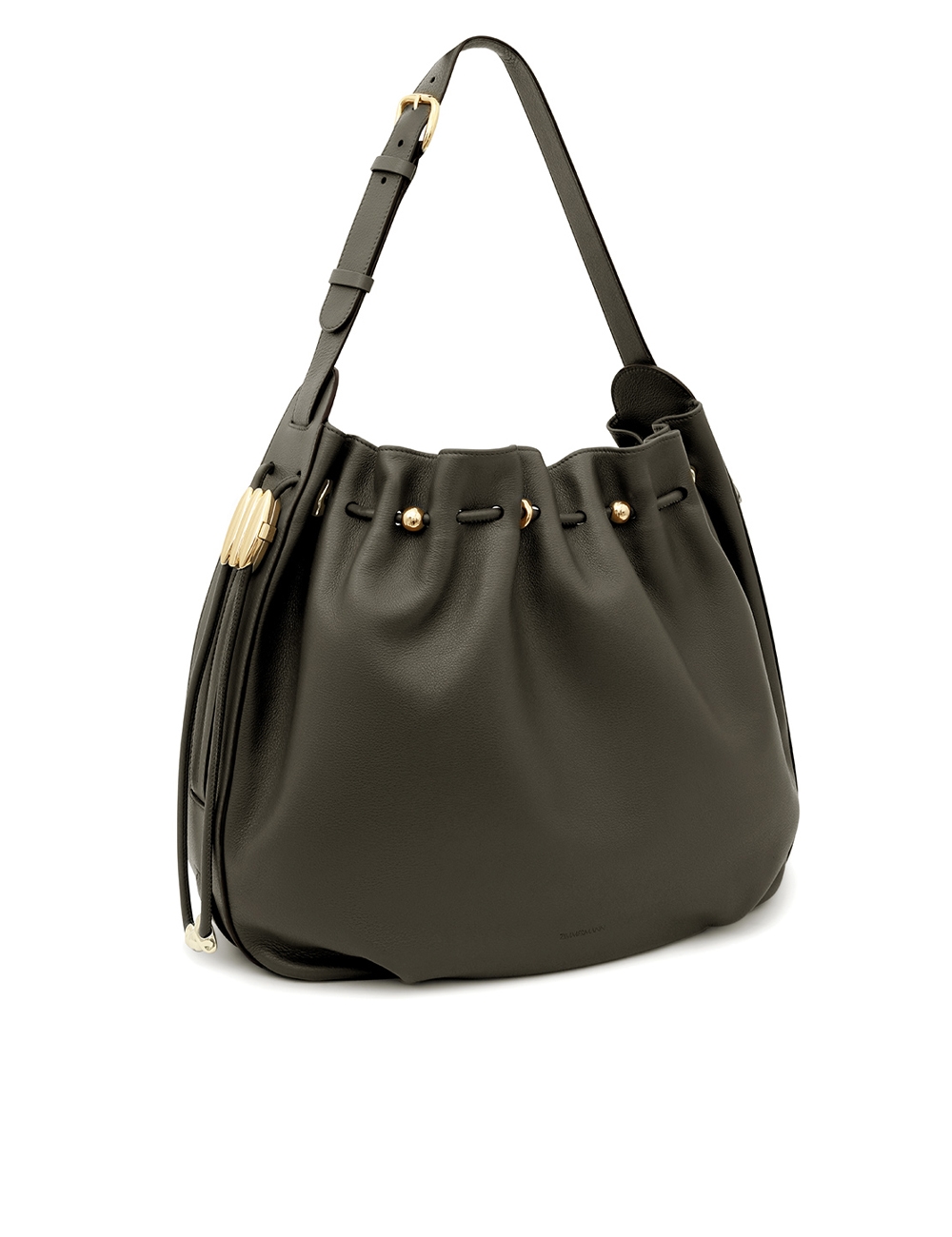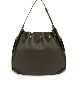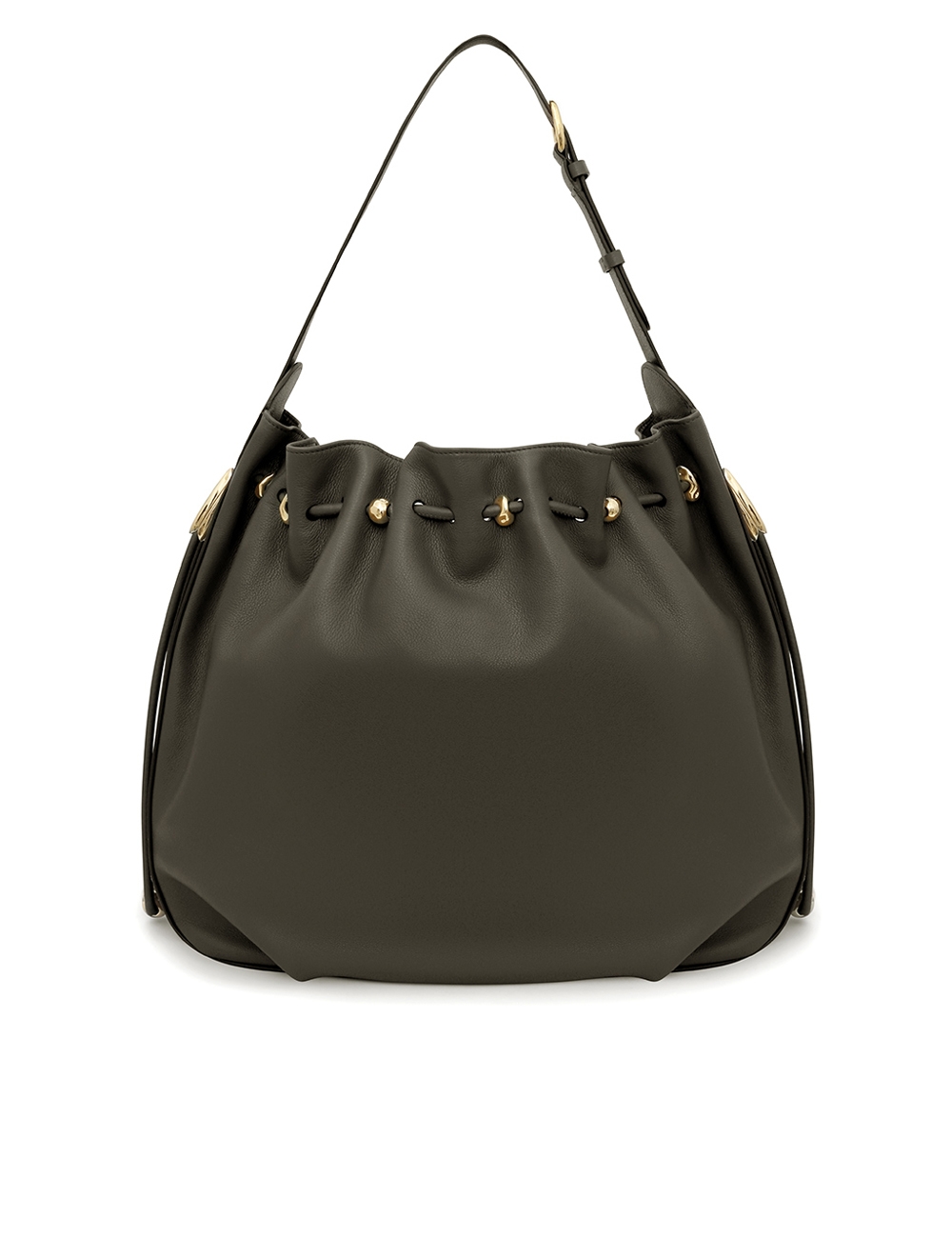 The Halcyon Large Bucket is defined by its ruched silhouette, complemented by decorative gold beads that evoke pebbles collected on the shore. Crafted from soft calfskin leather, it marries a timeless elegance with modern practicality, offering a spacious interior compartment designed to perfectly accommodate a laptop. soft calfskin leather, cotton canvas lining, shoulder-carry, adjustable buckle strap, internal slip pocket, made in italy