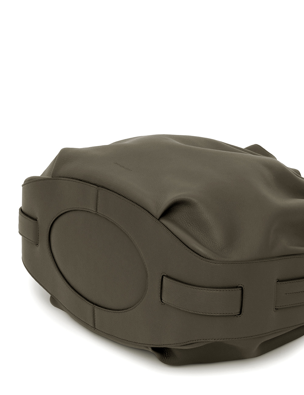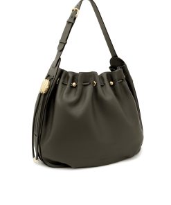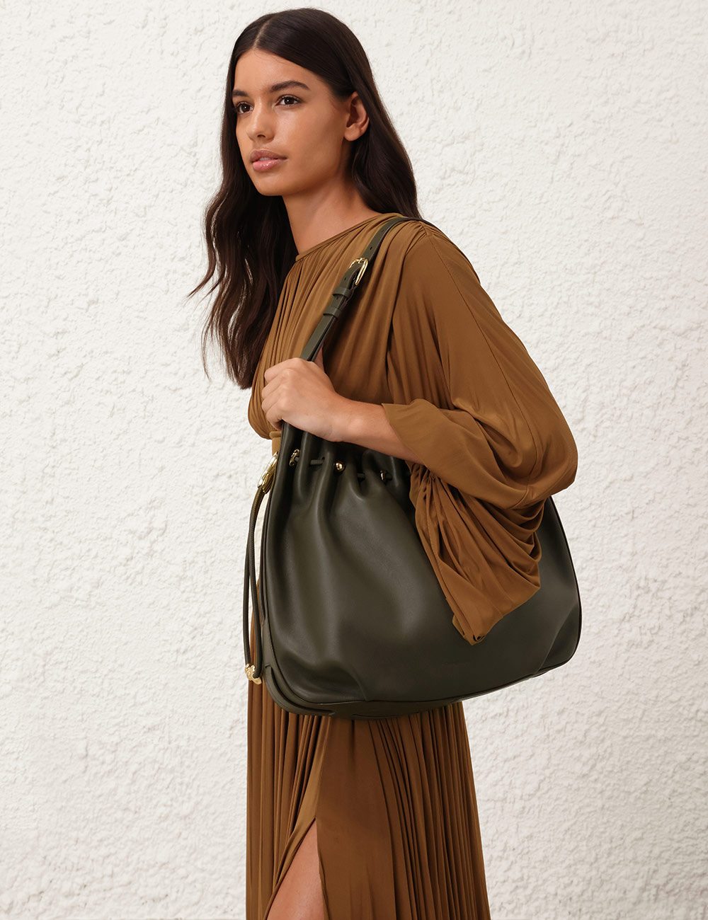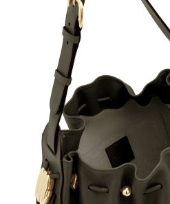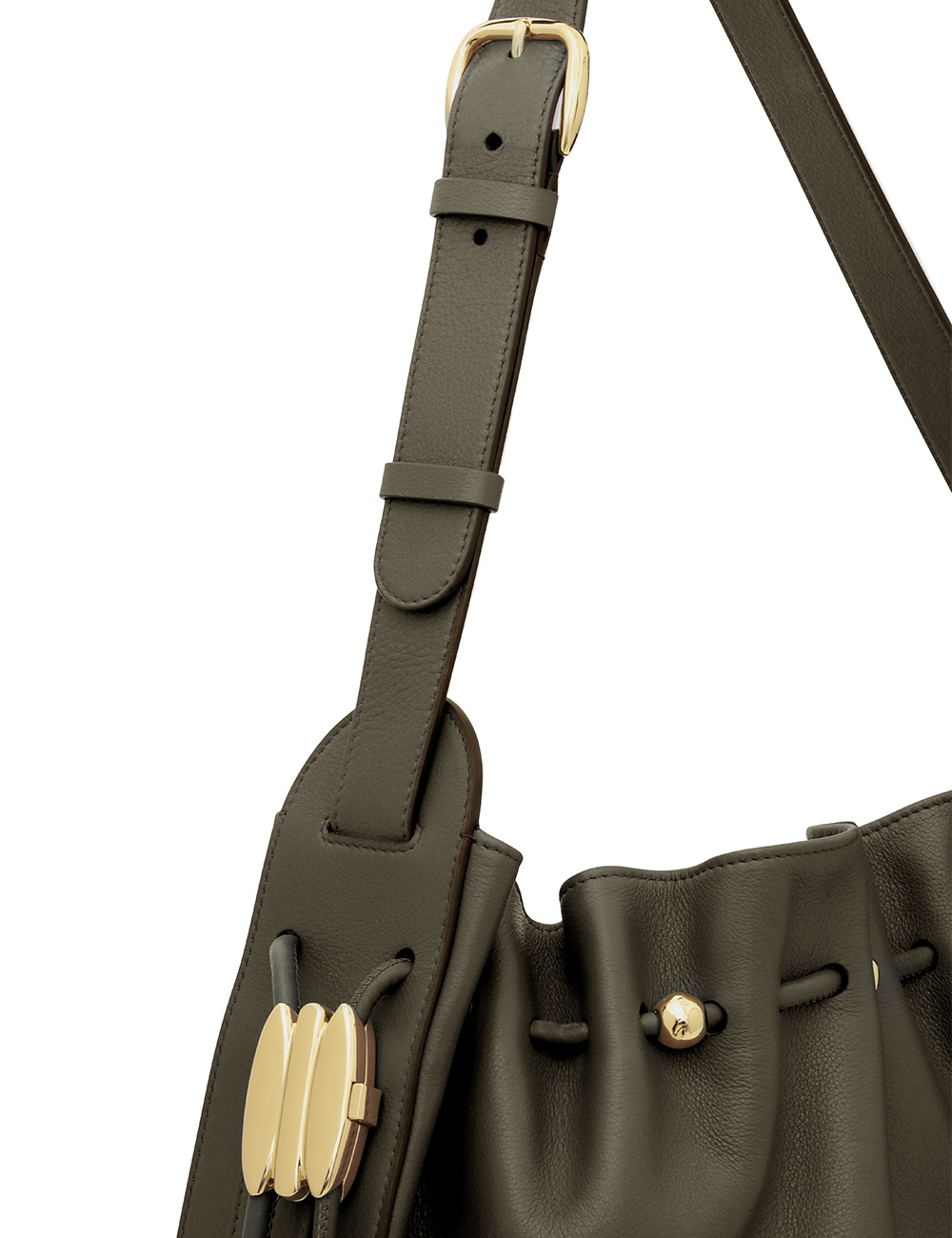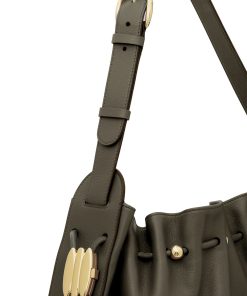 The Halcyon Large Bucket is defined by its ruched silhouette, complemented by decorative gold beads that evoke pebbles collected on the shore. Crafted from soft calfskin leather, it marries a timeless elegance with modern practicality, offering a spacious interior compartment designed to perfectly accommodate a laptop. soft calfskin leather, cotton canvas lining, shoulder-carry, adjustable buckle strap, internal slip pocket, made in italy