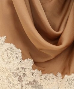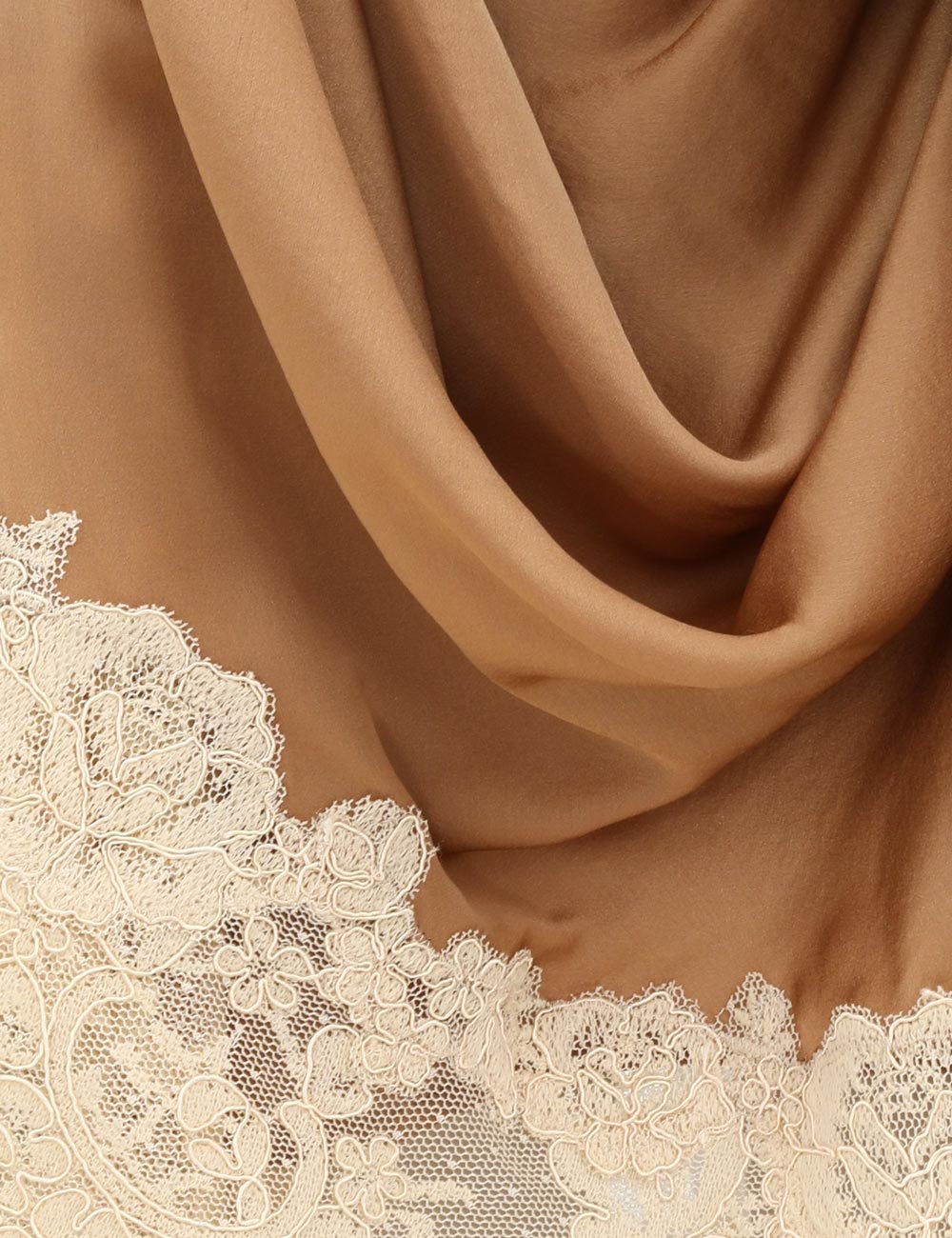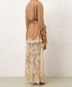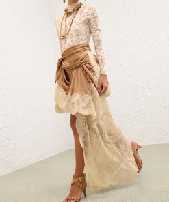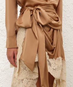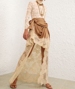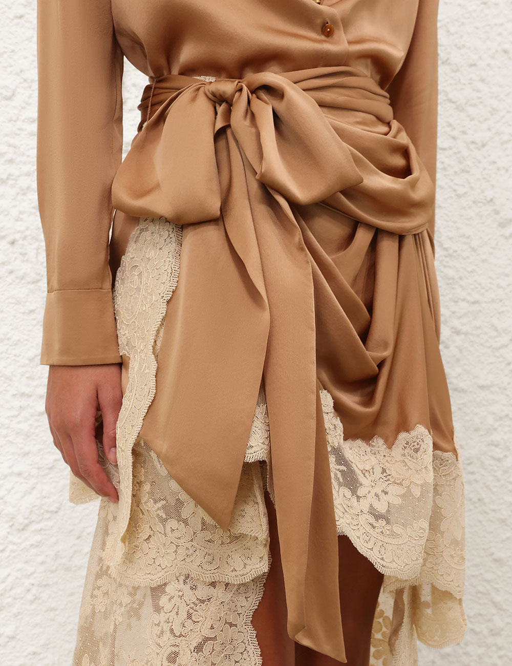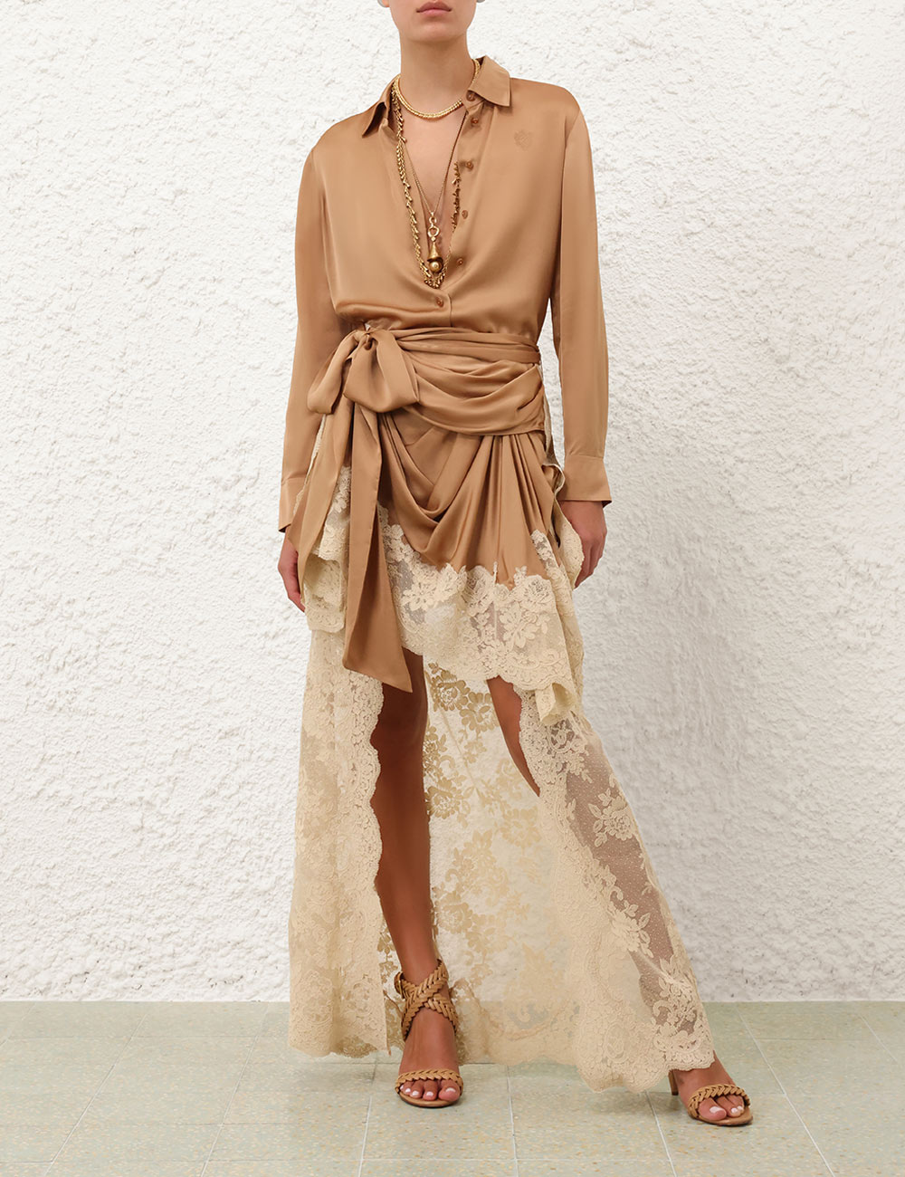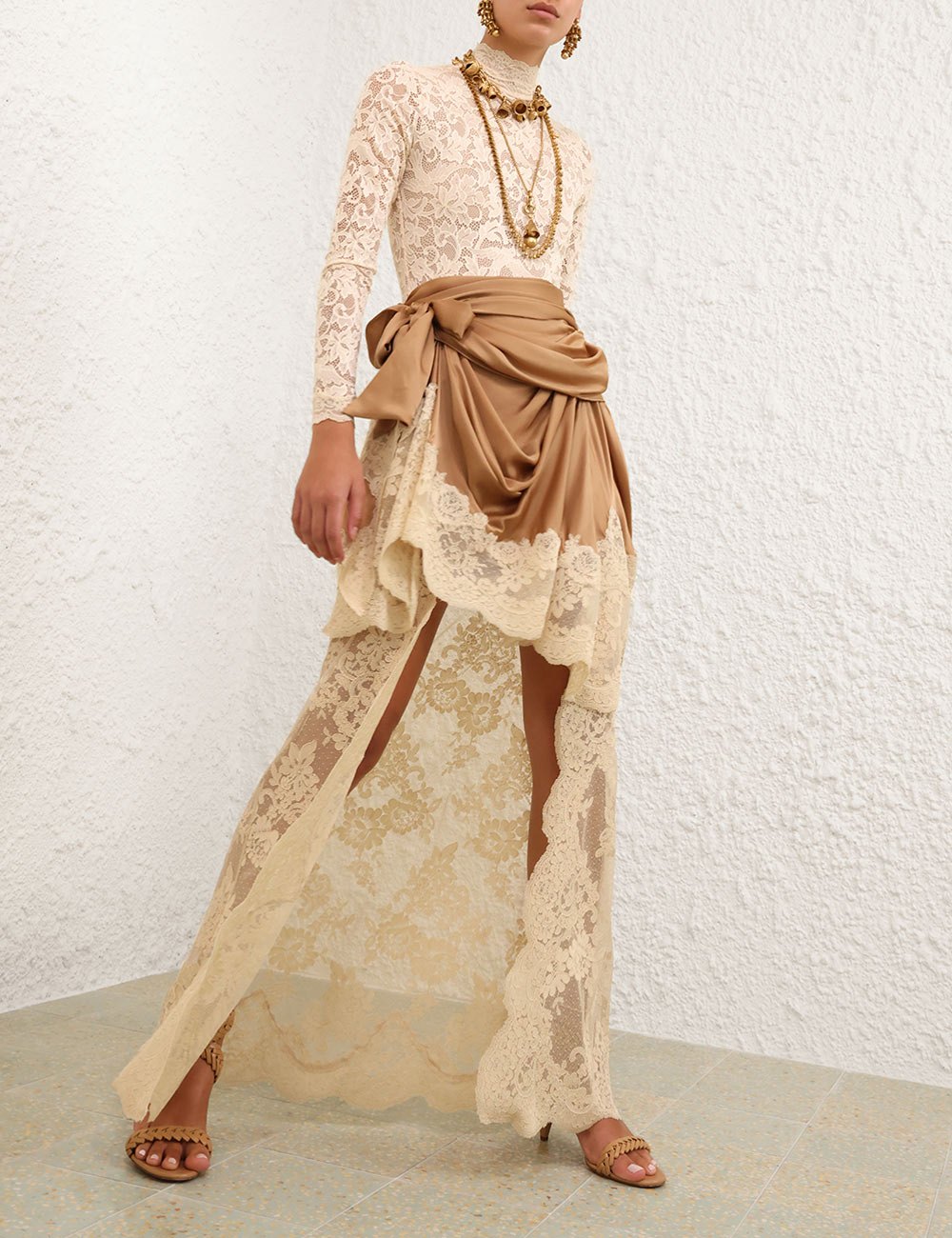 The Hypnotic Satin Drape Skirt in Biscuit from our Fall 2025 Collection, Hypnotic. A silk satin skirt featuring layers of draped silk and full-length lace. 100% silk fabric, lace trim along hem, self-tie waist belt, centre back invisible zip closure