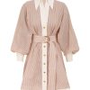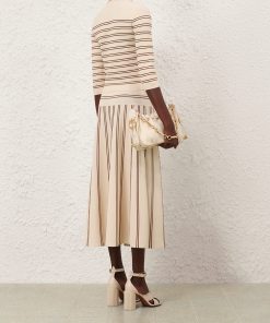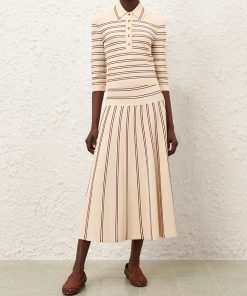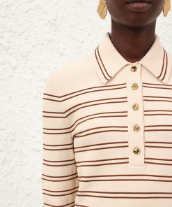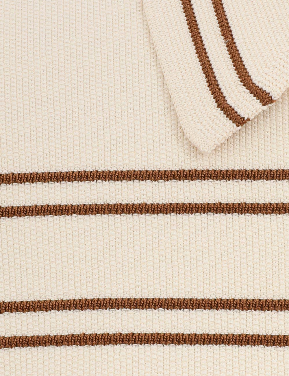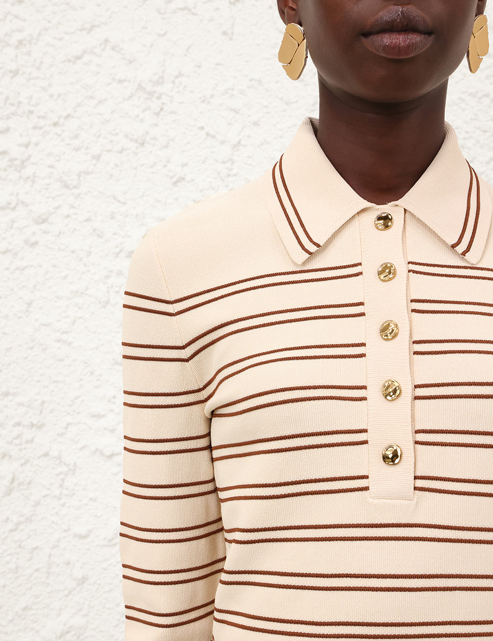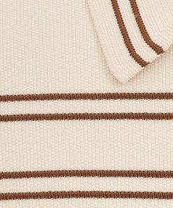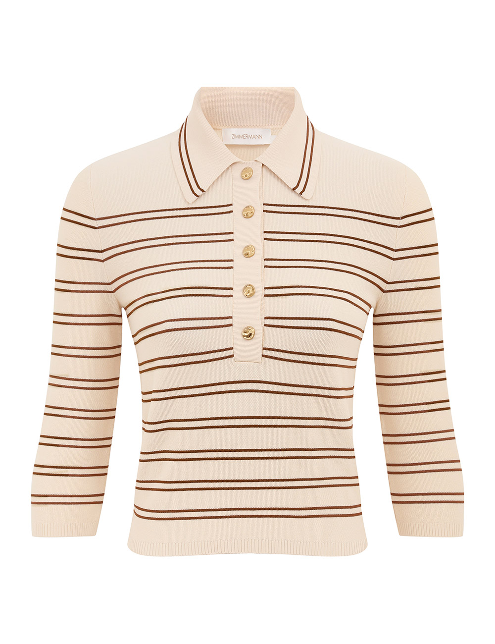 The Hypnotic Stripe Polo in Cream/Tan from our Fall 2025 Collection, Hypnotic. A knit polo top featuring a classic collar and buttons down the top front opening.three-quarter length sleeves, contrast stripes and piping along collar, gold button detailing at centre front