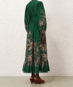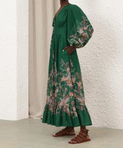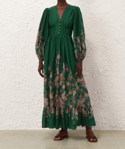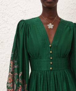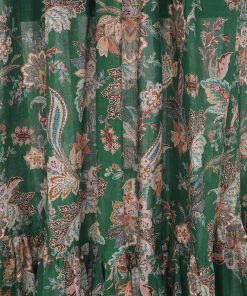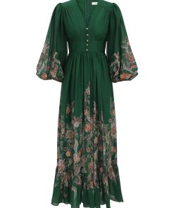 The Rhiannon Plunge Maxi Dress in Green Multi Paisley from our Summer Swim 2025 Collection. A cotton maxi dress featuring a plunging V-neckline, billow sleeves with elasticated cuffs and a gathered waist, finished with a flowing skirt style. 100% cotton fabric, button front top closure, billowed sleeves with gathered cuffs for versatile sleeve length, fitted waistband with gathered frill hem skirt, invisible zip closure at centre back, side front pockets, comes with separate slip