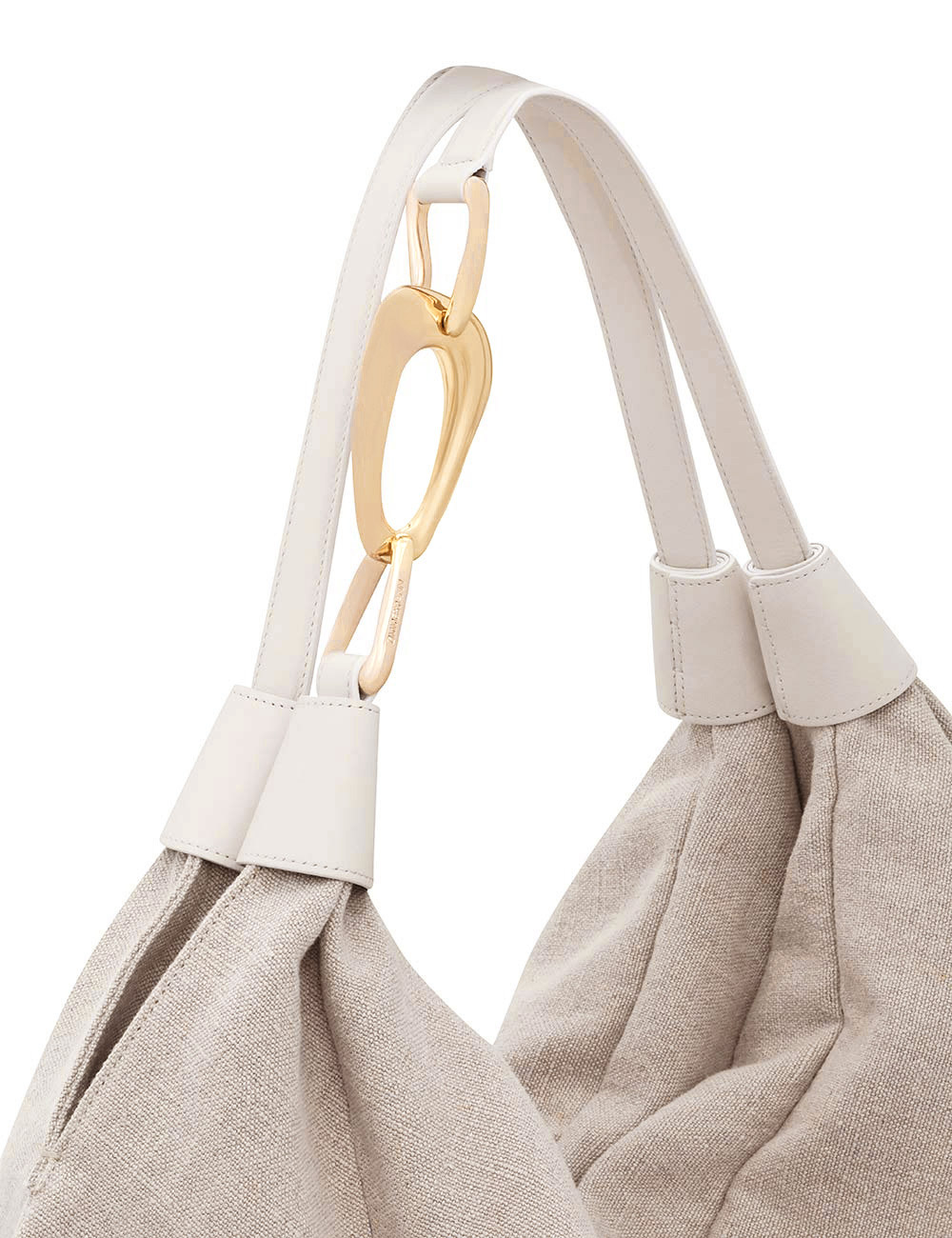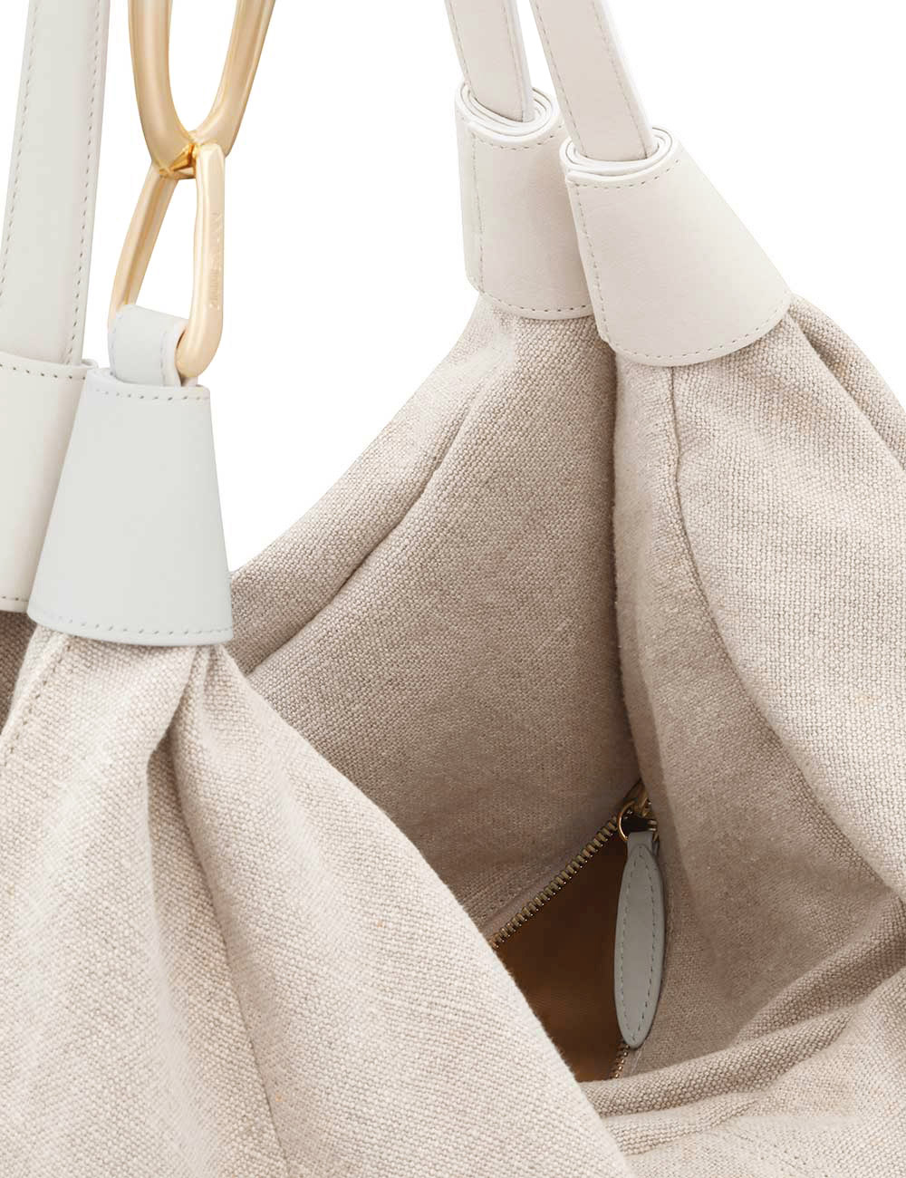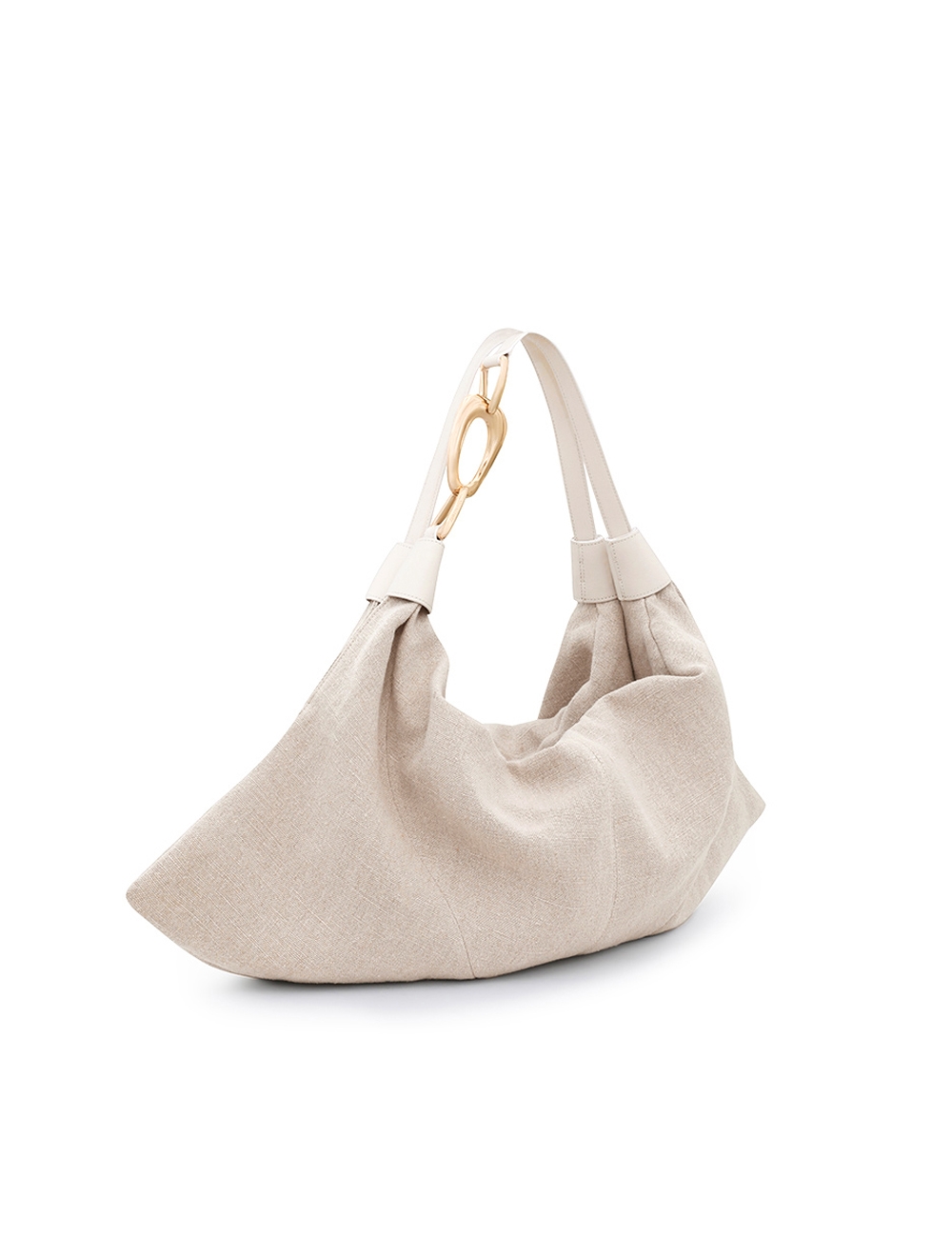 Inspired by the softness of a scarf, the Trampoline Hobo creates a supple, modern draping effect that embraces the body. Its relaxed silhouette is elevated by soft-grained leather handles and a bespoke organic chain-link hardware. Part of the Trampoline line, it blends natural texture with modern elegance, making it the perfect companion for everyday wear. linen canvas, cotton drill lining, shoulder-carry, double-zip closure, internal slip pocket, made in romania