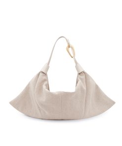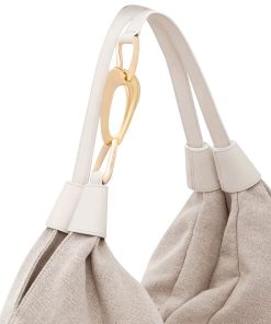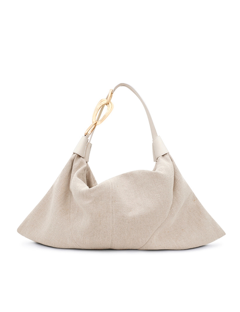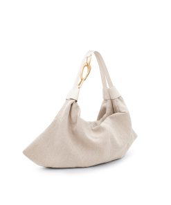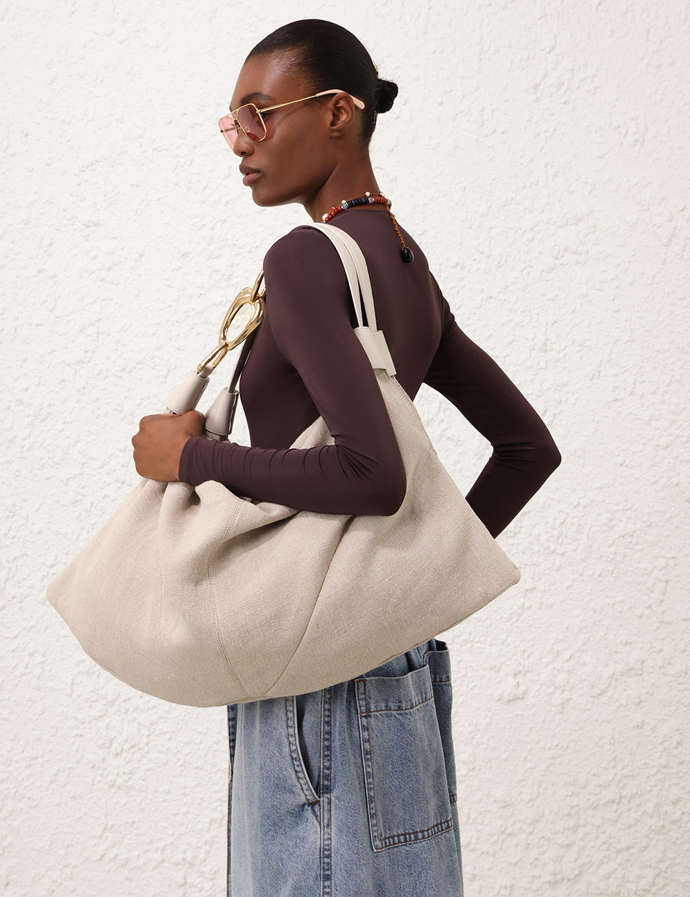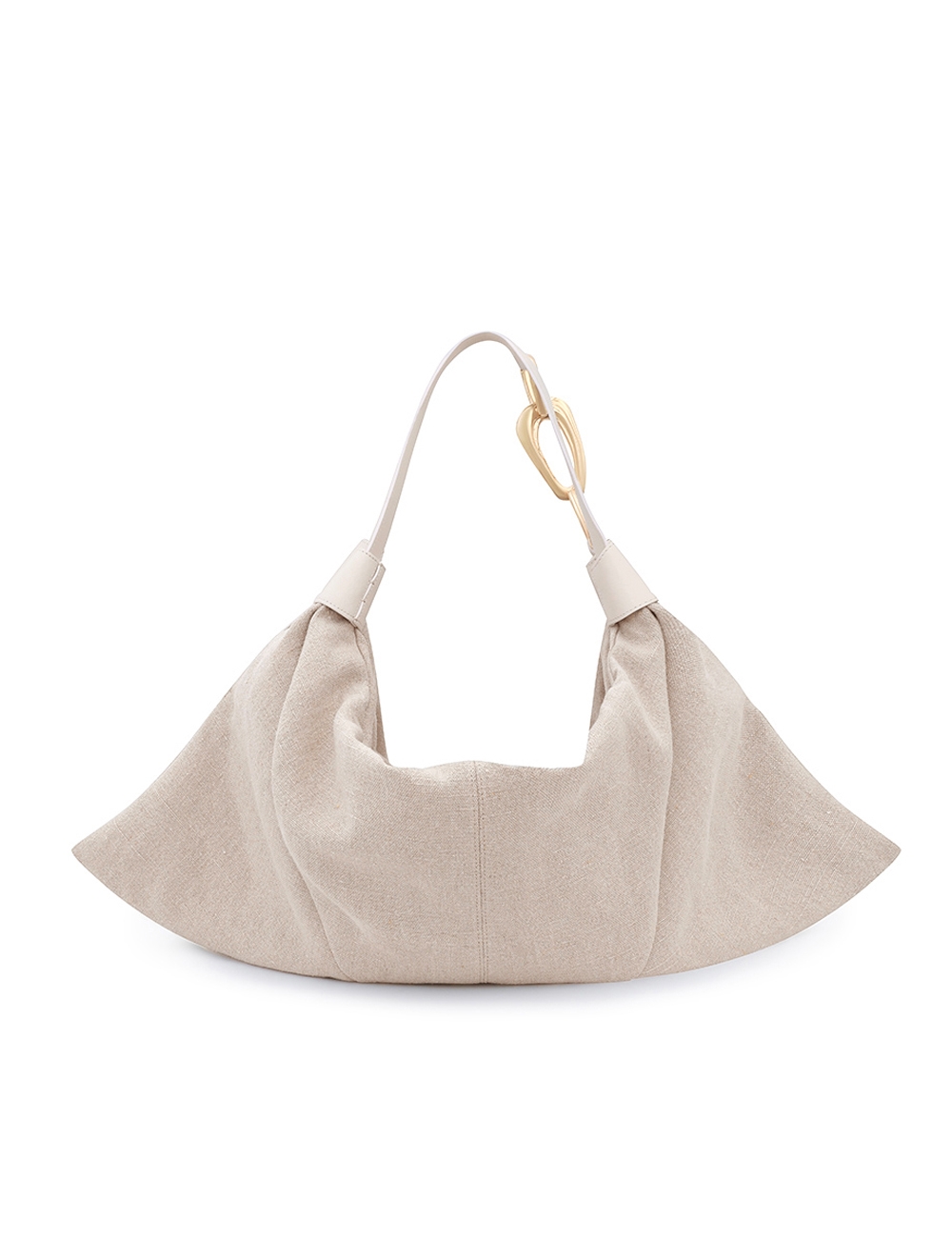 Inspired by the softness of a scarf, the Trampoline Hobo creates a supple, modern draping effect that embraces the body. Its relaxed silhouette is elevated by soft-grained leather handles and a bespoke organic chain-link hardware. Part of the Trampoline line, it blends natural texture with modern elegance, making it the perfect companion for everyday wear. linen canvas, cotton drill lining, shoulder-carry, double-zip closure, internal slip pocket, made in romania