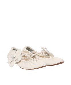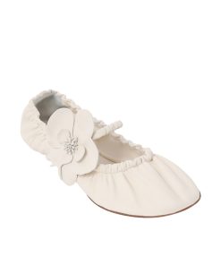 The Zimmermann Orchid Ballerina in Macadamia from our Spring 2024 Collection, Natura. A leather ballerina shoe featuring a statement orchid flower design and a soft round toe. leather ballerina, made in italy, leather orchid flower design, soft round toe