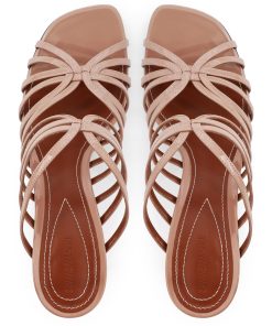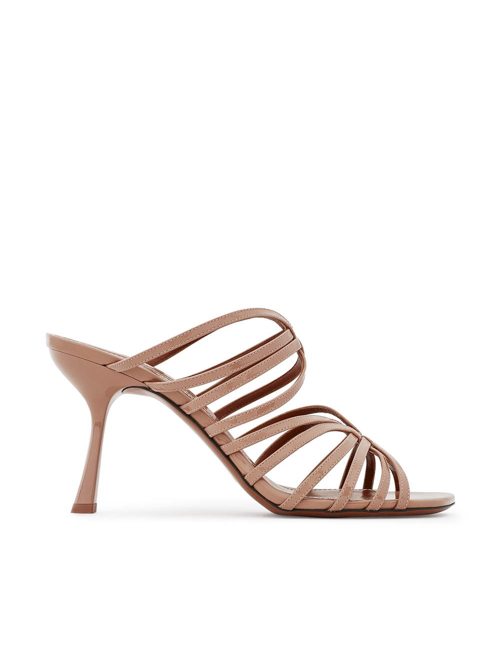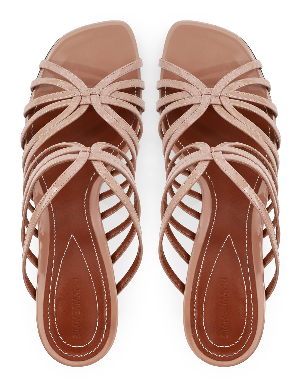 The Zimmermann Aura Mule Sandal 85 in Peach from our Spring 2024 Collection, Natura. A leather mule sandal featuring a stiletto heel and a soft square toe. leather stiletto mule sandal, made in italy, soft square toe, 85mm stiletto heel