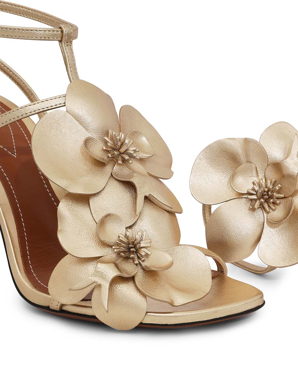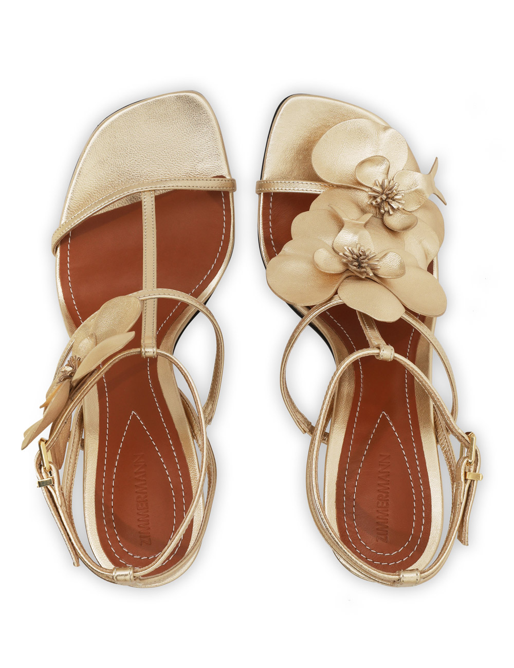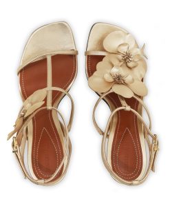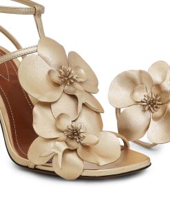 The Zimmermann Orchid Sandal 85 in Gold from our Spring 2024 Collection, Natura. A heeled sandal featuring a statement orchid flower design and metallic leather straps. made in italy, soft square toe, ankle strap with gold buckle hardware, 85mm heel
