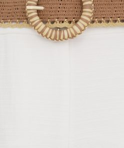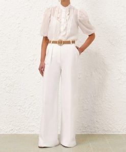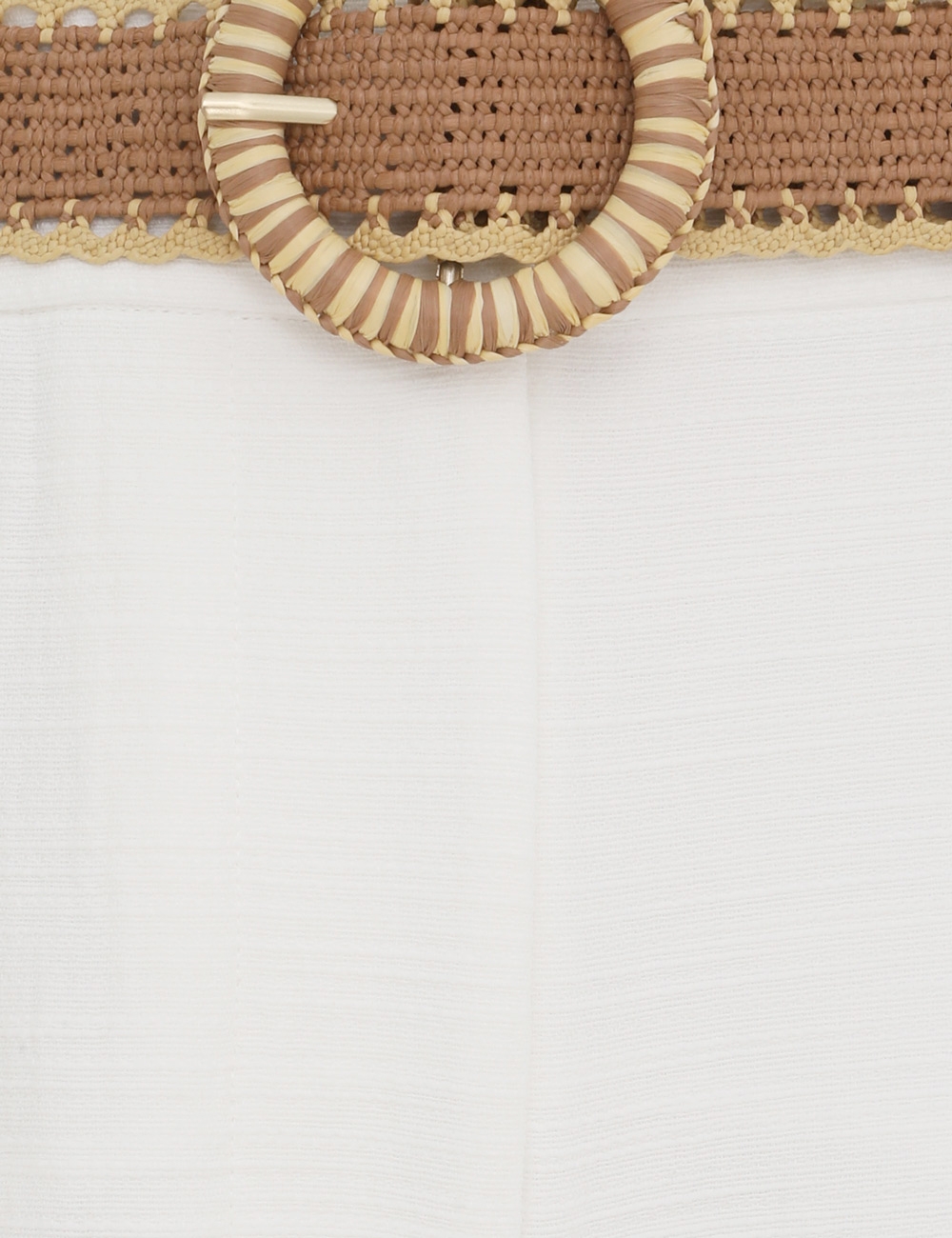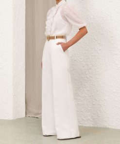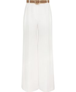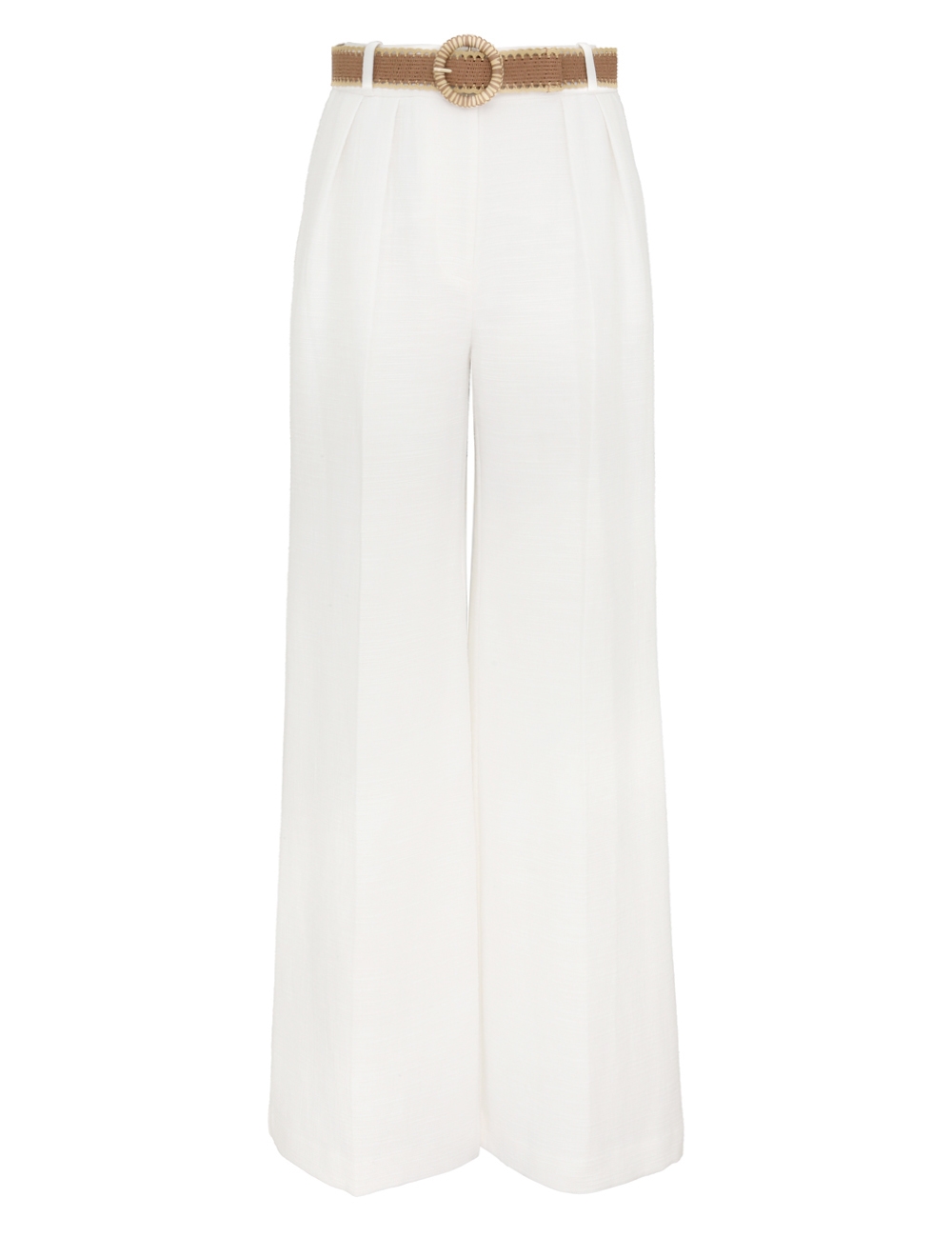 The Acacia Flare Pant in Ivory from our Resort Swim 2025 Collection. A high waisted linen pant featuring centre front leg tucks, side hip pockets and a removable raffia belt. linen wide leg pant, deep leg tuck, front zip closure, hook and bar closure on waistband, removable raffia belt