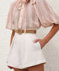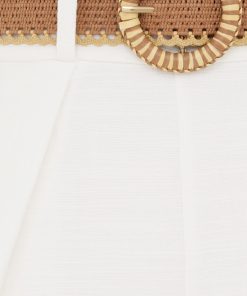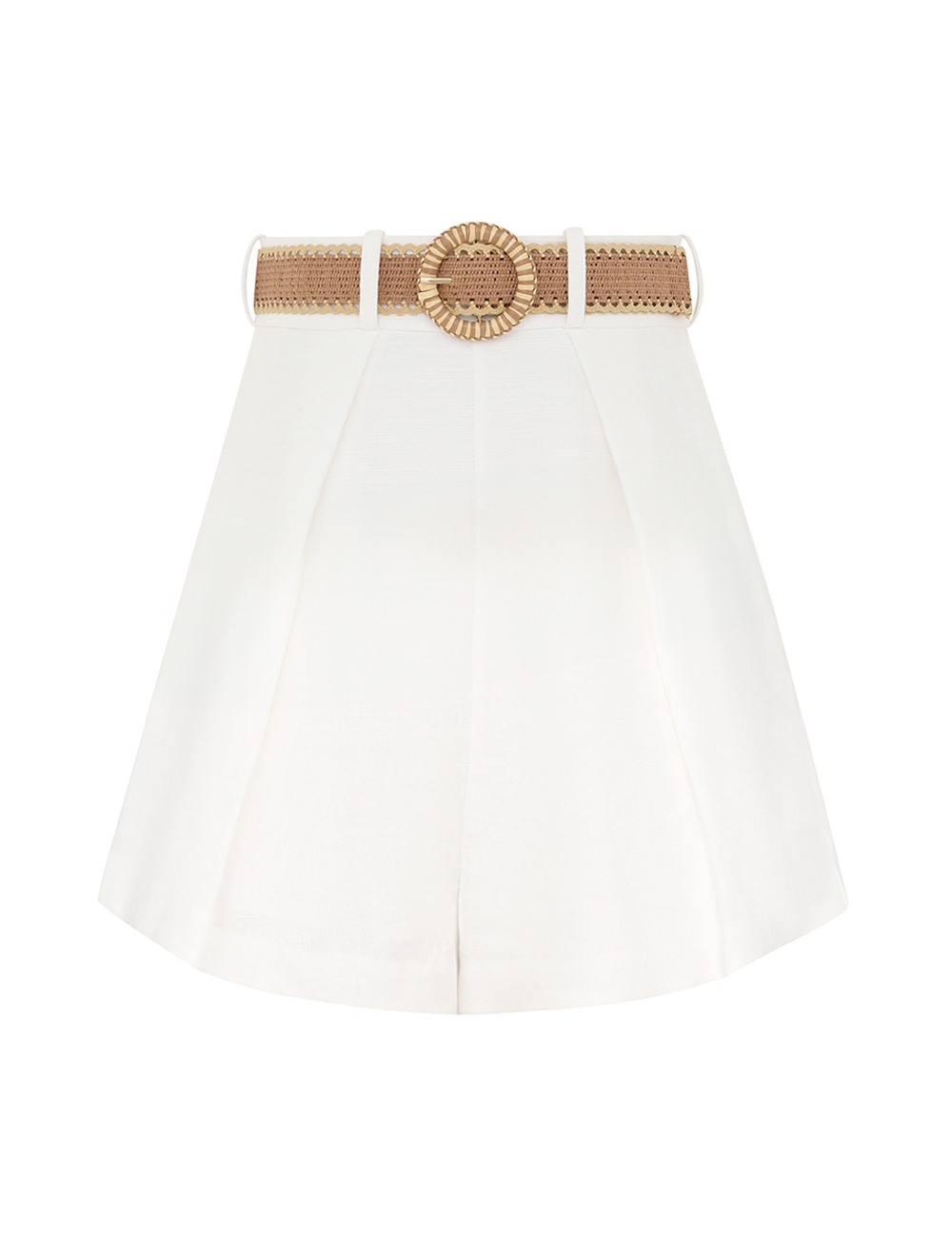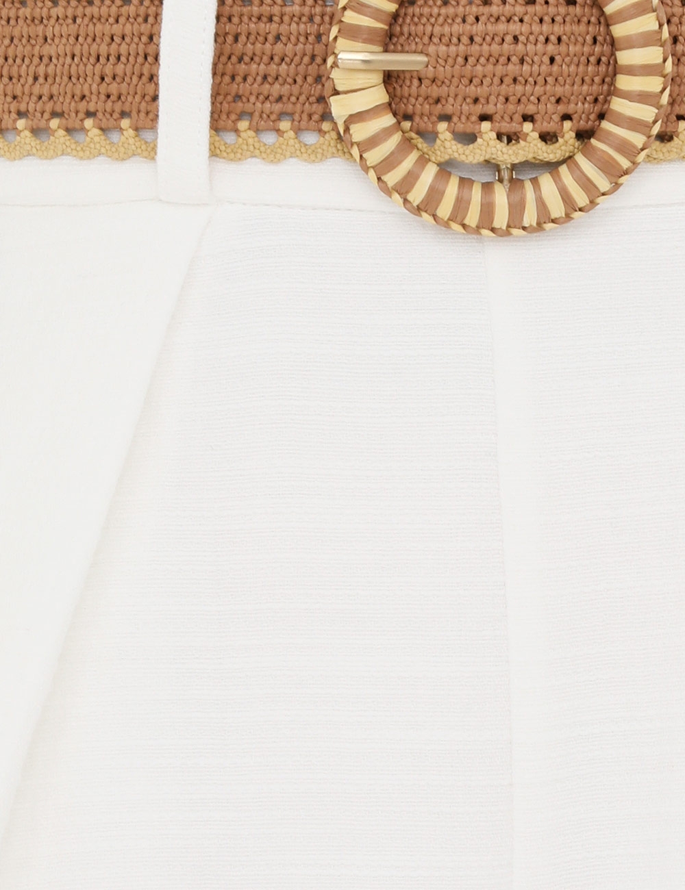 The Acacia Tuck Short in Ivory from our Resort Swim 2025 Collection. A high waisted linen short featuring side seam pockets and a raffia trim belt. linen high waisted short, side seam pockets, removable raffia buckle belt, tucks throughout, invisible zip at centre back