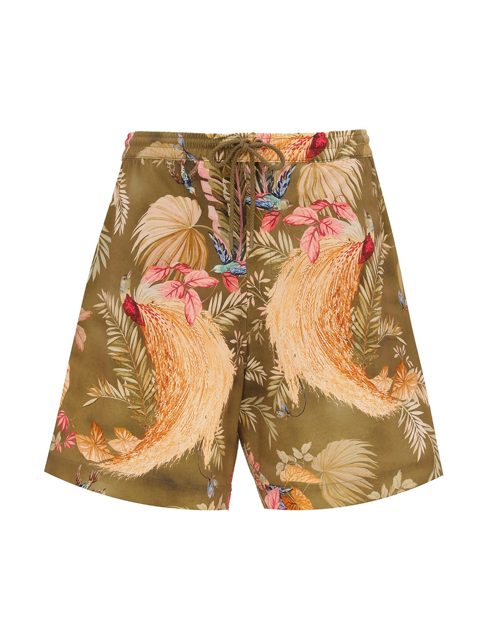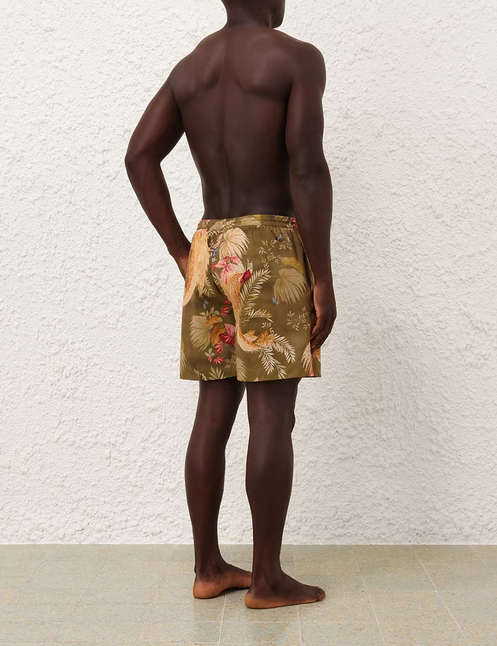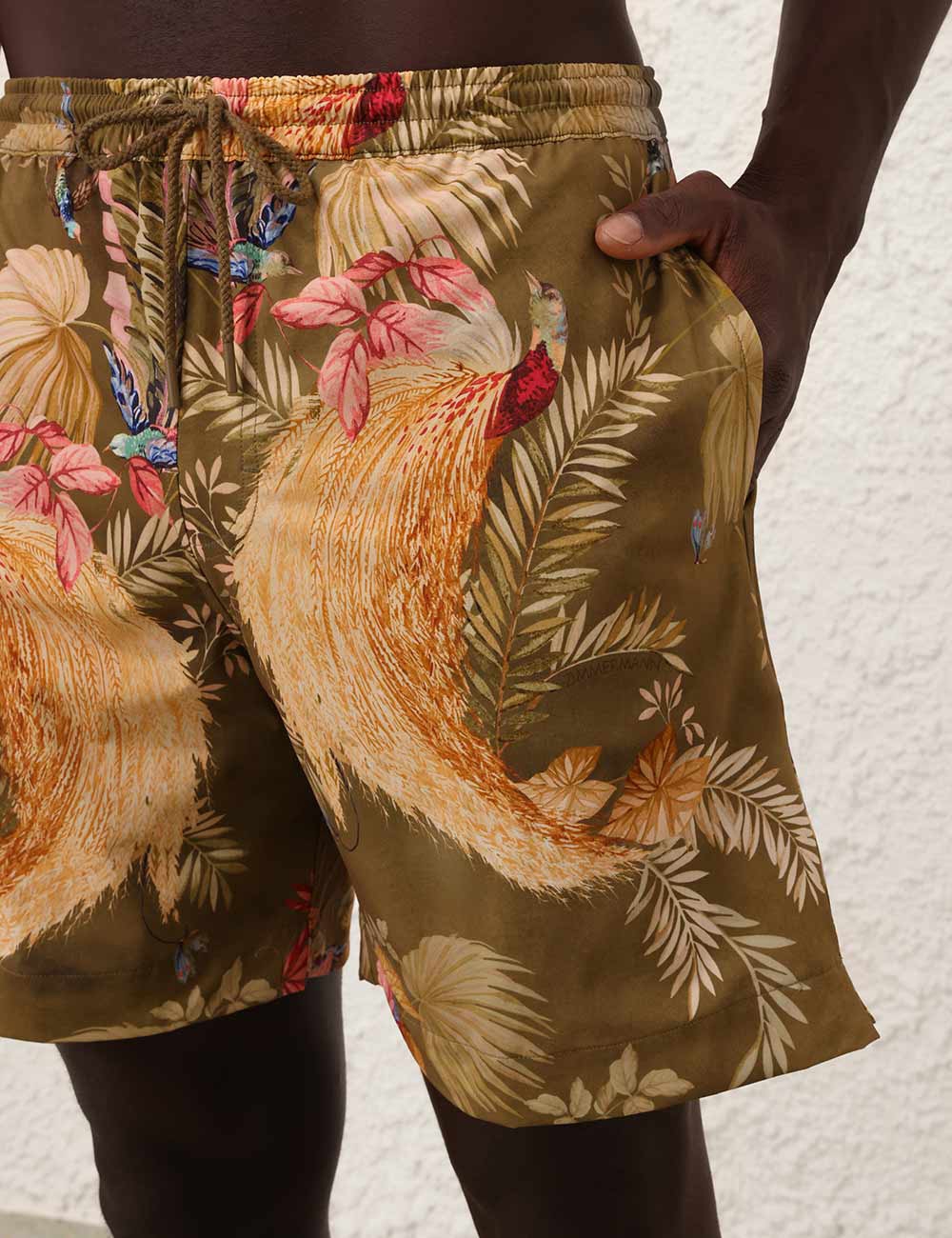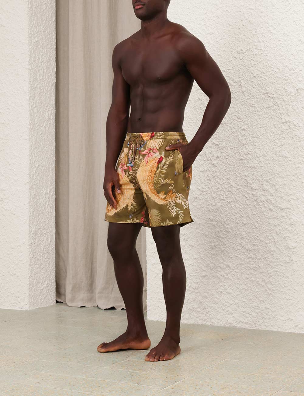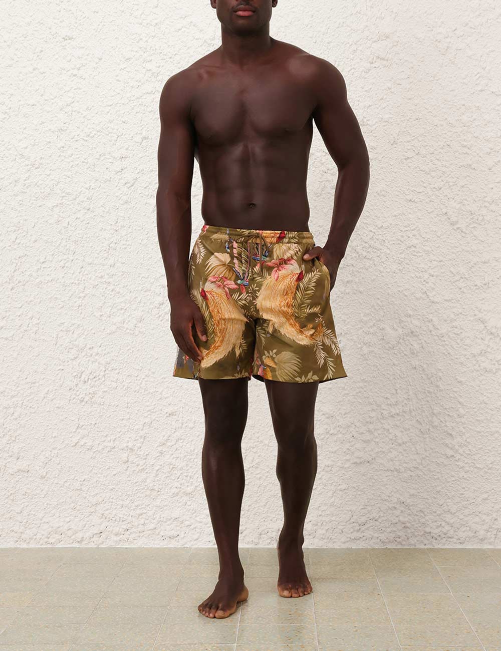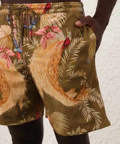 The Ascension Mens Boardshort in Khaki Palm Floral from our Summer Swim 2025 Collection. A printed boardshort with elasticated waistband, drawstring cord, seam pockets and inbuilt support mesh lining.relaxed boardshorts, elasticated waist with drawstring cord for flexible fit, side inseam pockets, mesh lining