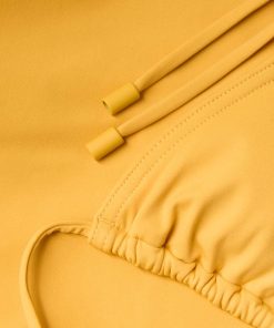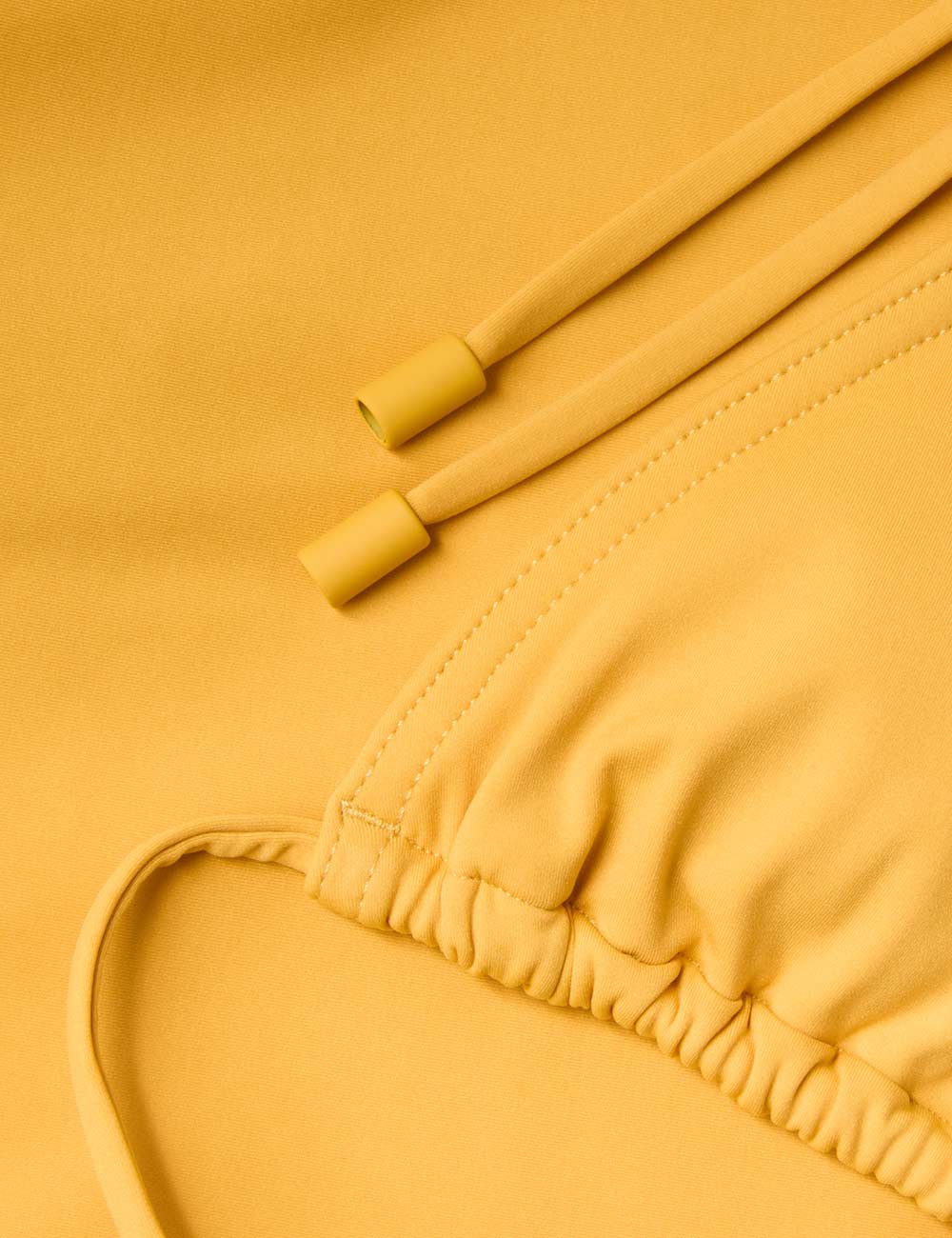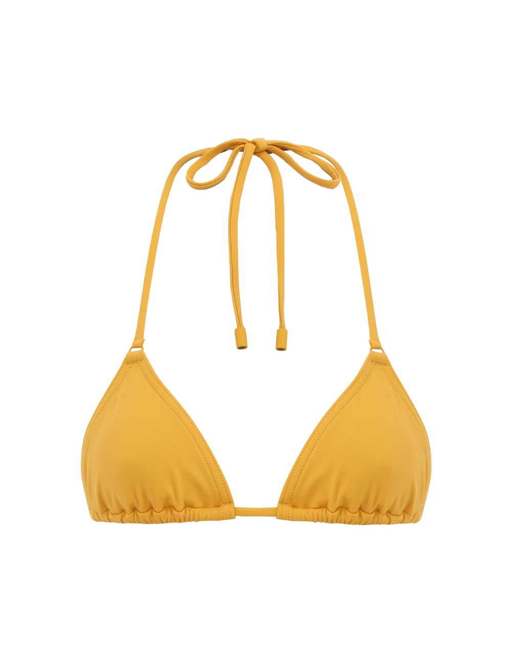 The Separates Mini Tri in Mango from our Summer Swim 2025 Collection. A triangle bikini top constructed from form-fitting Italian lycra featuring fully adjustable neck and under bust ties finished with toggle ends. italian lycra, mini triangle bikini top, self tie straps with toggle ends, adjustable cup placement, removable soft cups, top only, pant sold separately