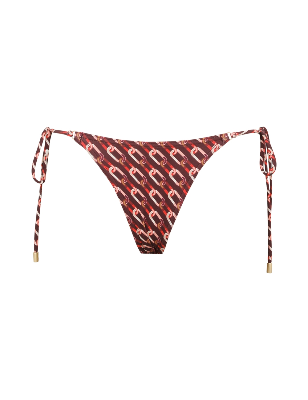 The Separates Mini Tri Pant in Burgundy Multi from our Summer Swim 2025 Collection. A skinny low rise bikini pant constructed from Italian lycra featuring self tie side straps. italian lycra, low rise, skinny bikini pant, adjustable self tie straps at both sides, matching toggle ends on straps, brief bottom coverage, pant only, bra sold separately