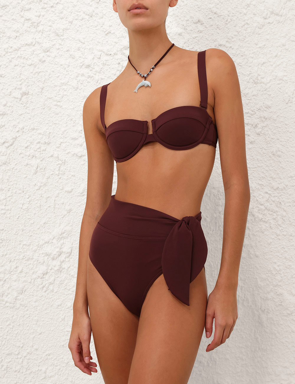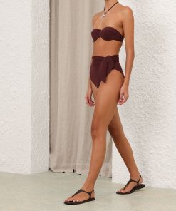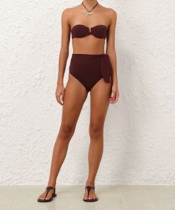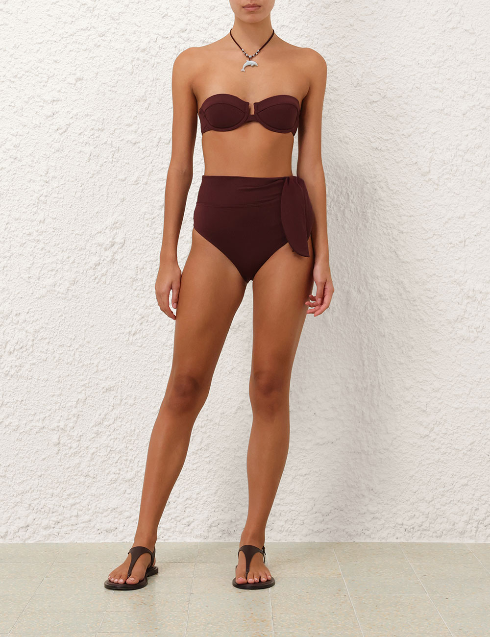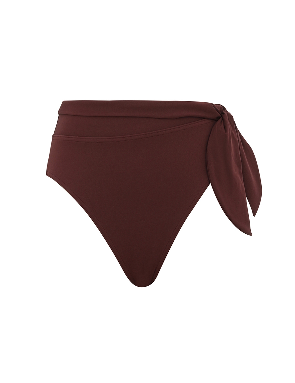 The Separates Scarf HW Pant in Chocolate from our Summer Swim 2025 Collection. A high waisted bikini pant constructed from form-fitting Italian lycra featuring a self-tie detail at the side waist. italian lycra, high waisted bikini pant, adjustable scarf tie detail at left side, high cut legline, medium coverage, pant only, bra sold separately